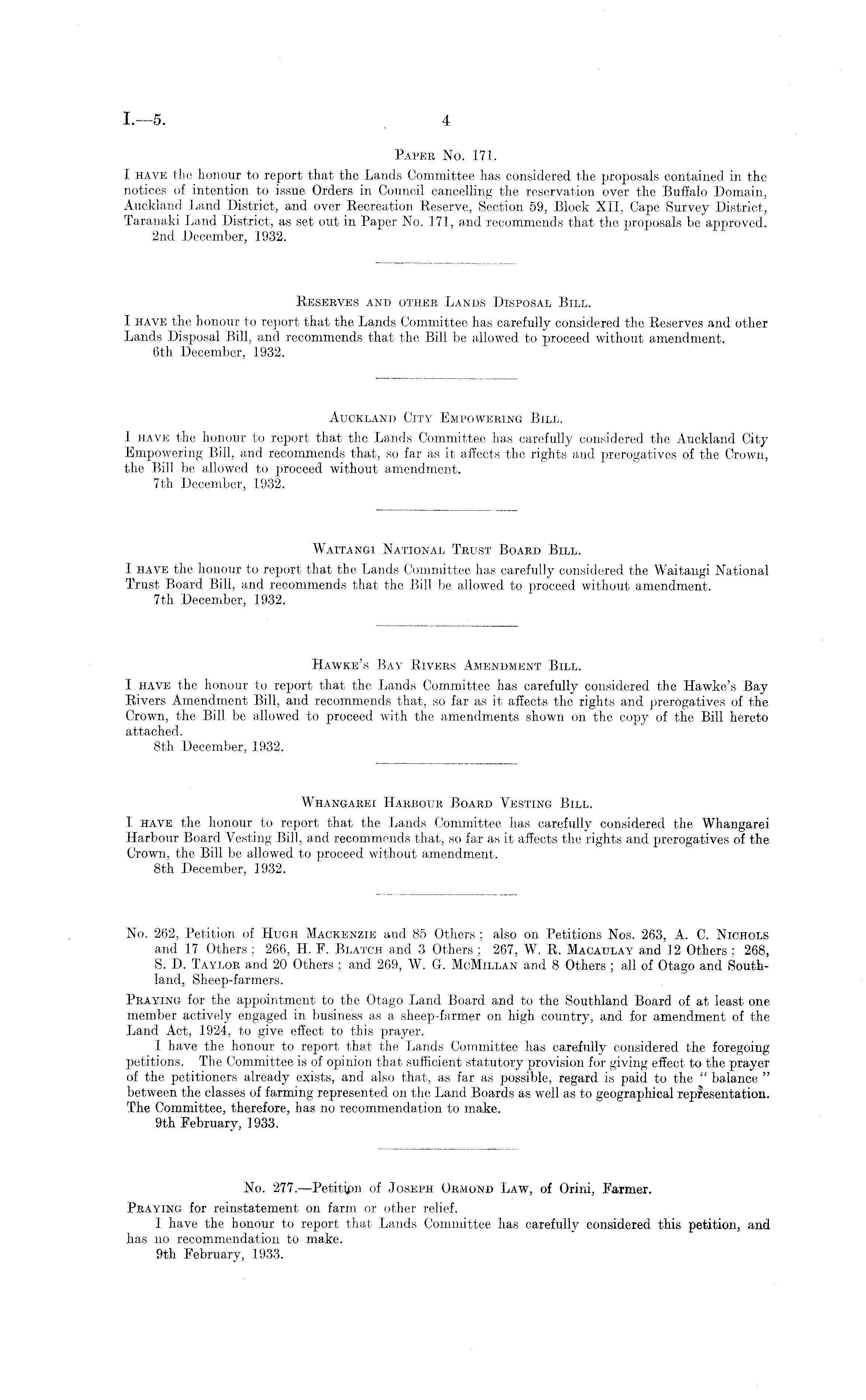 Reserves and other Lands Disposal Bill. Ī have the honour to report that the Lands Committee has carefully considered the Reserves and other Lands Disposal Bill, and recommends that the Bill be allowed to proceed without amendment. 6th December, 1932.