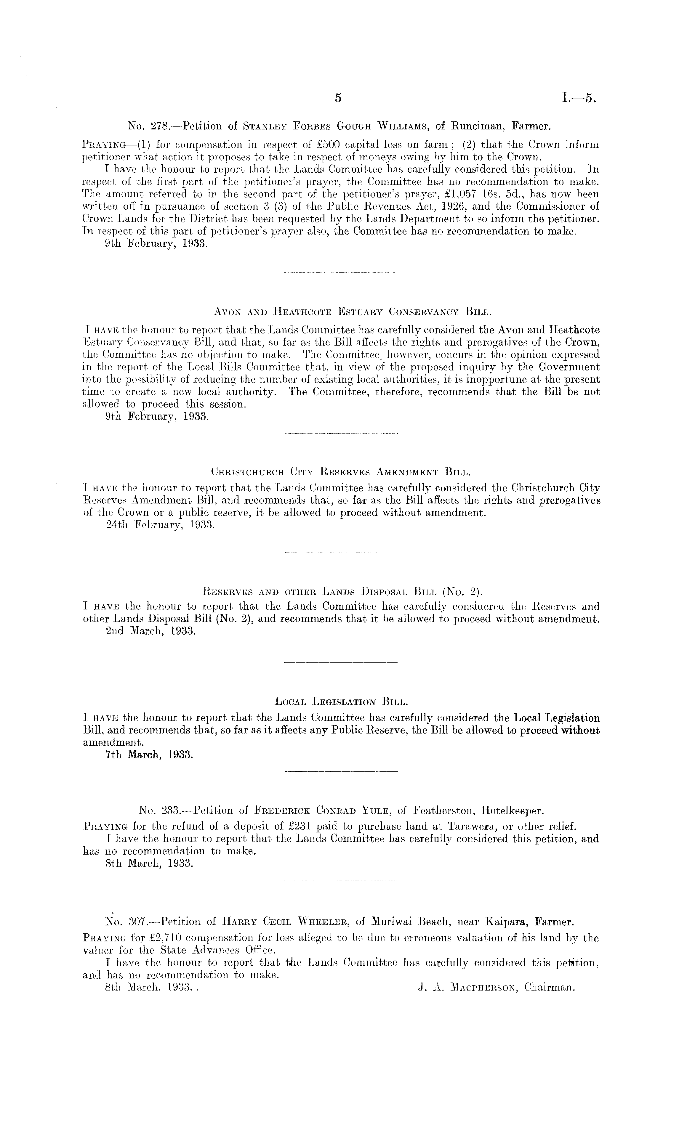 No. 278.—Petition of Stanley Forbes Cough Williams, of Runciman, Farmer. Praying—(l) for compensation in respect of £500 capital loss on farm ; (2) that the Crown inform petitioner what action it proposes to take in respect of moneys owing by him to the Crown. I have the honour to report that the Lands Committee has carefully considered this petition. In respect of the first part of the petitioner's prayer, the Committee has no recommendation to make. The amount referred to in the second part of the petitioner's prayer, £1,057 16s. 5d., has now been written off in pursuance of section 3 (3) of the Public Revenues Act, 1926, and the Commissioner of Crown Lands for the District has been requested by the Lands Department to so inform the petitioner. In respect of this part of petitioner's prayer also, the Committee has no recommendation to make. 9th February, 1933.