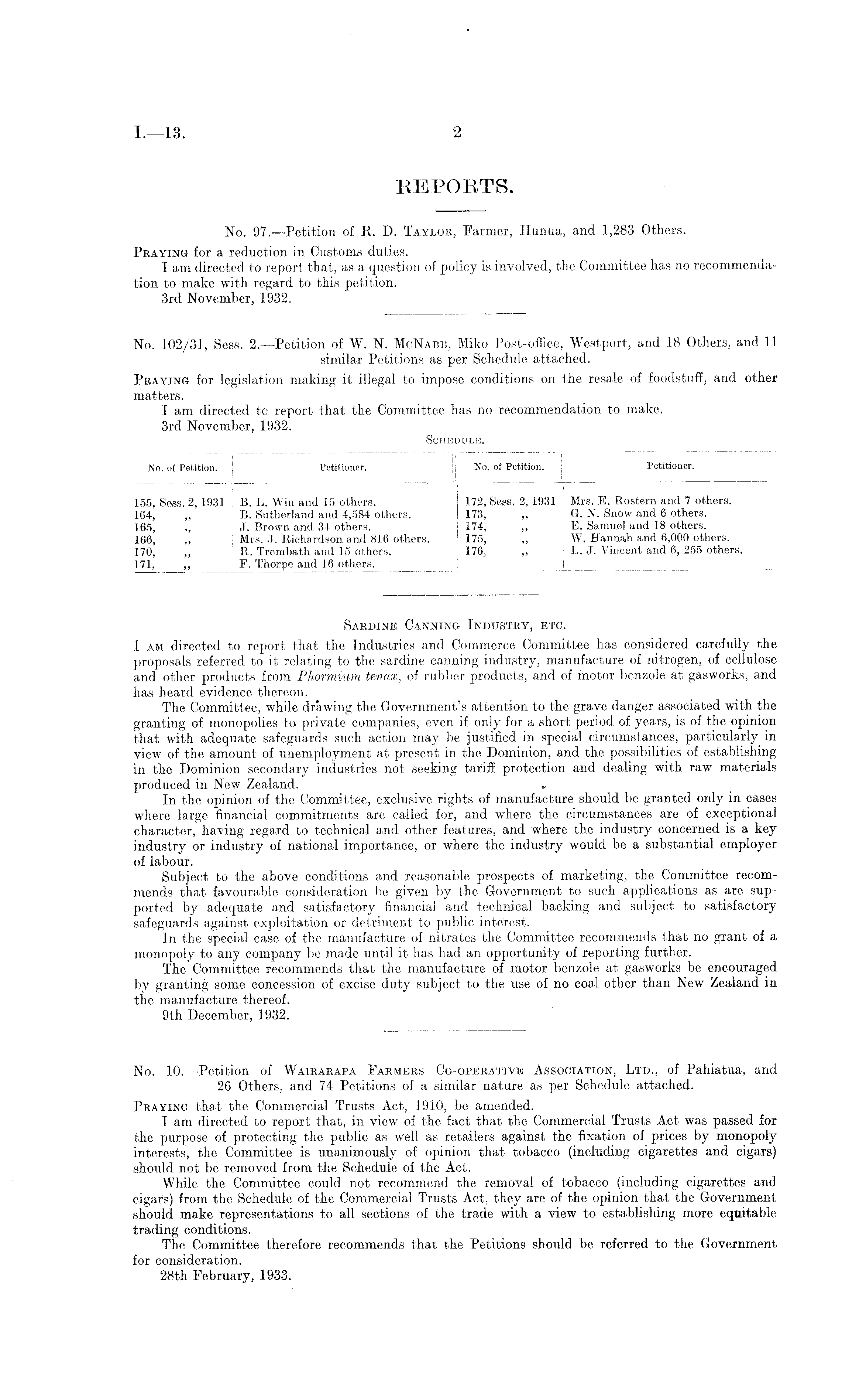 Sardine Canning Industry, etc. Ī am directed to report that the Industries and Commerce Committee has considered carefully the proposals referred to it relating to the sardine canning industry, manufacture of nitrogen, of cellulose and other products from Phormium tenax, of rubber products, and of motor benzole at gasworks, and has heard evidence thereon. The Committee, while drawing the Government's attention to the grave danger associated with the granting of monopolies to private companies, even if only for a short period of years, is of the opinion that with adequate safeguards such action may be justified in special circumstances, particularly in view of the amount of unemployment at present in the Dominion, and the possibilities of establishing in the Dominion secondary industries not seeking tariff protection and dealing with raw materials produced in New Zealand. . In the opinion of the Committee, exclusive rights of manufacture should be granted only in cases where large financial commitments are called for, and where the circumstances are of exceptional character, having regard to technical and other features, and where the industry concerned is a key industry or industry of national importance, or where the industry would be a substantial employer of labour. Subject to the above conditions and reasonable prospects of marketing, the Committee recommends that favourable consideration be given by the Government to such applications as are supported by adequate and satisfactory financial and technical backing and subject to satisfactory safeguards against exploitation or detriment to public interest. In the special case of the manufacture of nitrates the Committee recommends that no grant of a monopoly to any company be made until it has had an opportunity of reporting further. The Committee recommends that the manufacture of motor benzole at gasworks be encouraged by granting some concession of excise duty subject to the use of no coal other than New Zealand in the manufacture thereof. 9th December, 1932.