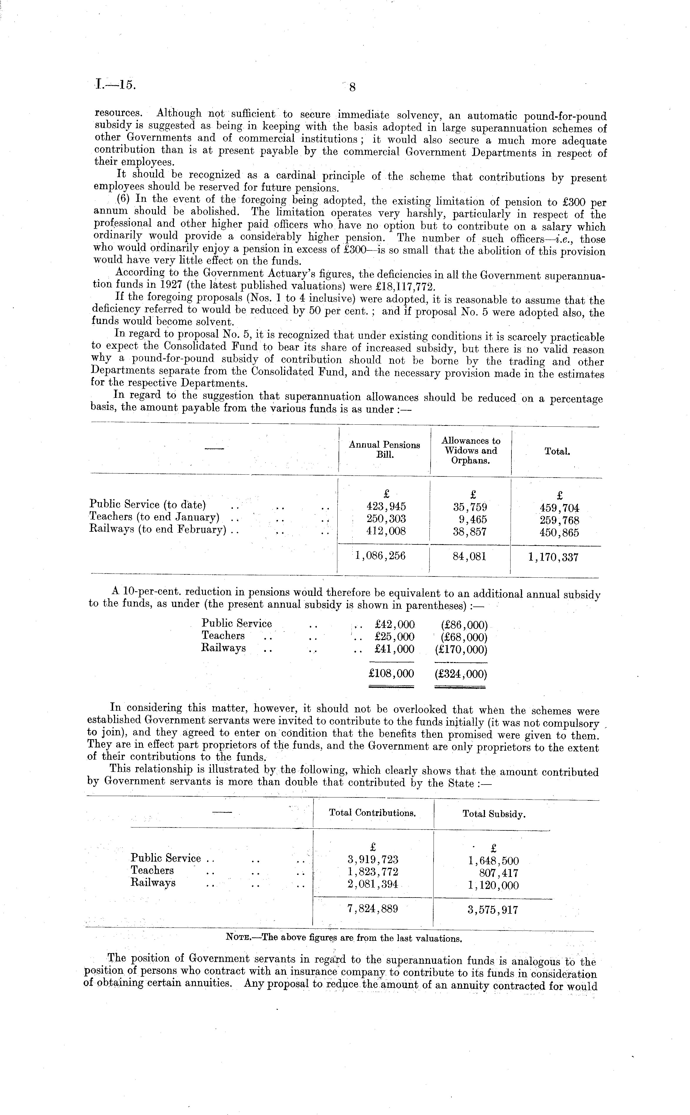 resources. Although not sufficient to secure immediate solvency, an automatic pound-for-pound subsidy is suggested as being in keeping with the basis adopted in large superannuation schemes of other Governments and of commercial institutions ; it would also secure a much more adequate contribution than is at present payable by the commercial Government Departments in respect of their employees. It should be recognized as a cardinal principle of the scheme that contributions by present employees should be reserved for future pensions. (6) In the event of the foregoing being adopted, the existing limitation of pension to £300 per annum should be abolished. The limitation operates very harshly, particularly in respect of the professional and other higher paid officers who have no option but to contribute on a salary which ordinarily would provide a considerably higher pension. The number of such officers —i.e., those who would ordinarily enjoy a pension in excess of £300—is so small that the abolition of this provision would have very little effect on the funds. According to the Government Actuary s figures, the deficiencies in all the Government superannuation funds in 1927 (the latest published valuations) were £18,117,772. If the foregoing proposals (Nos. 1 to 4 inclusive) were adopted, it is reasonable to assume that the deficiency referred to would be reduced by 50 per cent. ; and if proposal No. 5 were adopted also, the funds would become solvent. In. regard to proposal No. 5, it is recognized that under existing conditions it is scarcely practicable to expect the Consolidated Fund to bear its share of increased subsidy, but there is no valid reason why a pound-for-pound subsidy of contribution should not be borne by the trading and other Departments separate from the Consolidated Fund, and the necessary provision made in the estimates for the respective Departments. In regard to the suggestion that superannuation allowances should be reduced on a percentage basis, the amount payable from the various funds is as under :—