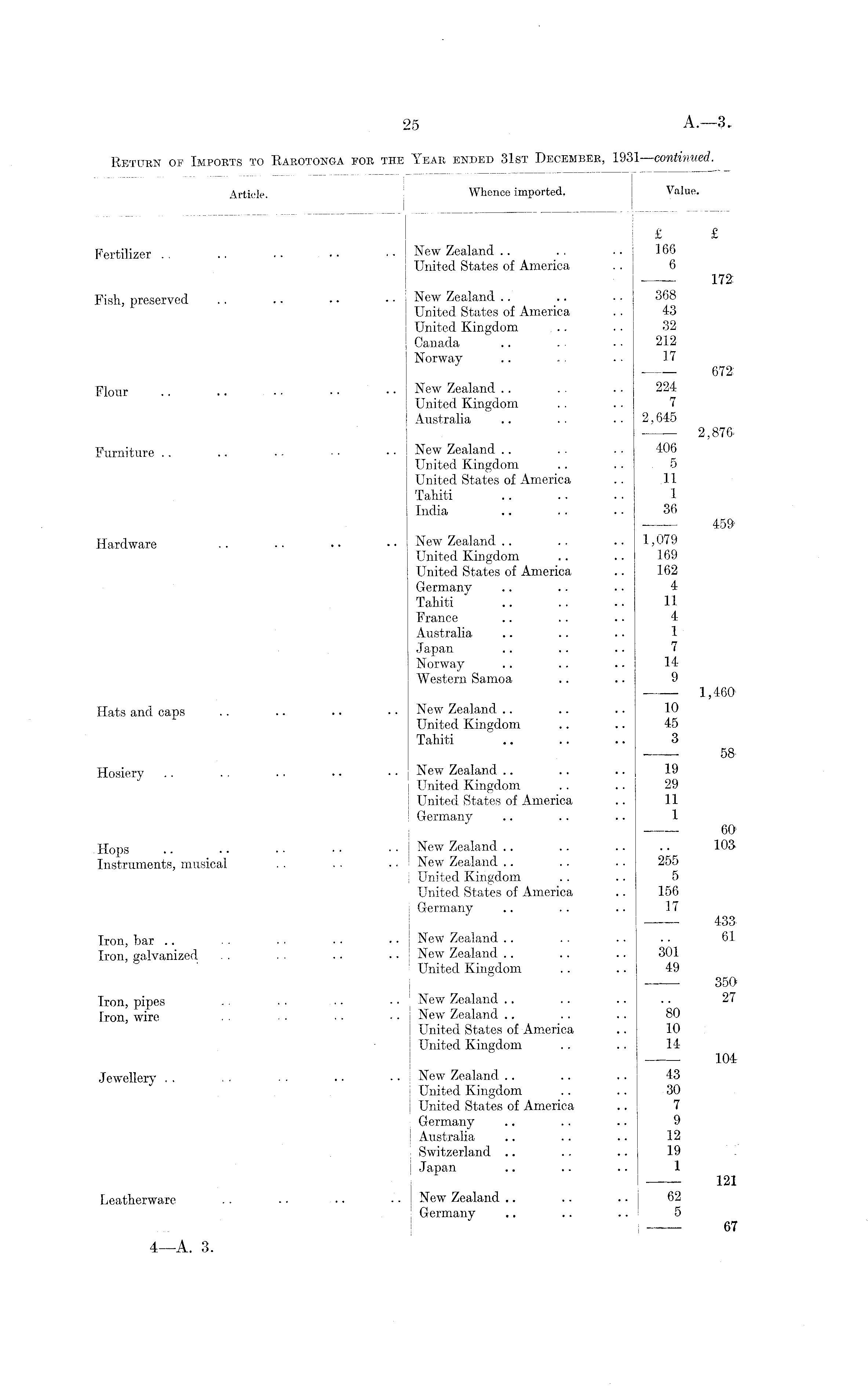 Article. Whence imported. Value. r £ £ Fertilizer .. .. • ■ • • New Zealand .. . . • • 166 United States of America . . 6 172 Fish, preserved .. .. • • • • New Zealand .. .. • • 368 United States of America . . 43 United Kingdom .. .. 32 Canada .. . .• 212 Norway .. .. . • 17 672 Fl our ,. .. .. .. .. New Zealand .. . . .. 224 United Kingdom . . . . 7 Australia .. .. .. 2,645 — 2,876Furniture .. .. ■ ■ - • • • New Zealand .. . . . . 406 United Kingdom .. . . .5 United States of America .. 11 Tahiti .. .. . . 1 India .. .. .. 36 459 Hardware . - • .. .. New Zealand .. .. .. 1,079 United Kingdom .. .. 169 United States of America .. 162 Germany .. .. .. 4 Tahiti .. . . .. 11 France .. .. .. 4 Australia .. .. .. 1 Japan .. .. .. 7 Norway .. .. .. 14 Western Samoa .. .. 9 1,460 Hats and caps .. .. .. ■ • New Zealand .. .. .. 10 United Kingdom .. .. 45 Tahiti .. .. .. 3 —— 58 Hosiery .. • • ■ • < • • New Zealand .. *. •• 19 United Kingdom .. .. 29 United States of America .. 11 Germany .. .. .. 1 60 Hops .. .. •• •• •• ! New Zealand .. .. .. .. 103 Instruments, musical . . . • • • New Zealand .. .. . . 255 United Kingdom .. .. 5 I United States of America .. 156 Germany .. .. .. 17 433 Iron, bar .. . . .. • ■ • • New Zealand .. .. .. .. 61 Iron, galvanized . . . . .. ■ • New Zealand .. .. .. 301 United Kingdom . . .. 49 350 Iron, pipes . . . . • • • • New Zealand .. .. .. .. 27 Iron, wire • . ■ ■ • • • • New Zealand .. . . .. 80 United States of America .. 10 United Kingdom . . .. 14 104 Jewellery . . . . • . . ■ • • New Zealand .. .. .. 43 United Kingdom .. .. 30 United States of America .. 7 Germany .. .. .. 9 Australia .. .. .. 12 Switzerland .. .. .. 19 Japan .. .. .. 1 — 121 Leatherware . . ■ • • • • ■ New Zealand .. .. .. 62 Germany .. .. .. 5 67