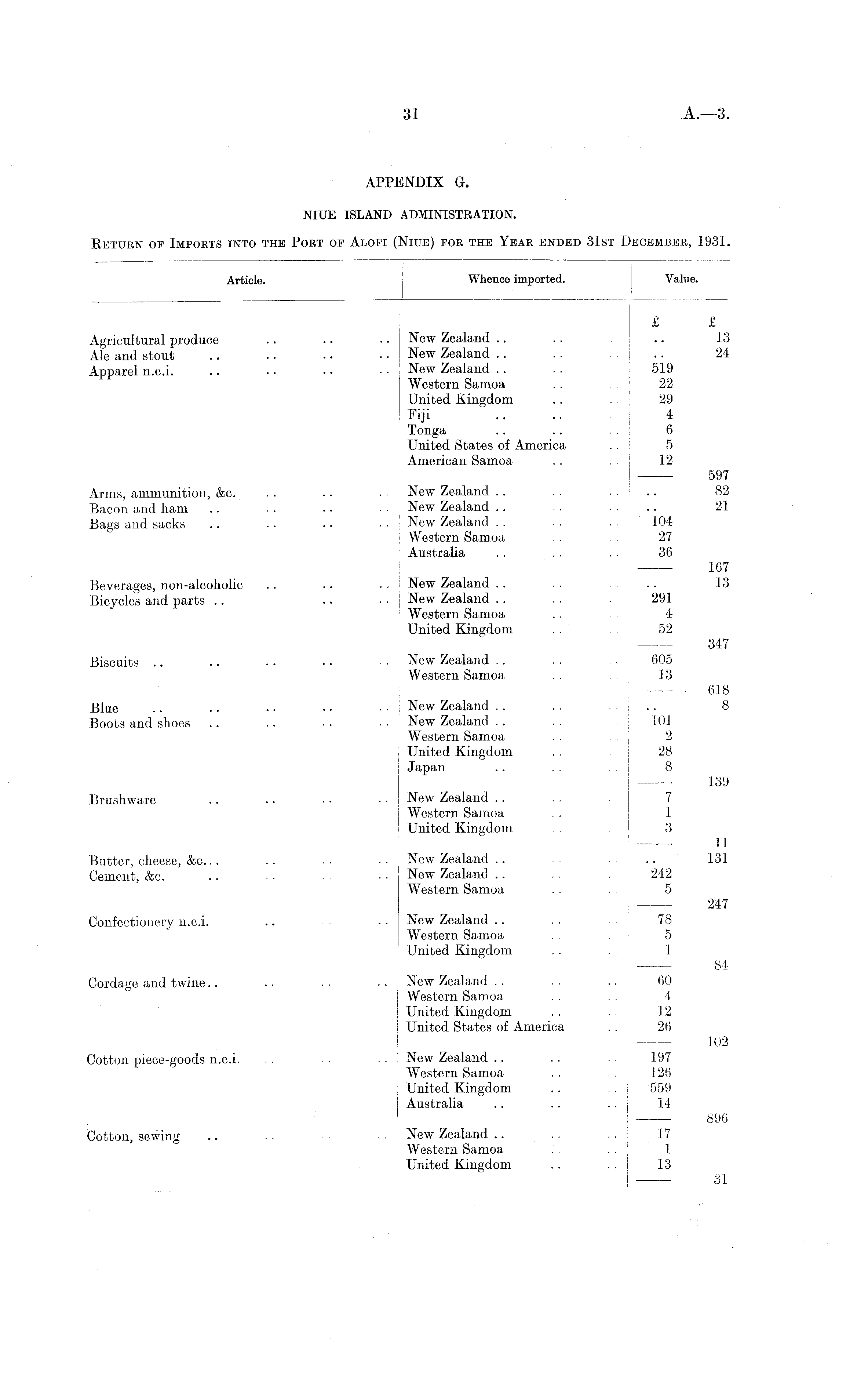 APPENDIX G. NIUE ISLAND ADMINISTRATION. Return of Imports into the Port of Alofi (Niue) for the Year ended 31st December, 1931.
