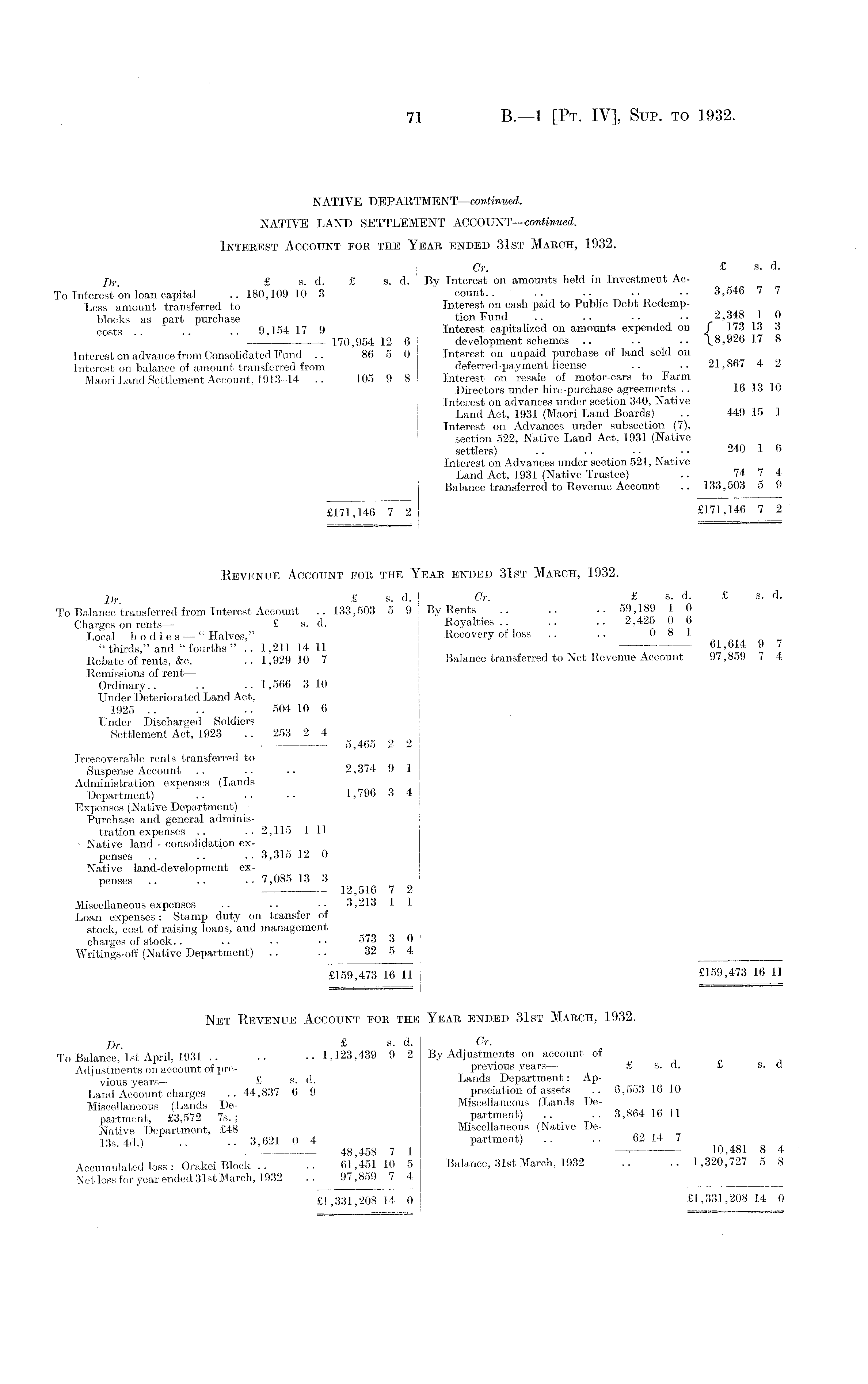 NATIVE DEPARTMENT —continued. NATIVE LAND SETTLEMENT ACCOUNT —continued. Interest Account foe the Year ended 31st March, 1932. Or. £ S. d. XV. £ s. d. £ s. d. By Interest on amounts held in Investment AcTo Interest on loan capital .. 180,109 10 3 count.. .. ~ ', " 3,546 7 7 Less amount transferred to Interest on cash paid to Public Debt Kedempblocks as part purchase tion Fund .. .. .. •• r ,1 2 cos ts .. .. .. 9,154 17 9 Interest capitalized on amounts expended on J LIS L 6 «1 170,954 12 6 development schemes .. .. .. \8,926 17 8 Interest on advance from Consolidated Fund .. 86 5 0 Interest on unpaid purchase of land sold on Interest on balance of amount transferred from deferred-payment license .. .. 21,867 4 Maori Land Settlement Account, 1913-14 .. 105 9 8 Interest on resale of motor-cars to Farm Directors under hire-purchase agreements .. 16 13 10 Interest on advances under section 340, Native Land Act, 1931 (Maori Land Boards) .. 449 .15 1 Interest on Advances under subsection (7), section 522, Native Land Act, 1931 (Native settlers) .. . • • ■ • • 240 1 6 Interest on Advances under section 521, Native Land Act, 1931 (Native Trustee) .. 74 7 4 Balance transferred to Revenue Account .. 133,503 5 9 £171,146 7 2 £171,146 7 2 Revenue Account for the Year ended 31st March, 1932. D r £ s. d. Or. £ s. d. £ s. d. To Balance transferred from Interest Account .. 133,503 5 9 By Rents .. .. .. 59,189 1 0 Charges on rents — £ s. d. Royalties .. .. .. 2,425 0 6 Local bodies —"Halves," Recovery of loss .. .. 081 " thirds," and " fourths " .. 1,211 14 11 ° " Rebate of rents, &c. .. 1,929 10 7 Baiance transferred to Net Revenue Account 97,859 7 4 Remissions of rent— Ordinary.. .. .. 1,566 3 10 Under Deteriorated Land Act, 1925 .. .. •• 504 10 6 Under Discharged Soldiers Settlement Act, 1923 .. 253 2 4 5,465 22 Irrecoverable rents transferred to Suspense Account .. ■■ .. 2,374 9 1 Administration expenses (Lands Department) .. .. •• 1,796 3 4 Expenses (Native Department) — Purchase and general administration expenses .. ..2,115 111 • Native land - consolidation expenses .. .. .. 3,315 12 0 Native land-development expenses .. .. •• 7,085 13 3 12,516 7 2 Miscellaneous expenses .. .. 3,21311 Loan expenses : Stamp duty on transfer of stock, cost of raising loans, and management charges of stock.. .. .. • • 573 3 0 Writings-ofi (Native Department) .. .. 32 5 4 £159,473 16 11 £159,473 16 II Net Revenue Account for the Year ended 31st March, 1932. 2) r £ s. • d. Or. To Balance," Ist April, 1931 .. .. .. 1,123,439 9 2 By Adjustments on account of Adjustments on account of pre- previous years— £ s. d. £ s. cl vious years— £ •s. d. Lands Department: ApLand Account charges ..44,837 6 9 preciation of assets . 6,553 16 10 Miscellaneous (Lands De- Miscellaneous (Lands Department, £3,572 75.; partment) .. .. 3,864 16 11 Native Department, £48 Miscellaneous (Native De13s. 4d.) .. •• 3,621 0 4 partment) .. .. 62 14 7 48,458 7 1 — 10,481 8 4 Accumulated loss: Orakei Block .. .. 61,451 10 5 Balance, 31st March, 1932 .. .. 1,320,727 5 8 Net loss for year ended 31st March, 1932 .. 97,859 7 4 £1,331,208 14 0 £1,331,208 14 0