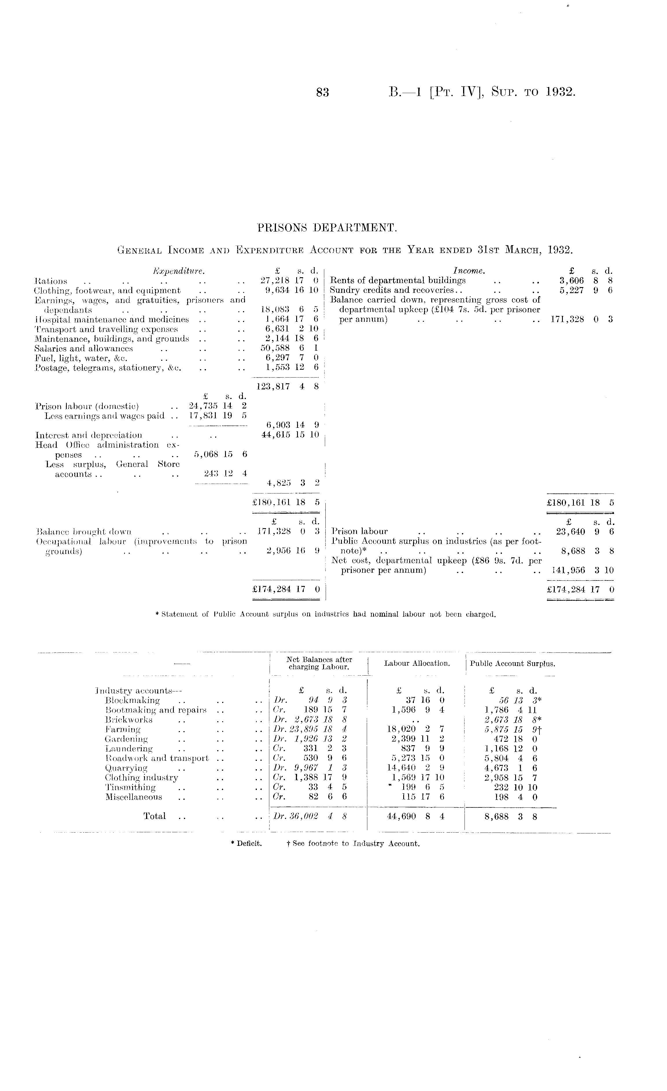 PRISONS DEPARTMENT. General Income and Expenditure Account foe the Year ended 31st March, 1932. Expenditure. £ s. d. Income. £ s. d. Rations .. .. .. .. .. 27,218170 Rents of departmental buildings .. .. 3,606 8 8 Clothing, footwear, and equipment .. .. 9,634 16 10 Sundry credits and recoveries.. .. .. 5,227 9 6 Earnings, wages, and gratuities, prisoners and Balance carried down, representing gross cost of dependants .. .. .. .. 18,083 6 5 departmental upkeep (£lO4 7s. sd. per prisoner Hospital maintenance and medicines .. .. 1,664 17 6 per annum) .. .. .. .. 171,328 0 3 Transport and travelling expenses .. .. 6,631 210 Maintenance, buildings, and grounds .. .. 2,144 18 6 Salaries and allowances .. .. .. 50,588 6 1 Fuel, light, water, &c. .. .. .. 6,29770 Postage, telegrams, stationery, &c. .. .. 1,553 12 6 123,817 4 8 £ s. d. Prison labour (domestic) .. 24,735 14 2 Less earnings and wages paid .. 17,831 19 5 6,903 14 9 Interest and depreciation .. .. 44,615 15 10 Head Office administration expenses .. .. .. 5,068 15 6 Less surplus, General Store accounts.. .. .. 243 12 4 4,825 3 2 £180,161 18 5 £180,161 18 5 £ s. d. £ s. d. Balance brought down .. .. .. 171,328 0 3 Prison labour .. .. .. .. 23,640 9 6 Occupational labour (improvements to prison Public Account surplus on industries (as per footgrounds) .. .. .. .. 2,956 16 9 note)* .. .. .. .. .. 8,688 3 8 Net cost, departmental upkeep (£B6 9s. 7d. per prisoner per annum) .. .. .. 141,956 310 £174,284 17 0 £174,284 17 0
