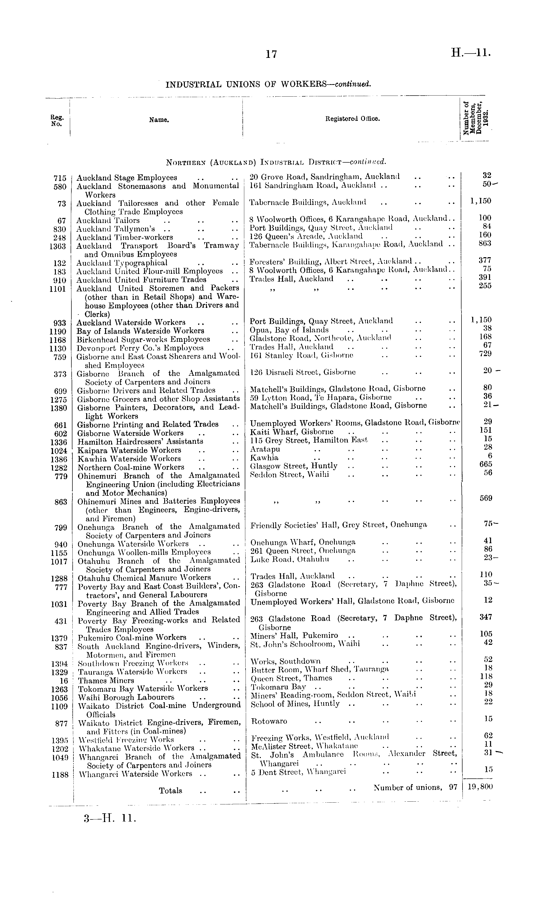 ° s"|~ . 5f8- Name. Registered Office. ■§ g § g No. Northern (Auckland) Industrial District —continued. 715 Auckland Stage Employees .. 20 Grove Road, Sandringham, Auckland .. .. 32 580 Auckland Stonemasons and Monumental 161 Sandringham Road, Auckland .. .. .. 50^ Workers 73 Auckland Tailoresses and other Female Tabernacle Buildings, Auckland .. .. .. 1,150 Clothing Trade Employees 67 Auckland Tailors .. .. .. 8 Woolworth Offices, 6 Karangahape Road, Auckland.. 100 830 Auckland Tallymen's .. .. .. Port Buildings, Quay Street, Auckland .. .. 84 248 Auckland Timber-workers .. .. 126 Queen's Arcade, Auckland 1363 Auckland Transport Board's Tramway Tabernacle Buildings, Karangahape Road, Auckland .. 863 and Omnibus Employees 132 Auckland Typographical .. .. Foresters' Building, Albert Street, Auckland .. .. 377 183 Auckland United Flour-mill Employees .. 8 Woolworth Offices, 6 Karangahape Road, Auckland.. 75 910 Auckland United Furniture Trades .. Trades Hall, Auckland .. .. • • • • 391 1101 Auckland United Storemen and Packers ,, ,, .. • • ■ • • • 255 (other than in Retail Shops) and Warehouse Employees (other than Drivers and Clerks) 933 Auckland Waterside Workers .. .. Port Buildings, Quay Street, Auckland .. .. 1, loO 1190 Bay of Islands Waterside Workers .. Opua, Bay of Islands 1168 Birkenhead Sugar-works Employees .. Gladstone Road, Northcote, Auckland .. .. 168 1130 Devonport Ferry Co.'s Employees .. Trades Hall, Auckland .. .. .. •• 67 759 Gisborne and East Coast Shearers and Wool- 161 Stanley Road, Gisborne .. .. .. 729 shed Employees 373 Gisborne Branch of the Amalgamated 126 Disraeli Street, Gisborne .. .. .. 20 _ Society of Carpenters and Joiners 699 Gisborne Drivers and Related Trades .. Matchell's Buildings, Gladstono Road, Gisborne 1275 Gisborne Grocers and other Shop Assistants 59 Lvtton Road, Te Hapara, Gisborne 1380 Gisborne Painters, Decorators, and Lead- Matchell's Buildings, Gladstone Road, Gisborne .. 21light Workers 661 Gisborne Printing and Related Trades .. Unemployed Workers' Rooms, Gladstone Road, Gisborne 29 602 Gisborne Waterside Workers .. .. Kaiti Wharf, Gisborne .. .. .. • • 151 1336 Hamilton Hairdressers'Assistants .. 115 Grey Street, Hamilton East .. .. .. 15 1024 Kaipara Waterside Workers .. .. Aratapu 1386 Kawhia Waterside Workers .. .. Kawhia .. .. • • • • • • ° 1282 Northern Coal-mine Workers .. .. Glasgow Street, Huntly .. .. .. 665 779 Ohinemuri Branch of the Amalgamated Seddon Street, Waihi .. .. .. • • 56 Engineering Union (including Electricians and Motor Mechanics) 863 Ohinemuri Mines and Batteries Employees ,, „ .. •• •• •• 5b9 (other than Engineers, Engine-drivers, and Firemen) 799 Onehunga Branch of the Amalgamated Friendly Societies' Hall, Grey Street, Onehunga .. 7o— Society of Carpenters and Joiners 940 Onehunga Waterside Workers .. .. Onehunga Wharf, Onehunga 1155 Onehunga Woollen-mills Employees .. 261 Queen Street, Onehunga 1017 Otahuhu Branch of the Amalgamated Luke Road, Otahuhu .. .. .. .. 23— Society of Carpenters and Joiners 1288 Otahuhu Chemical Manure Workers .. Trades Hall, Auckland .. .. .. .. 110 777 Poverty Bay and East Coast Builders', Con- 263 Gladstone Road (Secretary, 7 Daphne Street), •infractors', and Genera! Labourers Gisborne 1031 Poverty Bay Branch of the Amalgamated Unemployed Workers Hall, Gladstone Road, Gisborne 12 Engineering and Allied Trades ,. „ 431 Poverty Bay Freezing-works and Related 263 Gladstone Road (Secretary, 7 Daphne Street), 347 Trades Employees Gisborne 1379 Pukemiro Coal-mine Workers .. .. Miners'Hall, Pukemiro .. .. .. •• 837 South Auckland Engine-drivers, Winders, St. John's Schoolroom, V\ aihi .. .. .. 42 Motormen, and Firemen 1394 Southdown Freezing Workers .. .. Works, Southdown ■ • • • ■ • *' '! 1329 i Tauranga Waterside Workers .. .. Butter Room, Wharf Shed, Tauranga .. .. 8 16 Thames Miners .. ■. . • Queen Street, 1 hames .. .. .. • • 1263 Tokomaru Bay Waterside Workers .. Tokomaru Bay .. .. 1056 Waihi Borough Labourers .. .. Miners' Reading-room Seddon Street, W aihi .. 18 1109 Waikato District Coal-mine Underground School of Mines, Huntly .. Officials , - 877 Waikato District Engine-drivers, Firemen, Rotowaro and Fitters (in Coal-mines) 1395 Westfield Freezing Works .. .. Freezing Works, Westheld, Auckland .. .. bz 1202 Whakatane Waterside Workers .. .. McAlister Street, Whakatane .. .. .. 11 1049 Whangarei Branch of the Amalgamated St. John's Ambulance Rooms, Alexander Street, Society of Carpenters and Joiners Whangarei .. .. .. •• •• 1188 Whangarei Waterside Workers .. .. 5 Dent Street. V. hangarei .. .. •• Totals • •• •• Number of unions, 97 19,800 I "