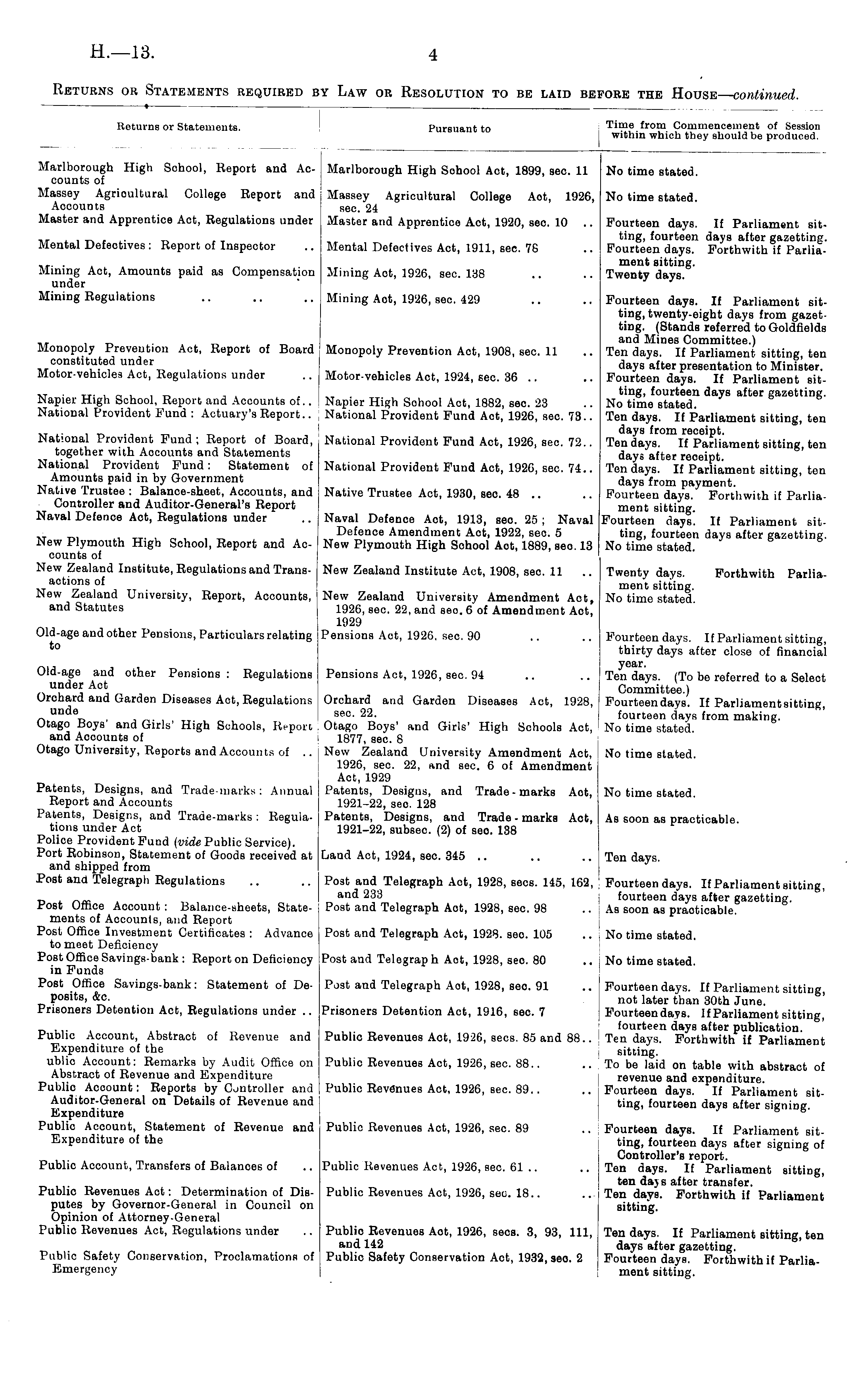 » 1 Returns or Statements. Pursuant to Time from Commencement of Session within which they should be produced. Marlborough High Sohool, Report and Ac- Marlborough High School Act, 1899, sec. 11 No time stated. counts of Massey Agricultural College Report and Massey Agricultural College Aot, 1926, No time stated Aocounts sec. 24 Master and Apprentice Act, Regulations under Master and Apprentice Act, 1920, sec 10 .. Fourteen days. If Parliament situ ;... ., „ , , ting, fourteen days after gazetting. Mental Defectives : Report of Inspector .. Mental Defectives Act, 1911, sec. 78 .. Fourteen days. Forthwith if Parlia- ... . ment sitting. Mining Act, Amounts paid as Compensation Mining Aot, 1926, sec. 138 .. .. Twenty days. under Mining Regulations .. .. .. Mining Aot, 1926, sec. 429 .. .. Fourteen days. If Parliament sitting, twenty-eight days from gazetting. (Stands referred to Goldfields „, , „ . _ and Mines Committee.) Monopoly Prevention Act, Report of Board Monopoly Prevention Act, 1908, sec. 11 .. Ten days. If Parliament sitting ten constituted under days after presentation to Minister. Motor-vehicles Act, Regulations under .. Motor-vehicles Act, 1924, sec. 36 .. .. Fourteen days. If Parliament sit- , T . TT . , _ , , _ , , . ting, fourteen days after gazetting. Napier High School, Report and Accounts of.. Napier High Sohool Act, 1882, sec. 23 .. No time stated. National Provident Fund : Actuary's Report.. National Provident Fund Act, 1926, sec. 73.. Ten days. If Parliament sitting, ten xt i- i t> -j, T-, -, t-. days from receipt. National Provident Fund ; Report of Board, National Provident Fund Act, 1926, sec. 72.. Ten days. If Parliament sitting ten together with Aocounts and Statements days after receipt National Provident Fund: Statement of National Provident Fund Act, 1926, sec. 74.. Ten days. If Parliament sitting ten Amounts paid in by Government days from payment. Native Irustee : Balance-sheet, Accounts, and Native Trustee Act, 1930, see 48 .. .. Fourteen days. Forthwith if ParliaController and Auditor-General's Report ment sitting Naval Defence Act, Regulations under .. Naval Defence Act, 1913, sec 23; Naval Fourteen days. If Parliament sit- ■ Defence Amendment Act, 1922, sec. 5 ting, fourteen days after gazetting. New Plymouth High School, Report and Ac- New Plymouth High School Act, 1889, sec 13 No time stated counts of New Zealand Institute, Regulations and Trans- New Zealand Institute Act, 1908, sec. 11 .. Twenty days Forthwith Parlia actions of ment sitting. JNew Zealand University, Report, Aocounts, New Zealand University Amendment Act, No time stated and Statutes 1926, sec. 22, and seo. 6 of Amendment Aot, 1929 Old-age and other Pensions, Particulars relating Pensions Aot, 1926. sec. 90 .. .. Fourteen days. If Parliament sitting, thirty days after close of financial Old-age and other Pensions: Regulations Pensions Act, 1926, sec 94 .. .. Ten days. (To be referred to a Select ,, u ° d " Ao ' „ J Committee.) Orchard and Garden Diseases Act, Regulations Orchard and Garden Diseases Act, 1928, Fourteendays. If Parliament sitting, r.. UU o „ ' seo - 22 - fourteen days from making. Otago Boys and Girls High Schools, Report Otago Boys' and Girls' High Schools Act, No time stated. and Accounts of 1877, sec 8 Otago University, Reports and Accounts of .. New Zealand University Amendment Act, Mo time stated. 1926, sec. 22, and sec. 6 of Amendment Act, 1929 Patents, Designs, and Trade -marks : Annual Patents, Designs, and Trade-marks Aot, No time stated Report and Accounts 1921-22, sec 128 Patents, Designs, and Trade-marks : Regula- Patents, Designs, and Trade - marks Act, As soon as practicable. tions under Act 1921-22, subsec. (2) of sec 138 Police Provident Fund (vide Public Service). Port Robinson, Statement of Goods received at Laud Act, 1924, sec. 345 .. .. .. Ten days. and shipped from Post and Telegraph Regulations .. .. Post and Telegraph Act, 1928, seos. 145, 162, Fourteen days. If Parliament sitting, _ . _„ and 233 fourteen days after gazetting. Post Office Account : Balance-sheets, State- Post and Telegraph Aot, 1928, sec 98 .. As soon as practicable. ments of Accounts, and Report Post Office Investment Certificates : Advance Post and Telegraph Act, 1928. sec 105 .. No time stated. to meet Deficiency Post Office Savings-bank : Report on Deficiency Post and Telegraph Aot, 1928, seo. 80 .. ! No time stated. in Funds Post Office Savings-bank: Statement of De- Post and Telegraph Aot, 1928, sec 91 ..! Fourteendays. If Parliament sitting posits, &o. no t later than 30th June. Prisoners Detention Act, Regulations under .. Prisoners Detention Act, 1916, sec 7 Fourteendays. If Parliament sitting, fourteen days after publication. Public Account, Abstract of Revenue and Public Revenues Act, 1926, sees. 85 and 88.. Ten days. Forthwith if Parliament Expenditure of the sitting. ublic Account: Remarks by Audit Office on Public Revenues Act, 1926, sec. 88.. .. ' To be laid on table with abstract of Abstract of Revenue and Expenditure revenue and expenditure. Public Account: Reports by Controller and Public Revflnues Act, 1926, sec. 89.. .. Fourteen days. If Parliament sit-Auditor-General on Details of Revenue and ting, fourteen days after signing Expenditure Public Account, Statement of Revenue and Public Revenues Act, 1926, sec. 89 .. Fourteen days. If Parliament BitExpenditure of the ting, fourteen days after signing of Controller's report. Public Account, Transfers of Balanoes of .. Public Revenues Act, 1926, sec. 61 .. .. Ten days. If Parliament sitting, ten dajs after transfer. Public Revenues Act: Determination of Dis- Public Revenues Act, 1926, seo. 18.. .. Ten days. Forthwith if Parliament putes by Governor-General in Council on sitting. Opinion of Attorney-General Public Revenues Act, Regulations under .. Public Revenues Aot, 1926, sees. 3, 93, 111, l Ten days. If Parliament sitting, ten an< l 1*2 days after gazetting. Public Safety Conservation, Proclamations