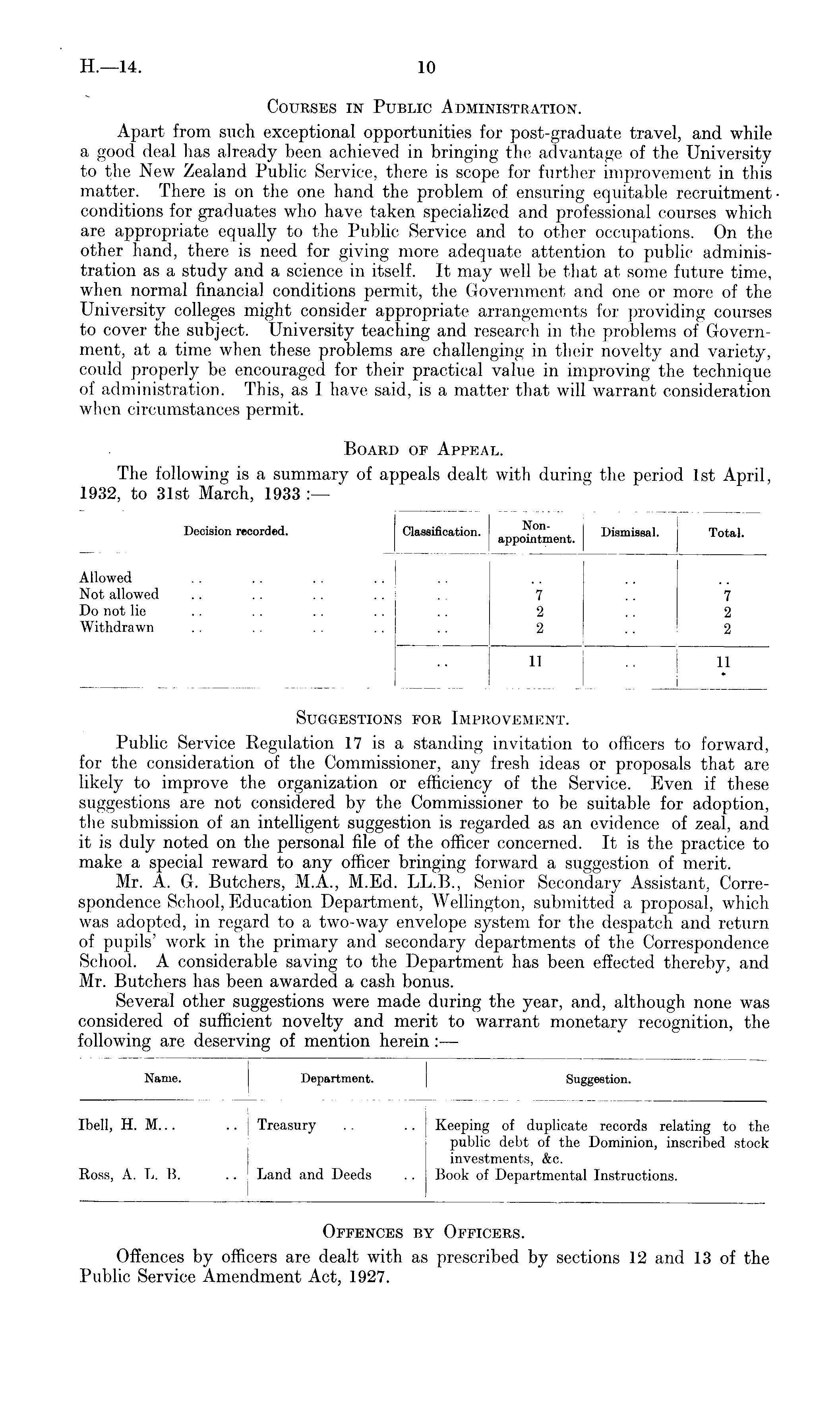 Suggestions for Improvement. Public Service Regulation 17 is a standing invitation to officers to forward, for the consideration of the Commissioner, any fresh ideas or proposals that are likely to improve the organization or efficiency of the Service. Even if these suggestions are not considered by the Commissioner to be suitable for adoption, the submission of an intelligent suggestion is regarded as an evidence of zeal, and it is duly noted on the personal file of the officer concerned. It is the practice to make a special reward to any officer bringing forward a suggestion of merit. Mr. A. G. Butchers, M.A., M.Ed. LL.B., Senior Secondary Assistant, Correspondence School, Education Department, Wellington, submitted a proposal, which was adopted, in regard to a two-way envelope system for the despatch and return of pupils' work in the primary and secondary departments of the Correspondence School. A considerable saving to the Department has been effected thereby, and Mr. Butchers has been awarded a cash bonus. Several other suggestions were made during the year, and, although none was considered of sufficient novelty and merit to warrant monetary recognition, the following are deserving of mention herein:—