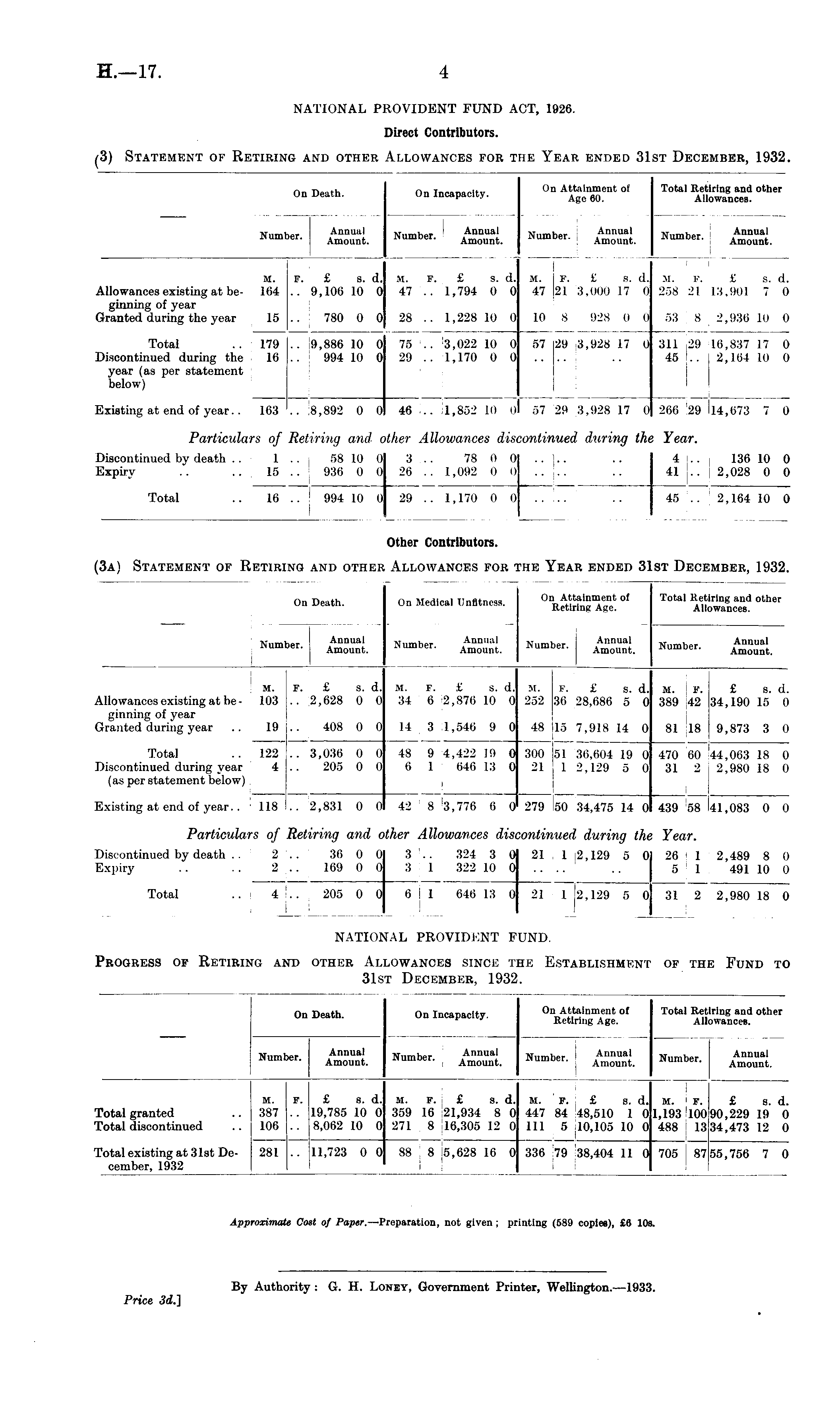 NATIONAL PROVIDENT FUND ACT, 1926. Direct Contributors. (3) Statement of Retiring and other Allowances for the Year ended 31st December, 1932.