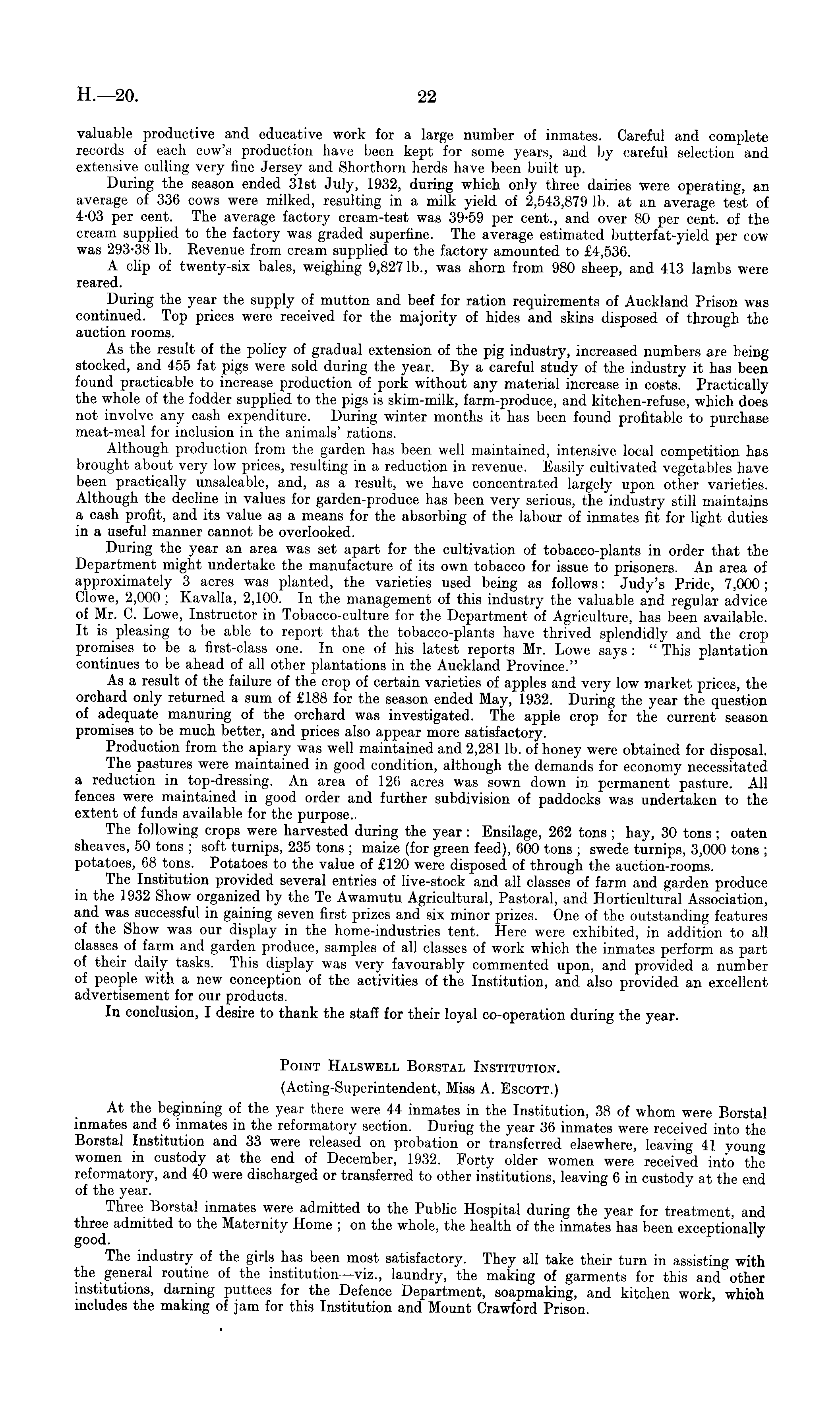 valuable productive and educative work for a large number of inmates. Careful and complete records of each cow's production have been kept for some years, and by careful selection and extensive culling very fine Jersey and Shorthorn herds have been built up. During the season ended 31st July, 1932, during which only three dairies were operating, an average of 336 cows were milked, resulting in a milk yield of 2,543,879 lb. at an average test of 4-03 per cent. The average factory cream-test was 39-59 per cent., and over 80 per cent, of the cream supplied to the factory was graded superfine. The average estimated butterfat-yield per cow was 293-38 lb. Eevenue from cream supplied to the factory amounted to £4,536. A clip of twenty-six bales, weighing 9,827 lb., was shorn from 980 sheep, and 413 lambs were reared. During the year the supply of mutton and beef for ration requirements of Auckland Prison was continued. Top prices were received for the majority of hides and skins disposed of through the auction rooms. As the result of the policy of gradual extension of the pig industry, increased numbers are 1 icing stocked, and 455 fat pigs were sold during the year. By a careful study of the industry it has been found practicable to increase production of pork without any material increase in costs. Practically the whole of the fodder supplied to the pigs is skim-milk, farm-produce, and kitchen-refuse, which does not involve any cash expenditure. During winter months it has been found profitable to purchase meat-meal for inclusion in the animals' rations. Although production from the garden has been well maintained, intensive local competition has brought about very low prices, resulting in a reduction in revenue. Easily cultivated vegetables have been practically unsaleable, and, as a result, we have concentrated largely upon other varieties. Although the decline in values for garden-produce has been very serious, the industry still maintains a cash profit, and its value as a means for the absorbing of the labour of inmates fit for light duties in a useful manner cannot be overlooked. During the year an area was set apart for the cultivation of tobacco-plants in order that the Department might undertake the manufacture of its own tobacco for issue to prisoners. An area of approximately 3 acres was planted, the varieties used being as follows: Judy's Pride, 7,000 ; Clowe, 2,000 ; Kavalla, 2,100. In the management of this industry the valuable and regular advice of Mr. C. Lowe, Instructor in Tobacco-culture for the Department of Agriculture, has been available. It is pleasing to be able to report that the tobacco-plants have thrived splendidly and the crop promises to be a first-class one. In one of his latest reports Mr. Lowe says : " This plantation continues to be ahead of all other plantations in the Auckland Province." As a result of the failure of the crop of certain varieties of apples and very low market prices, the orchard only returned a sum of £188 for the season ended May, 1932. During the year the question of adequate manuring of the orchard was investigated. The apple crop for the current season promises to be much better, and prices also appear more satisfactory. Production from the apiary was well maintained and 2,281 lb. of honey were obtained for disposal. The pastures were maintained in good condition, although the demands for economy necessitated a reduction in top-dressing. An area of 126 acres was sown down in permanent pasture. All fences were maintained in good order and further subdivision of paddocks was undertaken to the extent of funds available for the purpose.. The following crops were harvested during the year : Ensilage, 262 tons ; hay, 30 tons ; oaten sheaves, 50 tons ; soft turnips, 235 tons ; maize (for green feed), 600 tons ; swede turnips, 3,000 tons ; potatoes, 68 tons. Potatoes to the value of £120 were disposed of through the auction-rooms. The Institution provided several entries of live-stock and all classes of farm and garden produce in the 1932 Show organized by the Te Awamutu Agricultural, Pastoral, and Horticultural Association, and was successful in gaining seven first prizes and six minor prizes. One of the outstanding features of the Show was our display in the home-industries tent. Here were exhibited, in addition to all classes of farm and garden produce, samples of all classes of work which the inmates perform as part of their daily tasks. This display was very favourably commented upon, and provided a number of people with a new conception of the activities of the Institution, and also provided an excellent advertisement for our products. In conclusion, I desire to thank the staff for their loyal co-operation during the year. Point Halswell Borstal Institution. (Acting-Superintendent, Miss A. Escott.) At the beginning of the year there were 44 inmates in the Institution, 38 of whom were Borstal inmates and 6 inmates in the reformatory section. During the year 36 inmates were received into the Borstal Institution and 33 were released on probation or transferred elsewhere, leaving 41 young women in custody at the end of December, 1932. Forty older women were received into the reformatory, and 40 were discharged or transferred to other institutions, leaving 6 in custody at the end of the year. Three Borstal inmates were admitted to the Public Hospital during the year for treatment, and three admitted to the Maternity Home ; on the whole, the health of the inmates has been exceptionally good. The industry of the girls has been most satisfactory. They all take their turn in assisting with the general routine of the institution—viz., laundry, the making of garments for this and other institutions, darning puttees for the Defence Department, soapmaking, and kitchen work, which includes the making of jam for this Institution and Mount Crawford Prison.