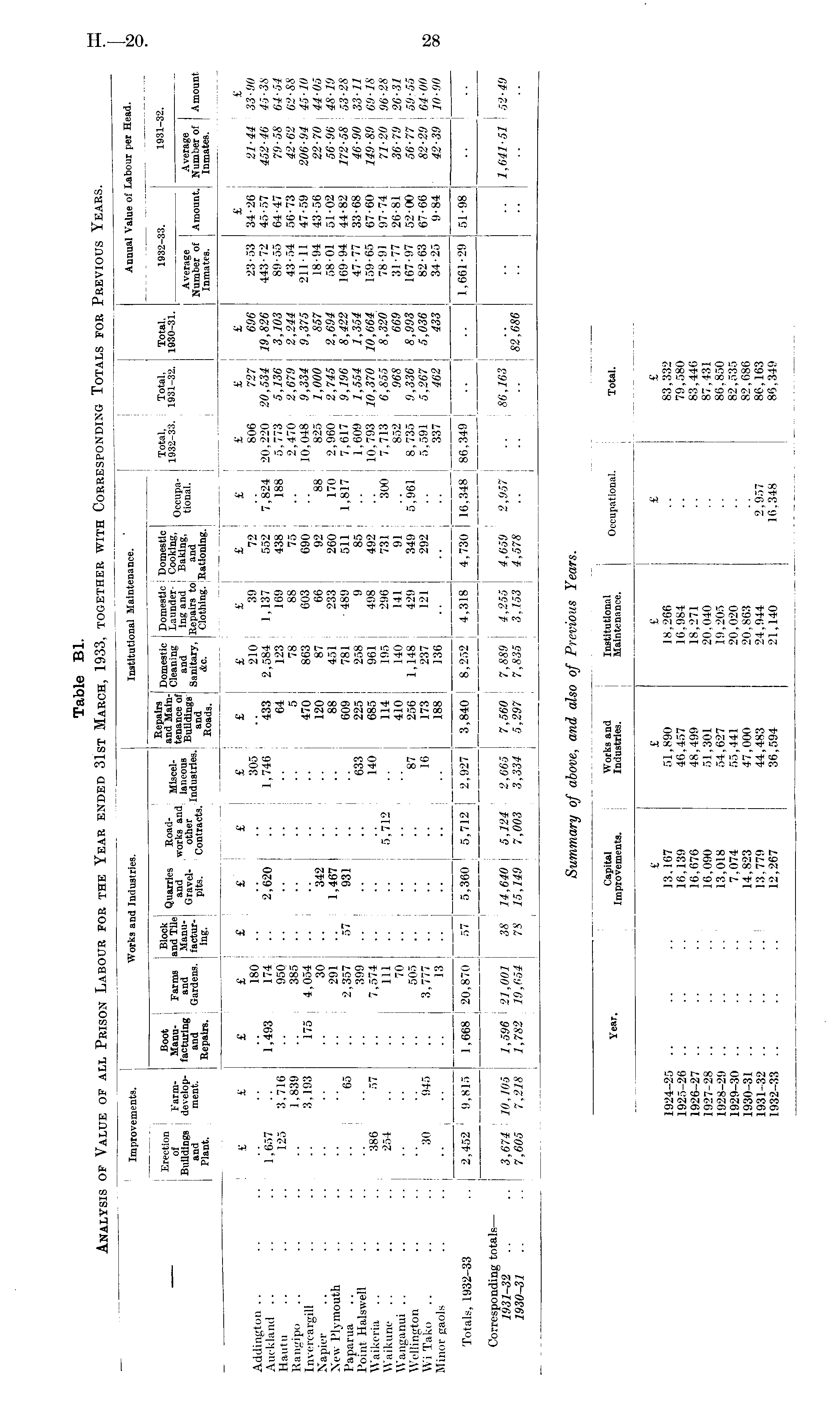 Table B1. Analysis of Value of all Prison Labour for the Year ended 31st March, 1933, together with Corresponding Totals for Previous Years.