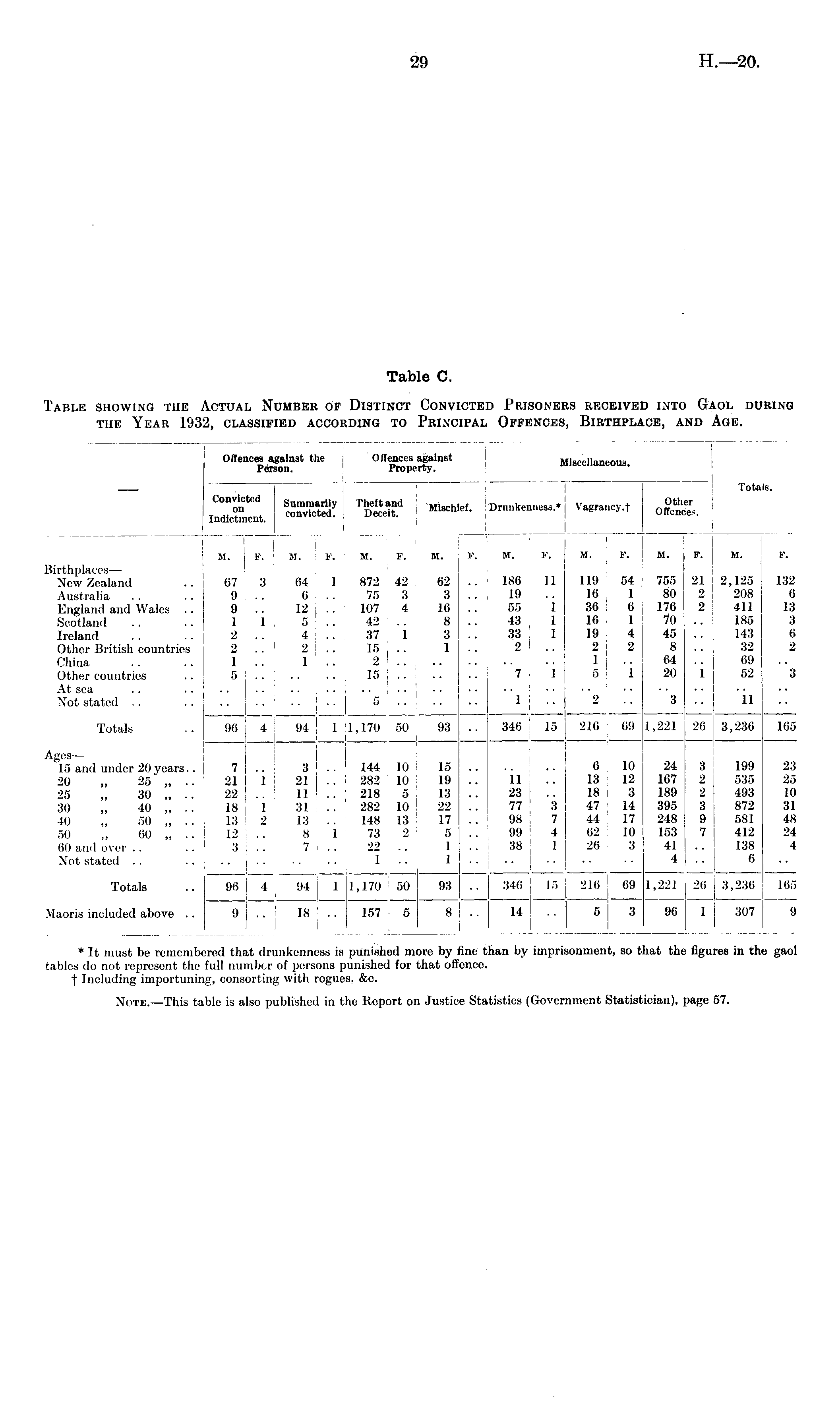 Table C. Table showing the Actual Number of Distinct Convicted Prisoners received into Gaol during the Year 1932, classified according to Principal Offences, Birthplace, and Age.