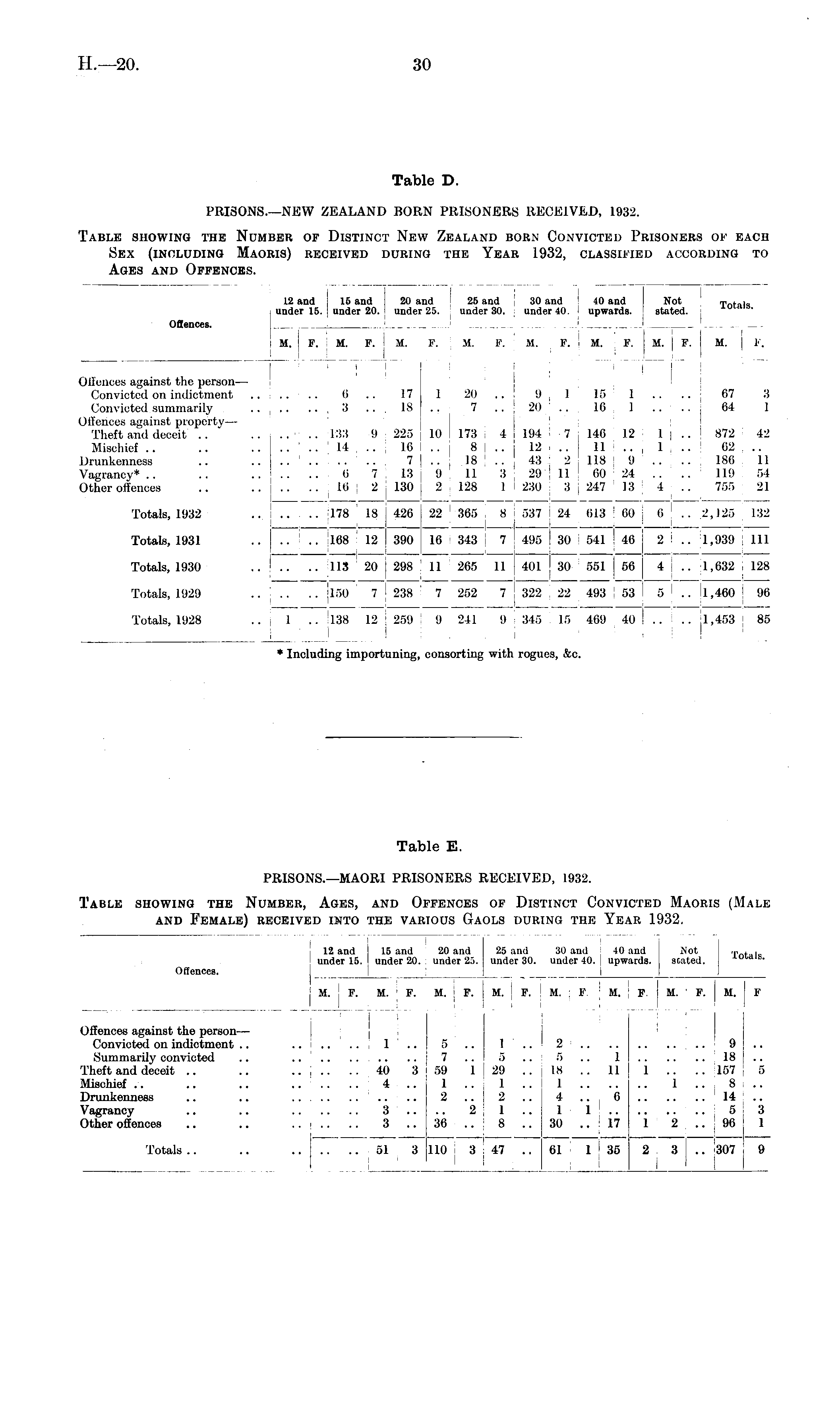 Table E. PRISONS.—MAORI PRISONERS RECEIVED, 1932. Table showing the Number, Ages, and Offences of Distinct Convicted Maoris (Male and Female) received into the various Gaols during the Year 1932.