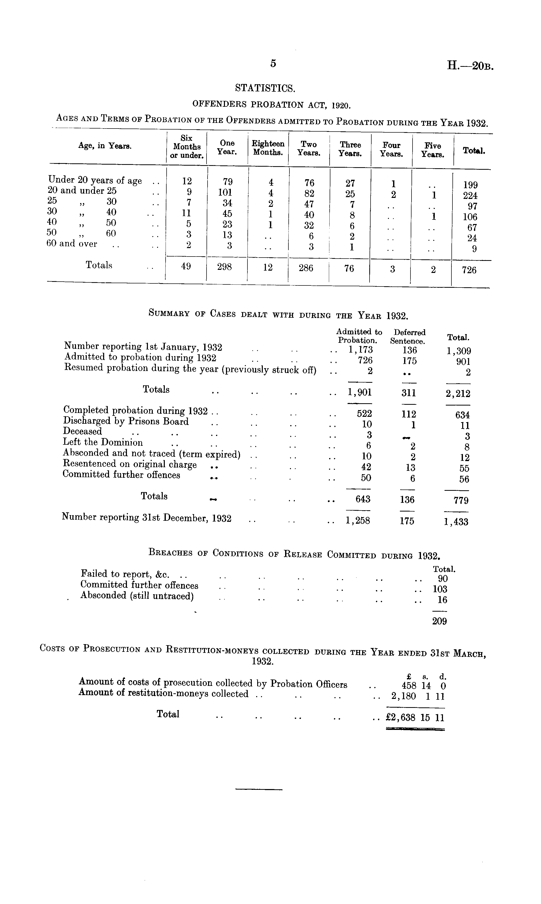 : ! I ! i i i I Summary op Cases dealt with during the Year 1932. Admitted to Deferred . -it , . , T , Probation. Sentence. JN umber reporting Ist January, 1932 .. .. .. 1,173 136 1 309 Admitted to probation during 1932 .. .. .. '726 175 '901 Resumed probation during the year (previously struck off) .. 2 .. 2 Totals •• •• .. 1,901 311 2,212 Completed probation during 1932 .. 522 112 634 Discharged by Prisons Board .. .. .. 10 1 11 Deceased .. .. .. ~ 3 2 Left the Dominion .. .. .. 6 8 Absconded and not traced (term expired) .. .. .. 10 2 12 Resentenced on original charge .. .. .. 42 13 55 Committed further offences ... .. 50 6 56 Totals „ .. 643 136 779 Number reporting 31st December, 1932 .. .. ..1,258 175 1 433 Breaches or Conditions of Release Committed during 1932. Failed to report, &c. .. .. .. _ '^gcT'' Committed further offences . . .. . . " jq3 Absconded (still untraced) .. .. jg 209 Costs of Prosecution and Restitution-moneys collected during the Year ended 31st March 1932. £ 8 d Amount of costs of prosecution collected by Probation Officers .. 458 14 0 Amount of restitution-moneys collected .. .. .. .. 2,180 1 11 Total •• •• -• •• .. £2,638 15 11