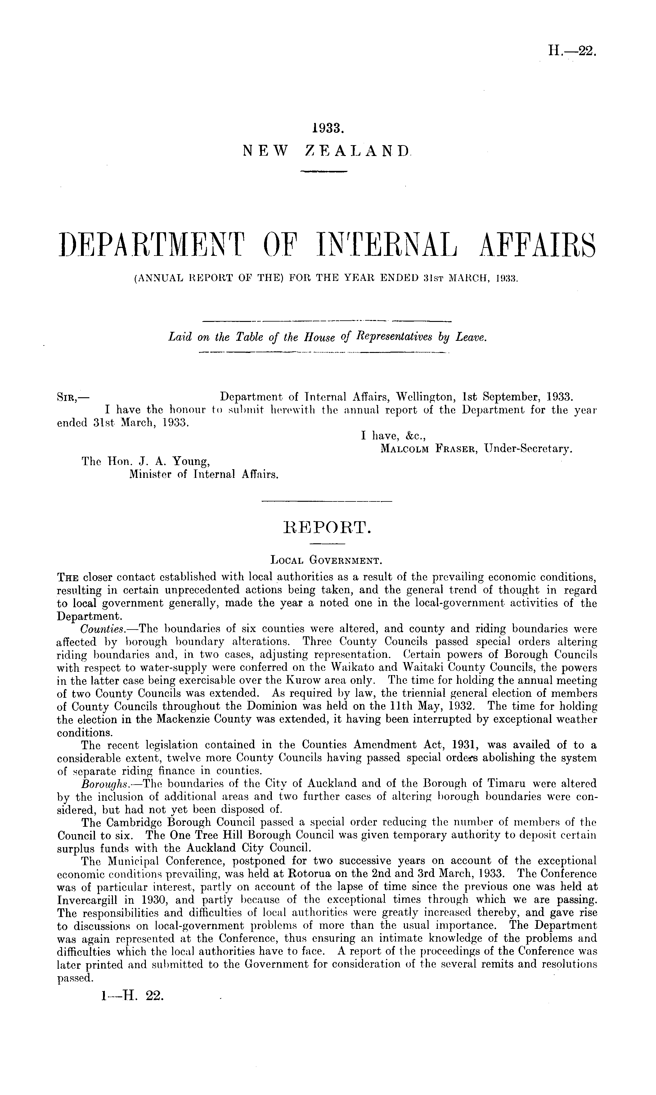 Sir, — Department of Internal Affairs, Wellington, Ist September, 1933. I have the honour to submit herewith the annual report of the Department for the year ended 31st March, 1933. I have, &c, Malcolm Fraser, Under-Secretary. The Hon. J. A. Young, Minister of Internal Affairs.