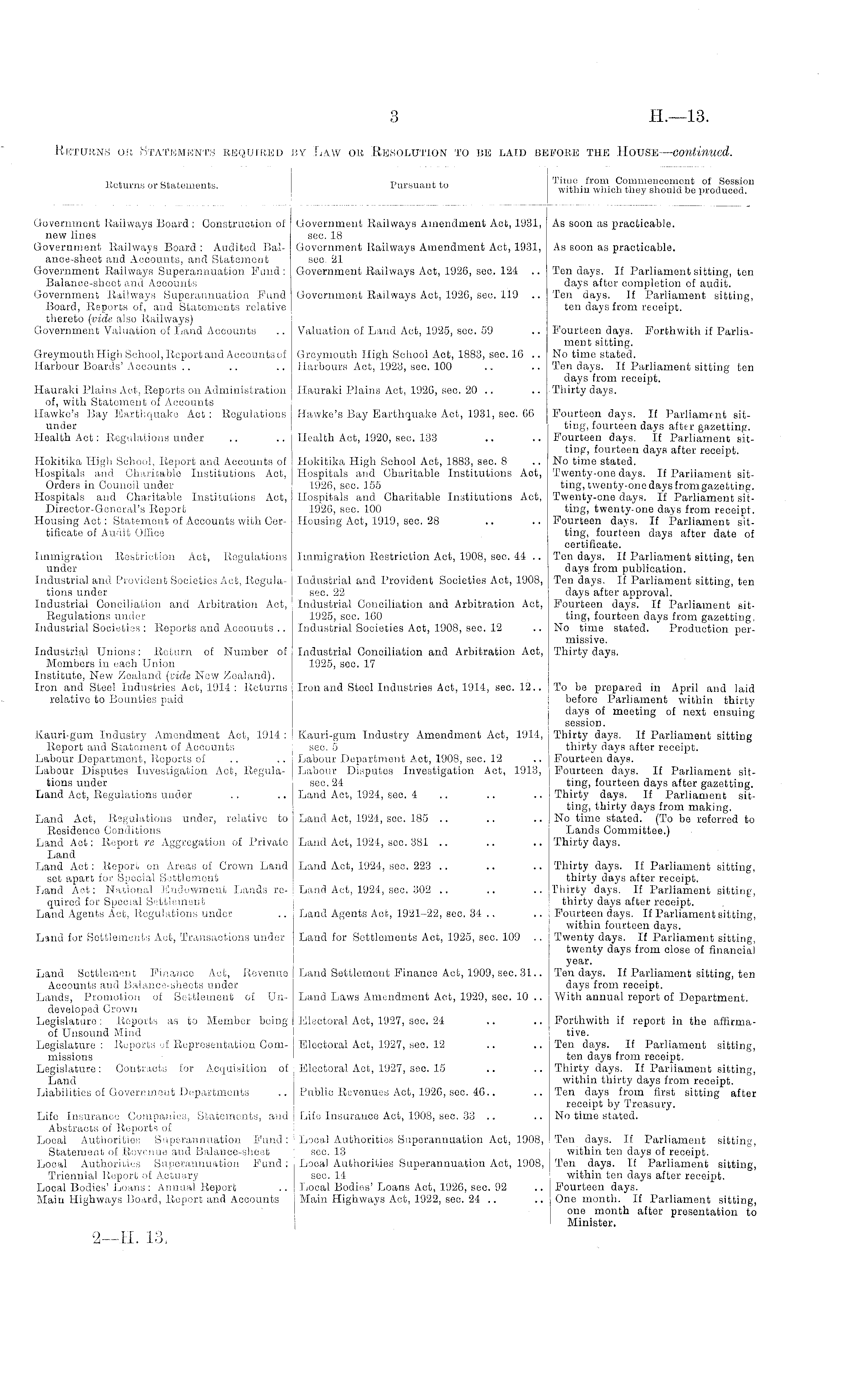 -Rotnvno nf«.t 0 mA n t 0 Piivmnnt tn Time from Commencement of Session Betuins or Statements. Puisuant to within which they should be produced. Government Railways Board: Construction ol Government Railways Amendment Act, 1931, As soon as practicable. new lines sec. 18 Government Railways Board : Audited Bal- Government Railways Amendment Act, 1931, As soon as practicable. ance-sheet and Accounts, and Statement sec. 21 Government Railways Superannuation Fund: Government Railways Act, 1926, sec. 124 .. Ten days. If Parliament sitting, ten Balance-sheet and Aocounts days after completion of audit. Government Railways Superannuation Fund Government Railways Act, 1926, sec. 119 .. Ten days. If Parliament sitting, Board, Reports of, and Statements relative ten days from receipt. thereto (vide also Railways) Government Valuation of Land Accounts .. Valuation of Land Act, 1925, sec. 59 .. Fourteen days. Forthwith if Parliament sitting. Greymouth High School, Report and Accounts of Greymouth High School Act, 1883, sec. 16 .. No time stated. Harbour Boards' Accounts .. .. .. Harbours Act, 1923, sec. 100 .. .. Ten days. If Parliament sitting ten days from receipt. Hauraki Plains Act, Reports on Administration Hauraki Plains Act, 1926, sec. 20 .. .. Thirty days. of, with Statement of Accounts Hawke's Bay Earthquake Act : Regulations Hawke's Bay Earthquake Act, 1931, sec. 66 Fourteen days. If Parliament situnder ting, fourteen days after gazetting. Health Act: Regulations under .. .. Health Act, 1920, sec. 133 .. .. Fourteen days. If Parliament sitting, fourteen days after receipt. Hokitika High School, Report and Accounts of Hokitika High School Act, 1883, sec. 8 .. No time stated. Hospitals and Charitable Institutions Act, Hospitals and Charitable Institutions Aot, Twenty-one days. If Parliament sitOrders in Council under 1926, sec. 155 ting, twenty-one days fromgazetting. Hospitals and Charitable Institutions Act, Hospitals and Charitable Institutions Act, Twenty-one days. If Parliament sit-Director-General's Report 1926, sec. 100 ting, twenty-one days from receipt. Housing Act: Statement of Accounts with Cer- Housing Act, 1919, sec. 28 .. .. Fourteen days. If Parliament sittificate of Audit Office ting, fourteen days after date of certificate. Immigration Restriction Aot, Regulations Immigration Restriction Act, 1908, sec. 44 .. Ten days. If Parliament sitting, ten under days from publication. Industrial and Provident Societies Act, Regula- Industrial and Provident Societies Act, 1908, Ten days. If Parliament sitting, ten tions under seo. 22 days after approval. Industrial Conciliation and Arbitration Act, Industrial Conciliation and Arbitration Act, Fourteen days. If Parliament sitRegulations under 1925, sec. 160 ting) fourteen days from gazetting, Industrial Societies : Reports and Accounts .. Industrial Societies Aot, 1908, sec. 12 .. No time stated. Production permissive. Industrial Unions: Return of Number of Industrial Conciliation and Arbitration Aot, Thirty days. Members in each Union 1925, sec. 17 Institute, New Zealand (vide Now Zealand). Iron and Steel Industries Act, 1914 : Returns Iron and Steel Industries Act, 1914, sec. 12.. To be prepared in April and laid relative to Bounties paid before Parliament within thirty days of meeting of next ensuing session. Kauri-gum Industry Amendment Act, 1914 : Kauri-gum Industry Amendment Act, 1914, Thirty days. If Parliament sitting Report and Statement of Accounts sec. 5 thirty days after receipt. Labour Department, Reports of .. .. Labour Department Act, 1908, sec. 12 .. Fourteen days. Labour Disputes Investigation Act, Regula- Labour Disputes Investigation Act, 1913, Fourteen days. If Parliament sittions under sec. 24 ting, fourteen days after gazetting. Land Act, Regulations under .. .. Land Aot, 1924, seo. 4 . . .. .. Thirty days. If Parliament sitting, thirty days from making. Land Act, Regulations under, relative to Land Act, 1924, sec. 185 ... .. .. No time stated. (To be referred to Residence Conditions Lands Committee.) Land Act: Report re Aggregation of Private Land Aot, 1924, sec. 381 .. .. .. Thirty days. Land Land Act: Report on Areas of Crown Land Land Act, 1924, seo. 223 .. .. .. Thirty days. If Parliament sitting, set apart for Special Settlement thirty days after receipt. Land Act: National Endowment Lands re- Land Act, 1924, sec. 302 .. .. .. Thirty days. If Parliament sitting, quired for Special Settlement thirty days after receipt. Land Agents Act, Regulations under .. Land Agents Aot, 1921-22, sec. 34 .. .. Fourteen days. If Parliament sitting, within fourteen days. Land for Settlements Act, Transactions under Land for Settlements Act, 1925, sec. 109 .. Twenty days. If Parliament sitting, twenty days from close of financial year. Land Settlement Finance Act, Revenue Land Settlement Finance Aot, 1909, sec. 31.. Ten days. If Parliament sitting, ten Accounts and Balance-sheets under days from reoeipt. Lands, Promotion of Settlement of Un- Land Laws Amendment Aot, 1929, sec. 10 .. With annual report of Department, developed Crown Legislature : Reports as to Member being Electoral Act, 1927, sec. 24 .. .. Forthwith if report in the affirmaof Unsound Mind tive. Legislature : Reports of Representation Com- Electoral Act, 1927, seo. 12 .. .. Ten days. If Parliament sitting, missions ten days from receipt. Legislature: Contracts for Acquisition of Electoral Act, 1927, seo. 15 .. .. Thirty days. If Parliament sitting, Land within thirty days from receipt. Liabilities Of Government Departments .. Public Revenues Act, 1926, sec. 46.. .. Ten days from first sitting after receipt by Treasury. Life Insurance Companies, Statements, and Life Insurance Aot, 1908, sec. 33 .. .. No time stated. Abstracts of Reports of Local Authorities. Superannuation Fund : Local Authorities Superannuation Aot, 1908, Ten days. If Parliament sitting, Statement of Revenue and Balance-sheet sec. 13 within ten days of receipt. Local Authorities Superannuation F