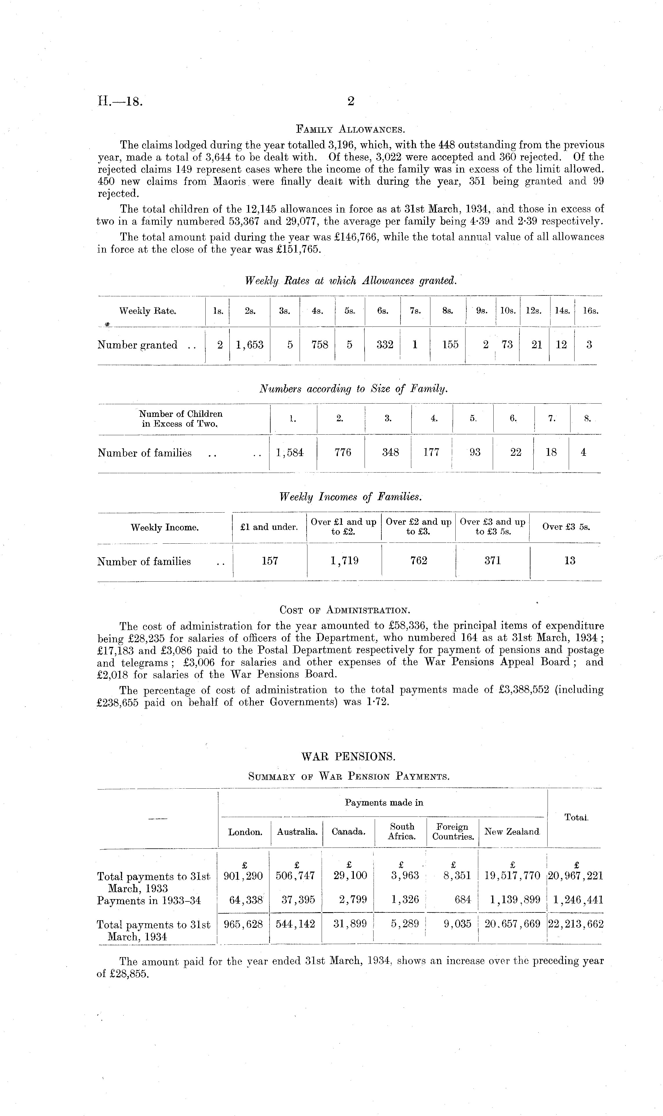 Family Allowances. The claims lodged during the year totalled 3,196, which, with the 448 outstanding from the previous year, made a total of 3,644 to be dealt with. Of these, 3,022 were accepted and 360 rejected. Of the rejected claims 149 represent cases where the income of the family was in excess of the limit allowed. 450 new claims from Maoris were finally dealt with during the year, 351 being granted and 99 rejected. The total children of the 12,145 allowances in force as at 31st March, 1934, and those in excess of two in a family numbered 53,367 and 29,077, the average per family being 4-39 and 2-39 respectively. The total amount paid during the year was £146,766, while the total annual value of all allowances in force at the close of the year was £151,765.