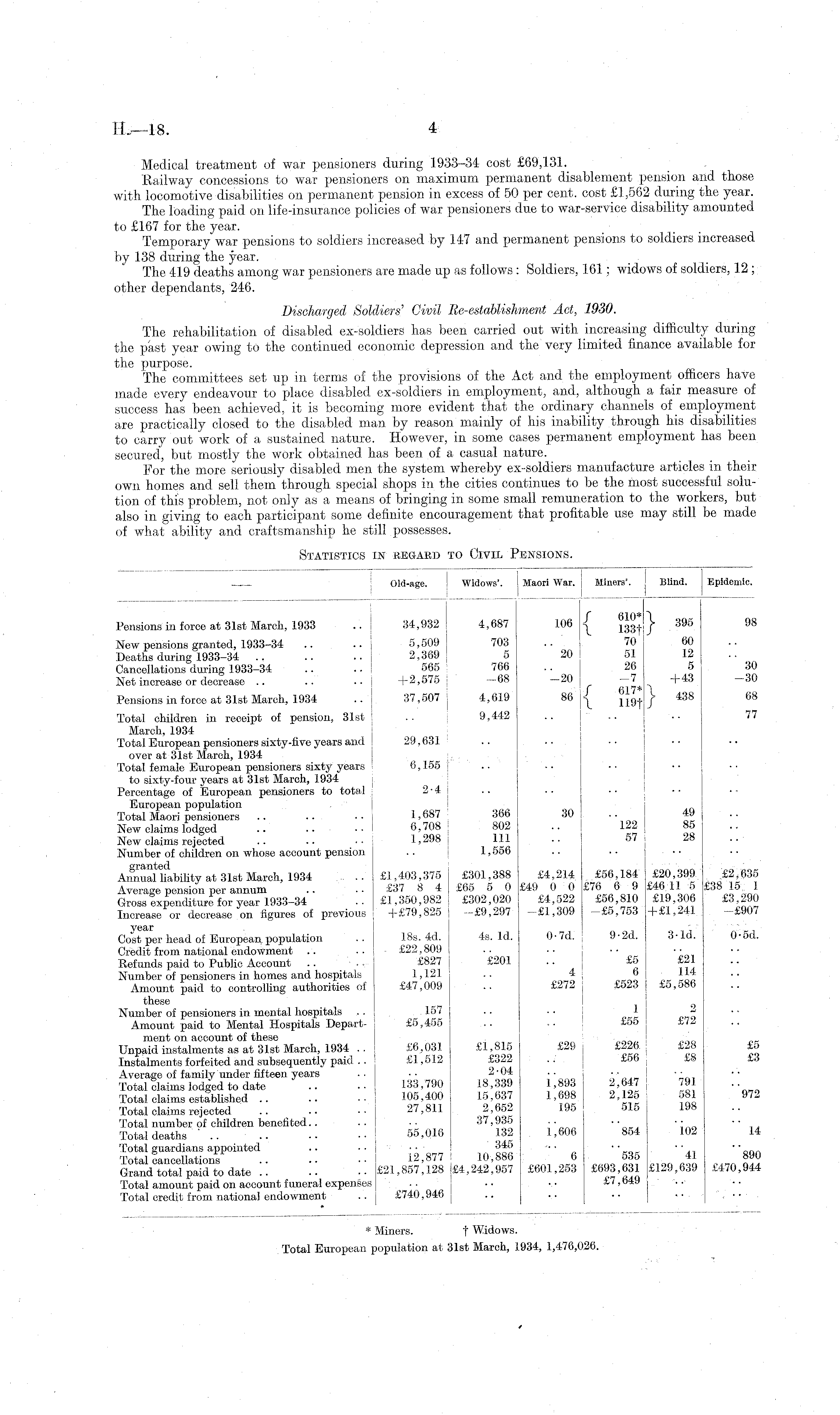 Medical treatment of war pensioners during 1933-34 cost £69,131. Railway concessions to war pensioners on maximum permanent disablement pension and those with locomotive disabilities on permanent pension in excess of 50 per cent, cost £1,562 during the year. The loading paid on life-insurance policies of war pensioners due to war-service disability amounted to £167 for the year. Temporary war pensions to soldiers increased by 147 and permanent pensions to soldiers increased by 138 during the year. The 419 deaths among war pensioners are made up as follows : Soldiers, 161; widows of soldiers, 12 ; other dependants, 246. Discharged Soldiers' Civil Re-establishment Act, 1930. The rehabilitation of disabled ex-soldiers has been carried out with increasing difficulty during the past year owing to the continued economic depression and the very limited finance available for the purpose. The committees set up in terms of the provisions of the Act and the employment officers have made every endeavour to place disabled ex-soldiers in employment, and, although a fair measure of success has been achieved, it is becoming more evident that the ordinary channels of employment are practically closed to the disabled man by reason mainly of his inability through his disabilities to carry out work of a sustained nature. However, in some cases permanent employment has been secured, but mostly the work obtained has been of a casual nature. For the more seriously disabled men the system whereby ex-soldiers manufacture articles in their own homes and sell them through special shops in the cities continues to be the most successful solution of this problem, not only as a means of bringing in some small remuneration to the workers, but also in giving to each participant some definite encouragement that profitable use may still be made of what ability and craftsmanship he still possesses.