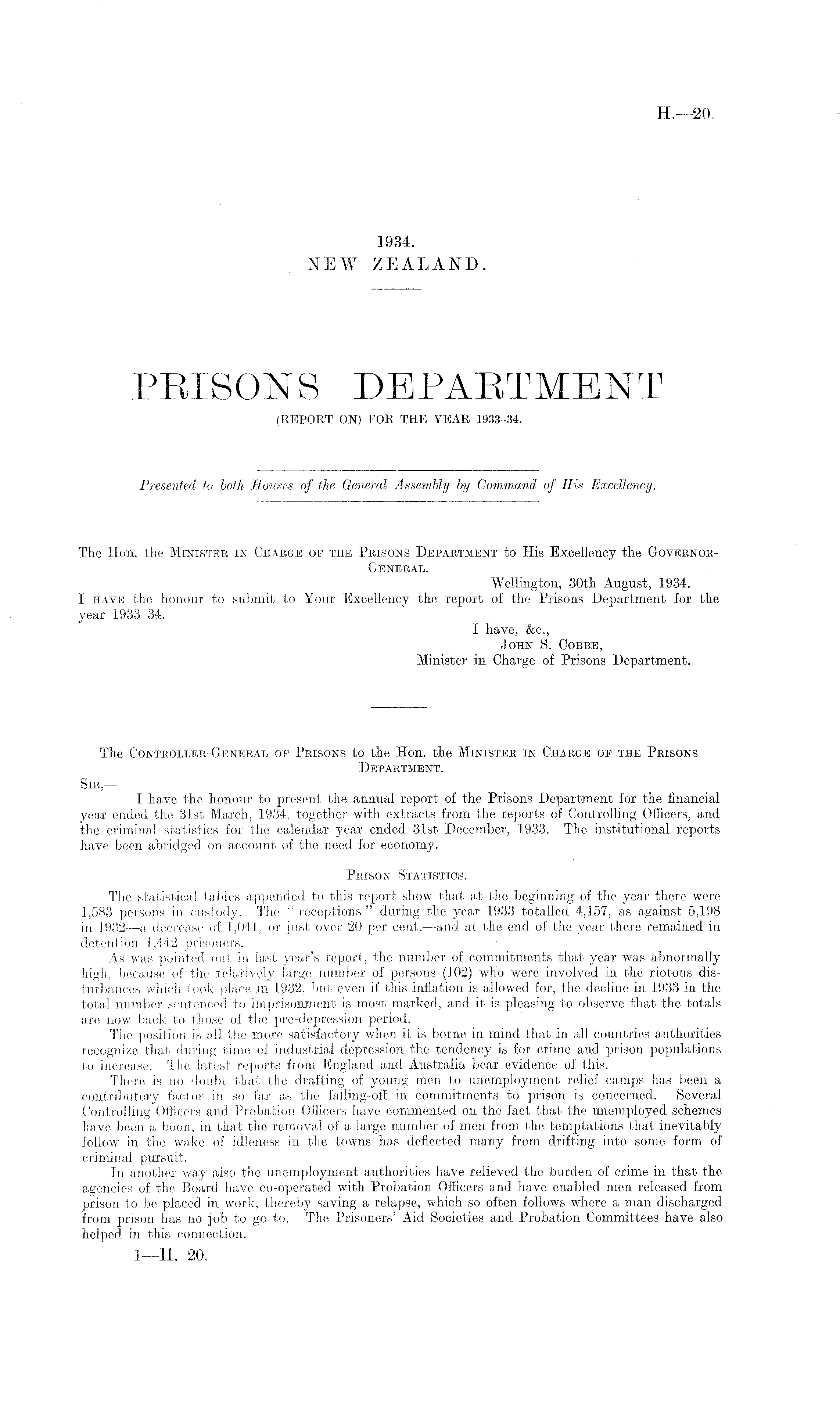 The Controller-General op Prisons to the Hon. the Minister in Charge op the Prisons Department. Sir, — I have the honour to present the annual report of the Prisons Department for the financial year ended the 31st March, 1934, together with extracts from the reports of Controlling Officers, and the criminal statistics for the calendar year ended 31st December, 1933. The institutional reports have been abridged on account of the need for economy. Prison Statistics. The statistical tables appended to this report show that at the beginning of the year there were 1,583 persons in custody. The " receptions " during the year 1933 totalled 4,157, as against 5,198 in 1932—a decrease of 1,041, or just over 20 per cent. —and at the end of the year there remained in detention 1,442 prisoners. As was pointed out in last year's report, the number of commitments that year was abnormally high, because of the relatively large number of persons (102) who were involved in the riotous disturbances which took place in 1932, but even if this inflation is allowed for, the decline in 1933 in the total number sentenced to imprisonment is most marked, and it is pleasing to observe that the totals are now back to those of the pre-depression period. The position is all the more satisfactory when it is borne in mind that in all countries authorities recognize that during time of industrial depression the tendency is for crime and prison populations to increase. The latest reports from England a.nd Australia bear evidence of this. There is no doubt that the drafting of young men to unemployment relief camps has been a contributory factor in so far as the falling-off in commitments to prison is concerned. Several Controlling Officers and Probation Officers have commented on the fact that the unemployed schemes have been a boon, in that the removal of a large number of men from the temptations that inevitably follow in the wake of idleness in the towns has deflected many from drifting into some form of criminal pursuit. In another way also the unemployment authorities have relieved the burden of crime in that the agencies of the Board have co-operated with Probation Officers and have enabled men released from prison to be placed in work, thereby saving a relapse, which so often follows where a man discharged from prison has no job to go to. The Prisoners' Aid Societies and Probation Committees have also helped in this connection.