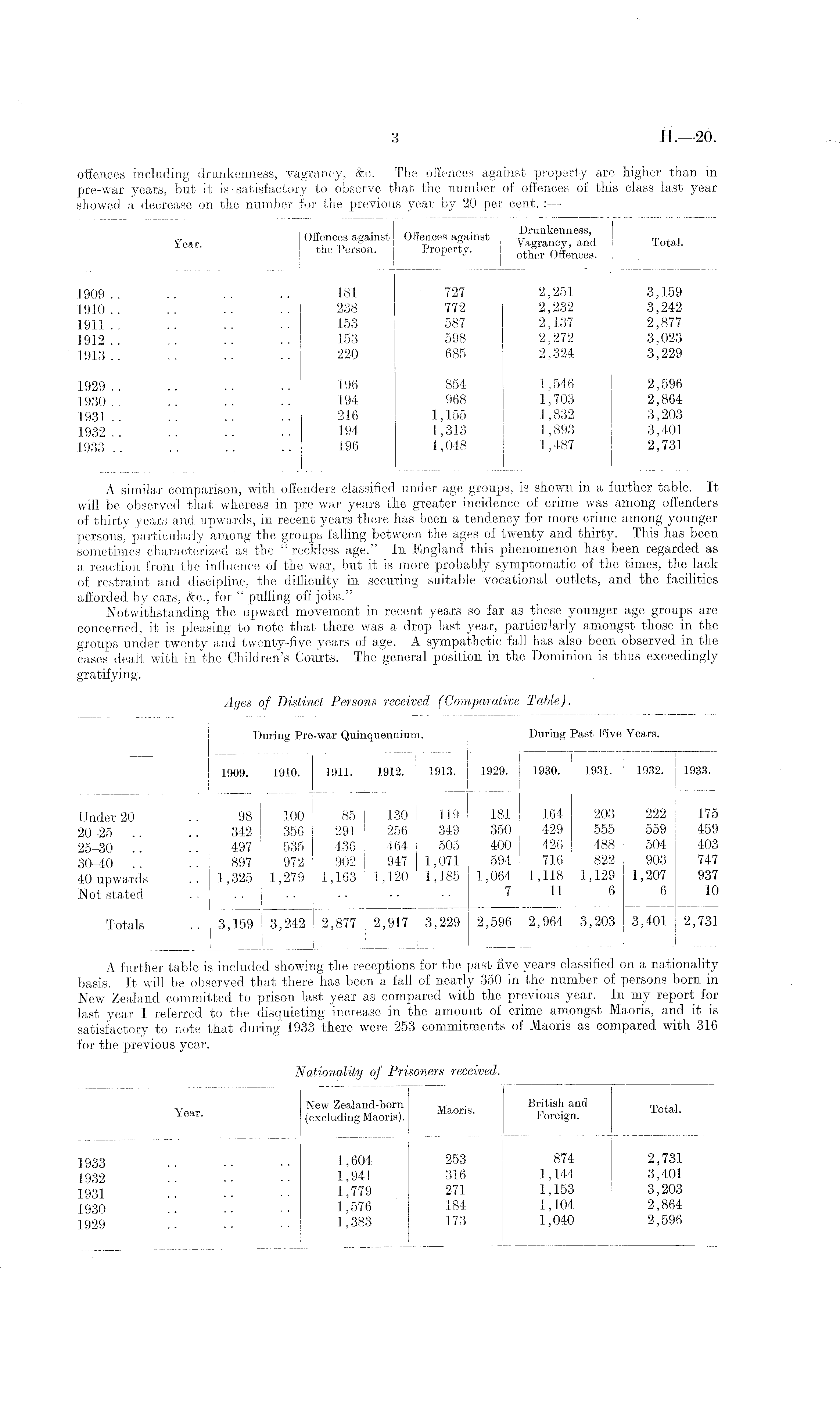 A further table is included stowing the receptions for the past five years classified on a nationality basis. It will be observed that there has been a fall of nearly 350 in the number of persons born in New Zealand committed to prison last year as compared with the previous year. In my report for last year I referred to the disquieting increase in the amount of crime amongst Maoris, and it is satisfactory to note that during 1933 there were 253 commitments of Maoris as compared with 316 for the previous year.