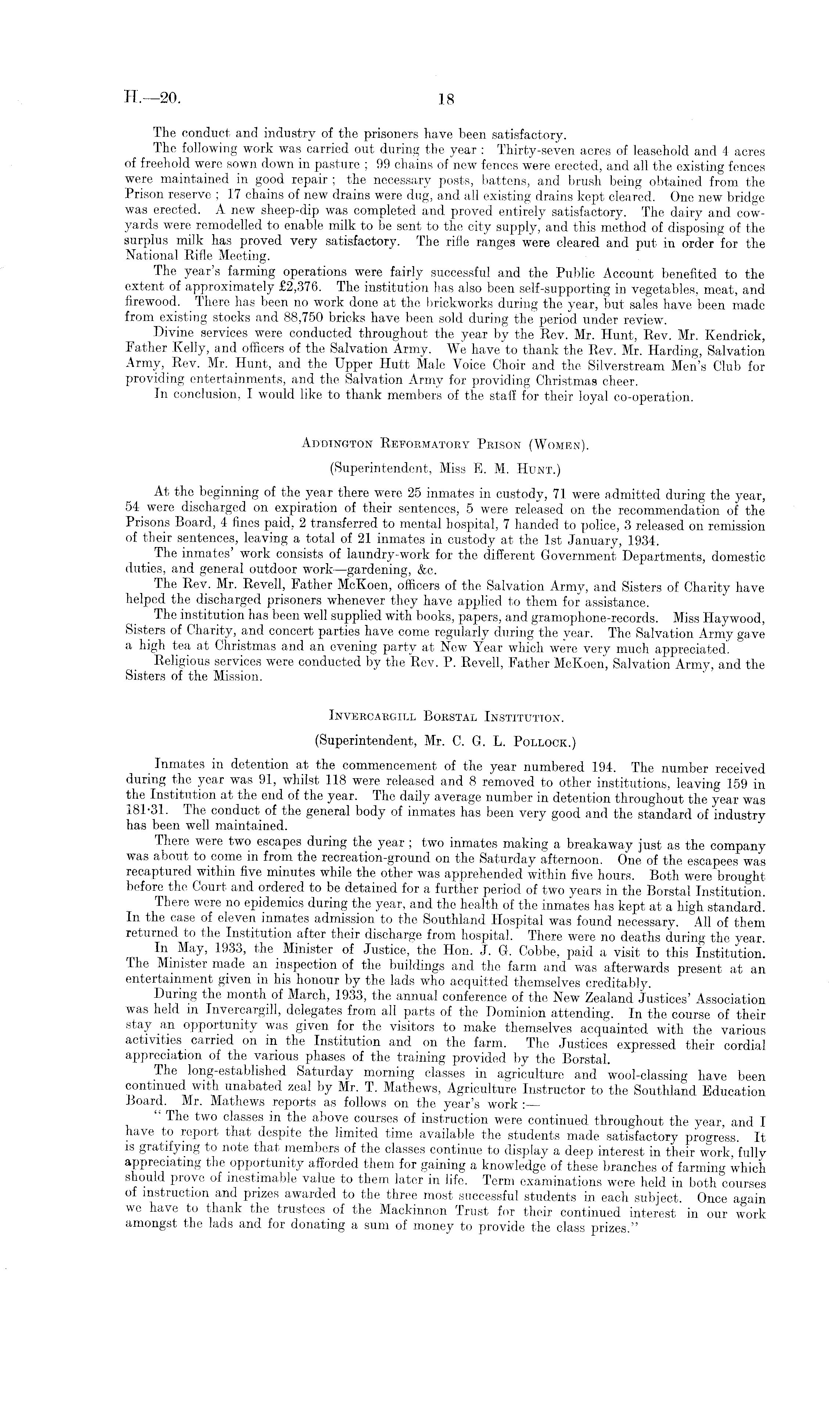 The conduct and industry of the prisoners have been satisfactory. The following work was carried out during the year : Thirty-seven acres of leasehold and 4 acres of freehold were sown down in pasture ; 99 chains of new fences were erected, and all the existing fences were maintained in good repair ; the necessary posts, battens, and brush being obtained from the Prison reserve ; 17 chains of new drains were dug, and all existing drains kept cleared. One new bridge was erected. A new sheep-dip was completed and proved entirely satisfactory. The dairy and cowyards were remodelled to enable milk to be sent to the city supply, and this method of disposing of the surplus milk has proved very satisfactory. The rifle ranges were cleared and put in order for the National Rifle Meeting. The year's farming operations were fairly successful and the Public Account benefited to the extent of approximately £2,376. The institution has also been self-supporting in vegetables, meat, and firewood. There has been no work done at the brickworks during the year, but sales have been made from existing stocks and 88,750 bricks have been sold during the period under review. Divine services were conducted throughout the year by the Rev. Mr. Hunt, Rev. Mr. Kendrick, Father Kelly, and officers of the Salvation Army. We have to thank the Rev. Mr. Harding, Salvation Army, Rev. Mr. Hunt, and the Upper Hutt Male Voice Choir and the Silverstream Men's Club for providing entertainments, and the Salvation Army for providing Christmas cheer. In conclusion, I would like to thank members of the staff for their loyal co-operation. Adbington Reformatory Prison (Women). (Superintendent, Miss E. M. Hunt.) At the beginning of the year there were 25 inmates in custody, 71 were admitted during the year, 54 were discharged on expiration of their sentences, 5 were released on the recommendation of the Prisons Board, 4 fines paid, 2 transferred to mental hospital, 7 handed to police, 3 released on remission of their sentences, leaving a total of 21 inmates in custody at the Ist January, 1934. _ The inmates' work consists of laundry-work for the different Government Departments, domestic duties, and general outdoor work —gardening, &c. The Rev. Mr. Revell, Father McKoen, officers of the Salvation Army, and Sisters of Charity have helped the discharged prisoners whenever they have applied to them for assistance. The institution has been well supplied with books, papers, and gramophone-records. Miss Haywood, Sisters of Charity, and concert parties have come regularly during the vear. The Salvation Army gave a high tea at Christmas and an evening party at New Year which were very much appreciated. Religious services were conducted by the Rev. P. Revell, Father McKoen, Salvation Army, and the Sisters of the Mission. Invercargill Borstal Institution. (Superintendent, Mr. C. G. L. Pollock.) Inmates in detention at the commencement of the year numbered 194. The number received during the year was 91, whilst 118 were released and 8 removed to other institutions, leaving 159 in the Institution at the end of the year. The daily average number in detention throughout the year was 181-31. The conduct of the general body of inmates has been very good and the standard of industry has been well maintained. There were two escapes during the year ; two inmates making a breakaway just as the company was about to come in from the recreation-ground on the Saturday afternoon. One of the escapees was recaptured within five minutes while the other was apprehended within five hours. Both were brought before the Court and ordered to be detained for a further period of two years in the Borstal Institution. There were no epidemics during the year, and the health of the inmates has kept at a high standard! In the case of eleven inmates admission to the Southland Hospital was found necessary. All of them returned to the Institution after their discharge from hospital. There were no deaths during the year. rl the Minister of Justice, the Hon. J. G. Cobbe, paid a visit to this Institution. The Minister made an inspection of the buildings and the farm and was afterwards present at an entertainment given in his honour by the lads who acquitted themselves creditably. During the month of March, 1933, the annual conference of the New Zealand justices' Association was held in Invercargill, delegates from all parts of the Dominion attending. In the course of their stay an opportunity was given for the visitors to make themselves acquainted with the various activities carried on in the Institution and on the farm. The Justices expressed their cordial appreciation of the various phases of the training provided by the Borstal. The long-established Saturday morning classes in agriculture and wool-classing have been continued with unabated zeal by Mr. T. Mathews, Agriculture Instructor to the Southland Education Board. Mr. Mathews reports as follows on the year's work :— The two classes in the above courses of instruction were continued throughout the year, and I have to report that despite the limited time available the students made satisfactory progress. It is gratifying to note that members of the classes continue to display a deep interest in their work, fully appreciating the opportunity afforded them for gaining a knowledge of these branches of farming which should prove of inestimable value to them later in life. Term examinations were held in both courses of instruction and prizes awarded to the three most successful students in each subject. Once again we have to thank the trustees of the Mackinnon Trust for their continued interest in our work amongst the lads and for donating a sum of money to provide the class prizes."