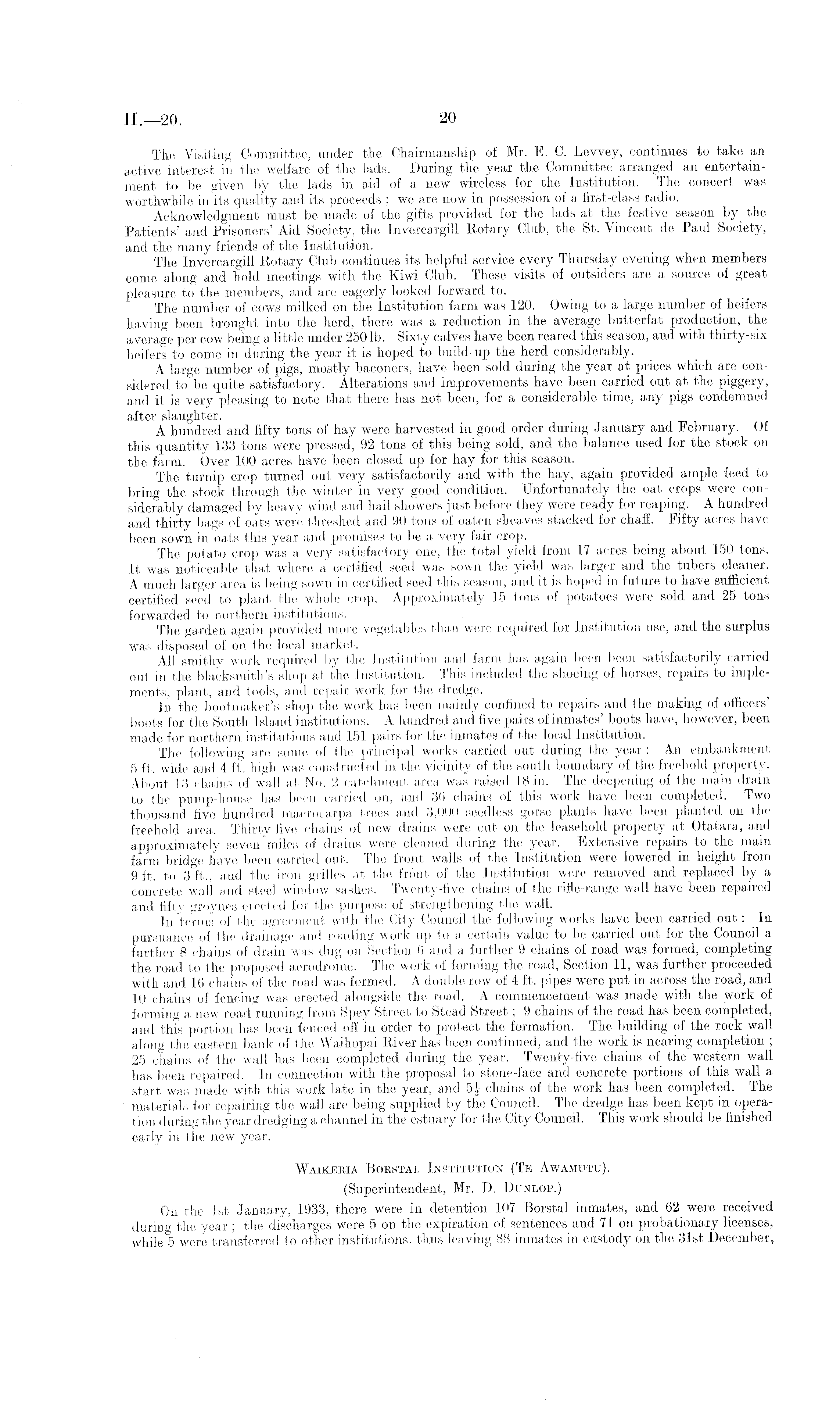 The Visiting Committee, under the Chairmanship of Mr. E. C. Levvey, continues to take an active interest in the welfare of the lads. During the year the Committee arranged an entertainment to be given by the lads in aid of a new wireless for the Institution. Ihe concert was worthwhile in its quality and its proceeds ; we are now in possession of a first-class radio. Acknowledgment must be made of the gifts provided for the lads at the festive season by the Patients' and Prisoners' Aid Society, the Invercargill Rotary Club, the St. Vincent de Paul Society, and the many friends of the Institution. The Invercargill Rotary Club continues its helpful service every Thursday evening when members come along and hold meetings with the Kiwi Club. These visits of outsiders are a source of great pleasure to the members, and are eagerly looked forward to. The number of cows milked on the Institution farm was 120. Owing to a large number of heifers having been brought into the herd, there was a reduction in the average butterfat production, the average per cow being a little under 250 lb. Sixty calves have been reared this season, and with thirty-six heifers to come in during the year it is hoped to build up the herd considerably. A large number of pigs, mostly baconers, have been sold during the year at prices which are considered to be quite satisfactory. Alterations and improvements have been carried out at the piggery, and it is very pleasing to note that there has not been, for a considerable time, any pigs condemned after slaughter. A hundred and fifty tons of hay were harvested in good order during January and February. Of this quantity 133 tons were pressed, 92 tons of this being sold, and the balance used for the stock on the farm. Over 100 acres have been closed up for hay for this season. The turnip crop turned out very satisfactorily and with the hay, again provided ample feed to bring the stock through the winter in very good condition. Unfortunately the oat crops were considerably damaged by heavy wind and hail showers just before they were ready for reaping. A hundred and thirty bags of oats were threshed and 90 tons of oaten sheaves stacked for chafl. Fifty acres have been sown in oats this year and promises to be a very fair crop. The potato crop was a very satisfactory one, the total yield from 17 acres being about 150 tons. It was noticeable that where a certified seed was sown the yield was larger and the tubers cleaner. A much larger area is being sown in certified seed this season, and it is hoped in future to have sufficient certified seed, to plant the whole crop. Approximately 15 tons of potatoes were sold and 25 tons forwarded to northern institutions. The garden again provided more vegetables than were required for Institution use, and the surplus was disposed of on the local market. All smithy work required by the Institution and farm has again been been satisfactorily carried out in the blacksmith's shop at the Institution. This included the shoeing of horses, repairs to implements, plant, and tools, and repair work for the dredge. In the bootmaker's shop the work has been mainly confined to repairs and the making of officers' boots for the South Island institutions. A hundred and five pairs of inmates' boots have, however, been made for northern institutions and 151 pairs for the inmates of the local Institution. The following are some of the principal works carried out during the year : An embankment 5 ft. wide and 4 ft. high was constructed in the vicinity of the south boundary of the freehold property. About 13 chains of wall at No. 2 catchment area was raised 18 in. The deepening of the main drain to the pump-house has been carried on, and 36 chains of this work have been completed. Iwo thousand five hundred maerocarpa trees and 3,000 seedless gorse plants have been planted on the freehold area. Thirty-five chains of new drains were cut on the leasehold property at Otatara, and approximately seven miles of drains were cleaned during the year. Extensive repairs to the main farm bridge liave been carried out. The front walls of the Institution were lowered in height from 9 ft. to 3 ft., and the iron grilles at the front of the Institution were removed and replaced by a concrete wall and steel window sashes. Twenty-five chains of the rifle-range wall have been repaired and fifty groynes erected for the purpose of strengthening the wall. In terms of the agreement with the City Council the following works have been carried out: In pursuance of the drainage and roading work up to a certain value to be carried out for the Council a further 8 chains of drain was dug on Section 6 and a further 9 chains of road was formed, completing the road to the proposed aerodrome. The work of forming the road, Section 11, was further proceeded with and 16 chains of the road was formed. A double row of 4 ft. pipes were put in across the road, and 10 chains of fencing was erected alongside the road. A commencement was made with the work of forming a new road running from Spey Street to Stead Street; 9 chains of the road has been completed, and tins portion has been fenced off in order to protect the formation. The building of the rock wall along the eastern bank of the Waihopai River has been continued, and the work is nearing completion ; 25 chains of the wall has been completed during the year. Twenty-five chains of the western wall has been repaired. In connection with the proposal to stone-face and concrete portions of this wall a start was made with this work late in the year, and 5| chains of the work has been completed. The materials for repairing the wall are being supplied by the Council. The dredge has been kept in operation during the year dredging a channel in the estuary for the City Council. This work should be finished early in the new year. Waikeria Borstal Institution (Te Awamutu). (Superintendent, Mr. D. Dunlop.) On the Ist January, 1933, there were in detention 107 Borstal