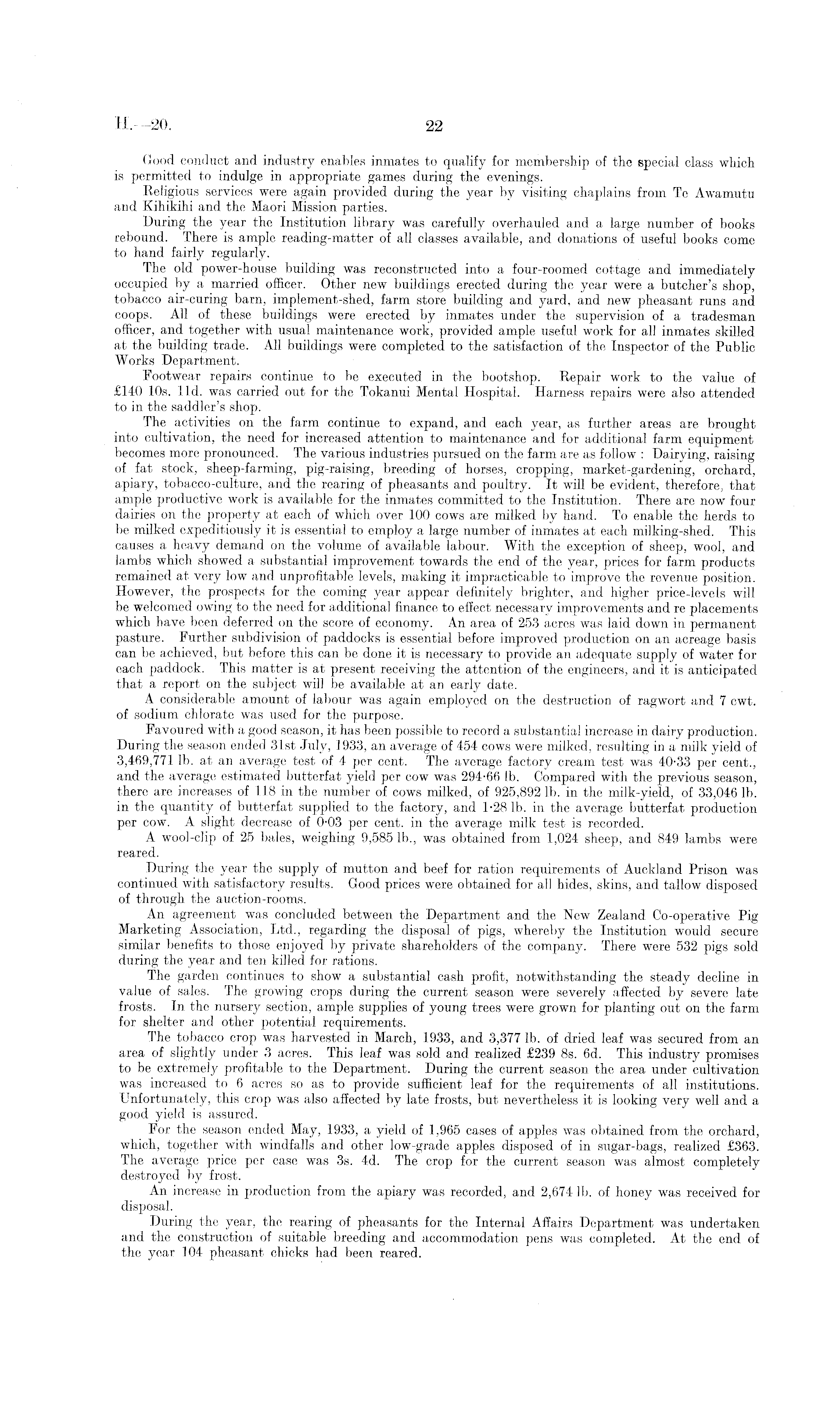 Good conduct and industry enables inmates to qualify for membership of the special class which is permitted to indulge in appropriate games during the evenings. Religious services were again provided during the year by visiting chaplains from Te Awamutu and Kihikihi and the Maori Mission parties. During the year the Institution library was carefully overhauled and a large number of books rebound. There is ample reading-matter of all classes available, and donations of useful books come to hand fairly regularly. The old power-house building was reconstructed into a four-roomed cottage and immediately occupied by a married officer. Other new buildings erected during the year were a butcher's shop, tobacco air-curing barn, implement-shed, farm store building and yard, and new pheasant runs and coops. All of these buildings were erected by inmates under the supervision of a tradesman officer, and together with usual maintenance work, provided ample useful work for all inmates skilled at the building trade. All buildings were completed to the satisfaction of the Inspector of the Public Works Department. Footwear repairs continue to be executed in the bootshop. Repair work to the value of £140 10s. lid. was carried out for the Tokanui Mental Hospital. Harness repairs were also attended to in the saddler's shop. The activities on the farm continue to expand, and each year, as further areas are brought into cultivation, the need for increased attention to maintenance and for additional farm equipment becomes more pronounced. The various industries pursued on the farm are as follow : Dairying, raising of fat stock, sheep-farming, pig-raising, breeding of horses, cropping, market-gardening, orchard, apiary, tobacco-culture, and the rearing of pheasants and poultry. It will be evident, therefore, that ample productive work is available for the inmates committed to the Institution. There are now four dairies on the property at each of which over 100 cows are milked by hand. To enable the herds to be milked expeditiously it is essential to employ a large number of inmates at each milking-shed. This causes a heavy demand on the volume of available labour. With the exception of sheep, wool, and lambs which showed a substantial improvement towards the end of the year, prices for farm products remained at very low and unprofitable levels, making it impracticable to improve the revenue position. However, the prospects for the coming year appear definitely brighter, and higher price-levels will be welcomed owing to the need for additional finance to effect necessary improvements and re placements which have been deferred on the score of economy. An area of 253 acres was laid down in permanent pasture. Further subdivision of paddocks is essential before improved production on an acreage basis can be achieved, but before this can be done it is necessary to provide an adequate supply of water for each paddock. This matter is at present receiving the attention of the engineers, and it is anticipated that a report on the subject will be available at an early date. A considerable amount of labour was again employed on the destruction of ragwort and 7 cwt. of sodium chlorate was used for the purpose. Favoured with a good season, it has been possible to record a substantial increase in dairy production. During the season ended 31st July, 1933, an average of 454 cows were milked, resulting in a milk yield of 3,469,771 lb. at an average test of 4 per cent. The average factory cream test was 40-33 per cent., and the average estimated butterfat yield per cow was 294-66 lb. Compared with the previous season, there are increases of 118 in the number of cows milked, of 925,892 lb. in the milk-yield, of 33,046 lb. in the quantity of butterfat supplied to the factory, and 1-28 lb. in the average butterfat production per cow. A slight decrease of 0-03 per cent, in the average milk test is recorded. A wool-clip of 25 bales, weighing 9,585 lb., was obtained from 1,024 sheep, and 849 lambs were reared. During the year the supply of mutton and beef for ration requirements of Auckland Prison was continued with satisfactory results. Good prices were obtained for all hides, skins, and tallow disposed of through the auction-rooms. An agreement was concluded between the Department and the New Zealand Co-operative Pig Marketing Association, Ltd., regarding the disposal of pigs, whereby the Institution would secure similar benefits to those enjoyed by private shareholders of the company. There were 532 pigs sold during the year and ten killed for rations. The garden continues to show a substantial cash profit, notwithstanding the steady decline in value of sales. The growing crops during the current season were severely affected by severe late frosts. In the nursery section, ample supplies of young trees were grown for planting out on the farm for shelter and other potential requirements. The tobacco crop was harvested in March, 1933, and 3,377 lb. of dried leaf was secured from an area of slightly under 3 acres. This leaf was sold and realized £239 Bs. 6d. This industry promises to be extremely profitable to the Department. During the current season the area under cultivation was increased to 6 acres so as to provide sufficient leaf for the requirements of all institutions. Unfortunately, this crop was also affected by late frosts, but nevertheless it is looking very well and a good yield is assured. For the season ended May, 1933, a yield of 1,965 cases of apples was obtained from the orchard, which, together with windfalls and other low-grade apples disposed of in sugar-bags, realized £363. The average price per case was 3s. 4d. The crop for the current season was almost completely destroyed by frost. An increase in production from the apiary was recorded, and 2,6741b. of honey was received for disposal. During the year, the rearing of pheasants for the Internal Affairs Department was undertaken and the construction of suitable 