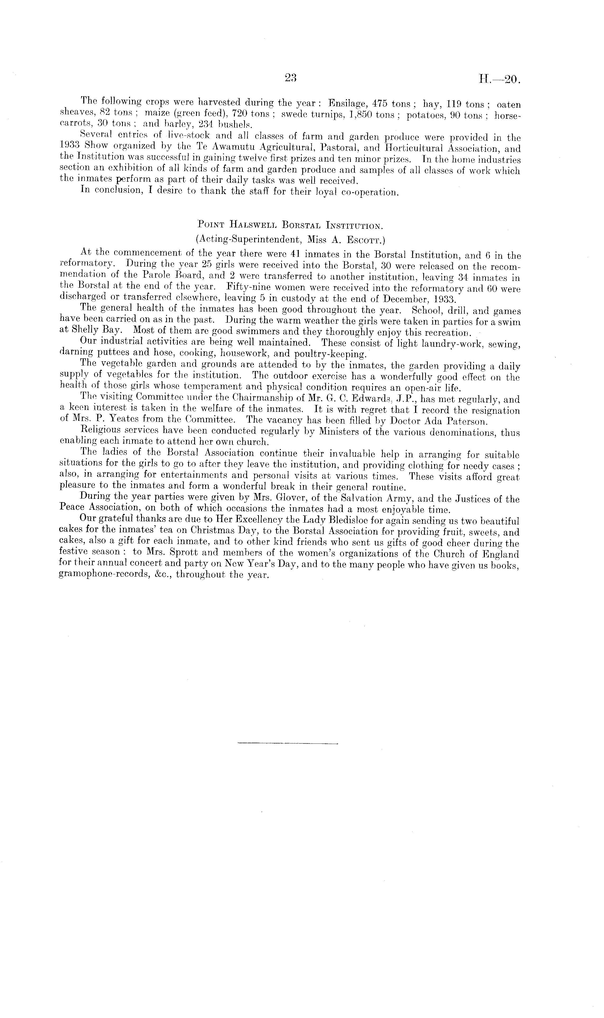 The following crops were harvested during the year : Ensilage, 475 tons ; hay, 119 tons ; oaten sheaves, 82 tons ; maize (green feed), 720 tons ; swede turnips, 1,850 tons ; potatoes,. 90 tons ; horsecarrots, 30 tons ; and barley, 234 bushels. Several entries of live-stock and all classes of farm and garden produce were provided in the 1933 Show organized by the Te Awamutu Agricultural, Pastoral, and Horticultural Association, and the Institution wag successful in gaining twelve first prizes and ten minor prizes. In the home industries section an exhibition of all kinds of farm and garden produce and samples of all classes of work which the inmates perform as part of their daily tasks was well received. In conclusion, I desire to thank the staff for their loyal co-operation. Point Halswell Borstal Institution. (Acting-Superintendent, Miss A. Esoott.) At the commencement of the year there were 41 inmates in the Borstal Institution, and 6 in the reformatory. During the year 25 girls were received into the Borstal, 30 were released on the recommendation of the Parole Board, and 2 were transferred to another institution, leaving 34 inmates in the Borstal at the end of the year. Fifty-nine women were received into the reformatory and 60 were discharged or transferred elsewhere, leaving 5 in custody at the end of December, 1933. The general health of the inmates has been good throughout the year. School, drill, and games have been carried on as in the past. During the warm weather the girls were taken in parties for a swim at Shelly Bay. Most of them are good swimmers and they thoroughly enjoy this recreation. Our industrial activities are being well maintained. These consist of light laundry-work, sewing, darning puttees and hose, cooking, housework, and poultry-keeping. The vegetable garden and grounds a,re attended to by the inmates, the garden providing a daily supply of vegetables for the institution. The outdoor exercise has a wonderfully good effect on the health of those girls whose temperament and physical condition requires an open-air life. The visiting Committee under the Chairmanship of Mr. G. C. Edwards, J.P., has met regularly, and a keen interest is taken in the welfare of the inmates. It is with regret that I record the resignation of Mrs. P. Yeates from the Committee. The vacancy has been filled by Doctor Ada Paterson. Religious services have been conducted regularly by Ministers of the various denominations, thus enabling each inmate to attend her own church. The ladies of the Borstal Association continue their invaluable help in arranging for suitable situations for the girls to go to after they leave the institution, and providing clothing for needy cases ; also, in arranging for entertainments and personal visits at various times. These visits afford great pleasure to the inmates and form a wonderful break in their general routine. During the year parties were given by Mrs. Glover, of the Salvation Army, and the Justices of the Peace Association, on both of which occasions the inmates had a most enjoyable time. Our grateful thanks are due to Her Excellency the Lady Bledisloe for again sending us two beautiful cakes for the inmates tea on Christmas Day, to the Borstal Association for providing fruit, sweets, and cakes, also a gift for each inmate, and to other kind friends who sent us gifts of good cheer during the festive season : to Mrs. Sprott and members of the women's organizations of the Church of England for their annual concert and party on New Year's Day, and to the many people who have given us books, gramophone-records, &c., throughout the year.