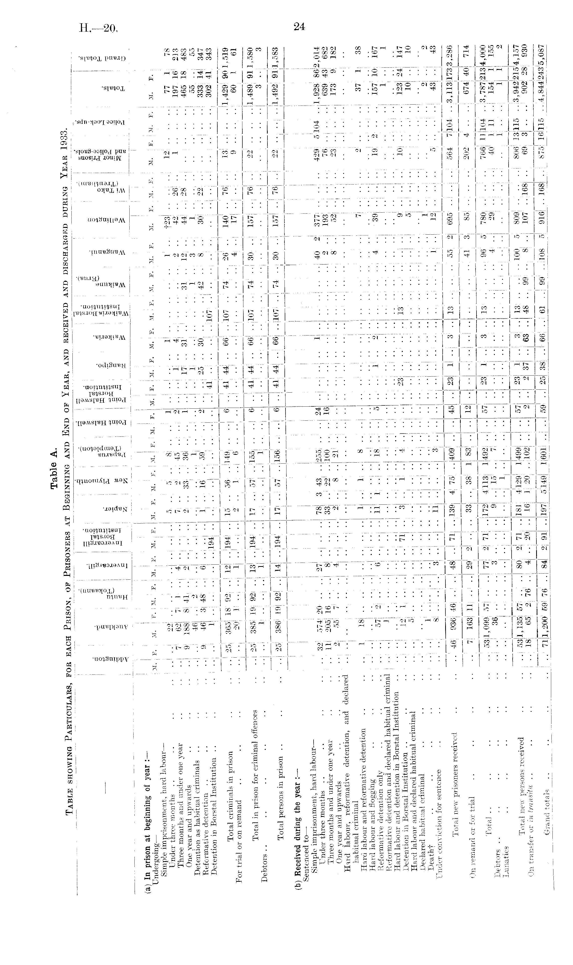 Table A. Table showing Particulars, for each Prison, of Prisoners at Beginning and End of Year, and received and discharged during Year 1933.