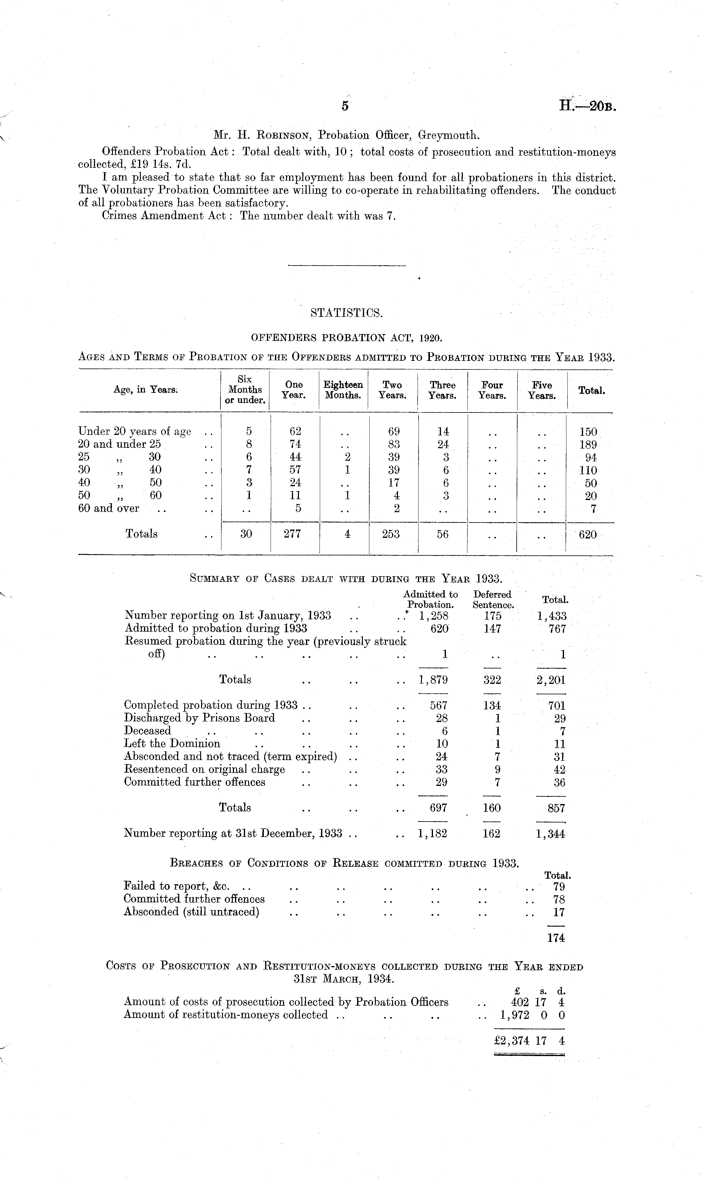 Mr. H. Robinson, Probation Officer, G-reymouth, Offenders Probation Act: Total dealt with, 10 ; total costs of prosecution and restitution-moneys collected, £19 14s. 7d. I am pleased to state that so far employment has been found for all probationers in this district. The Voluntary Probation Committee are willing to co-operate in rehabilitating offenders. The conduct of all probationers has been satisfactory. Crimes Amendment Act: The number dealt with was 7.