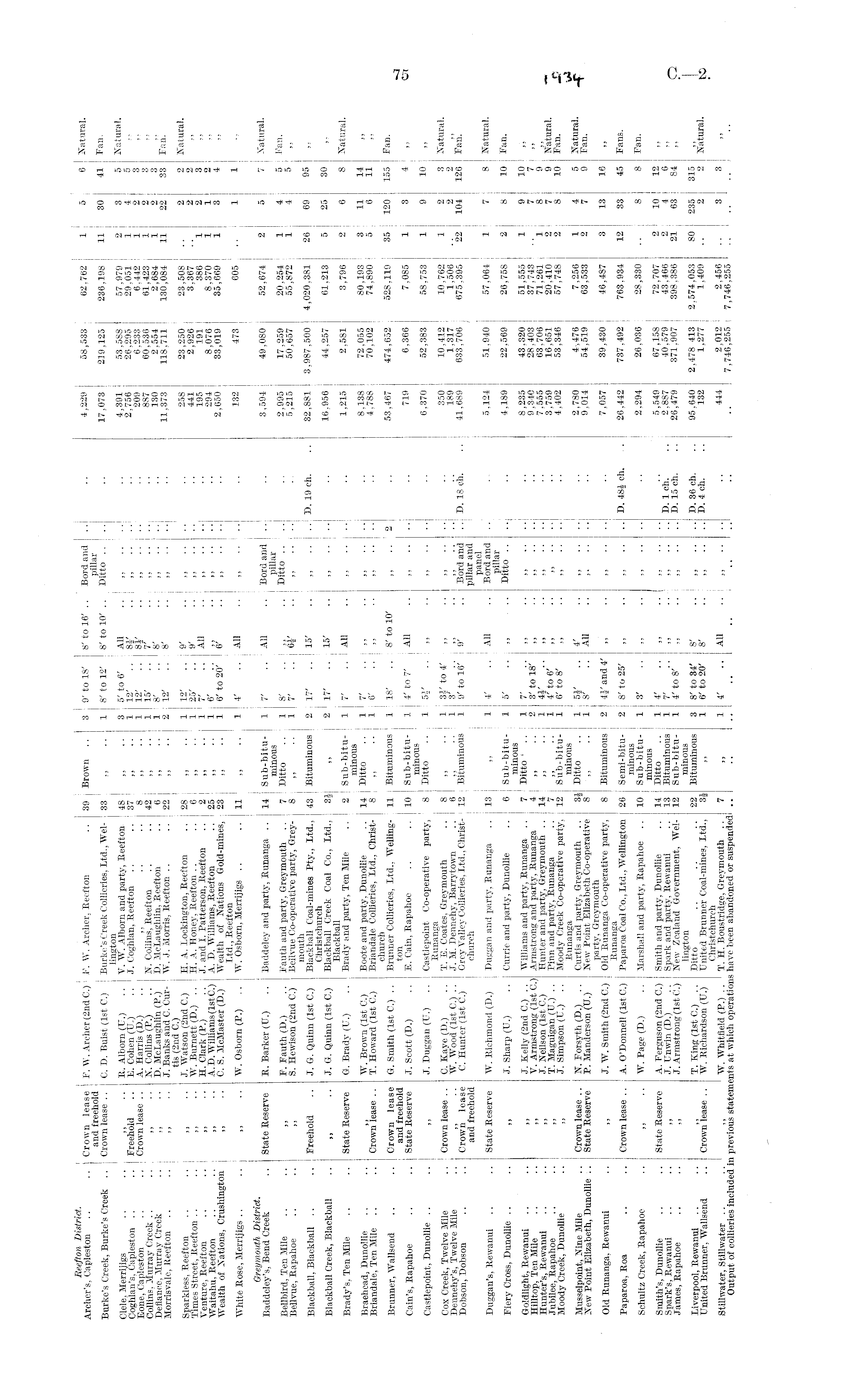 Archer's, Capleston .. .. Crown lease ! F. W. Archer (2nd C.) • F. W. Archer, Reefton .. 39 Brown .. 3 9'to IS' 8'to 16' .. J Bord and .. .. 4,229 58,533 62,762 1 5 6 Natural. Burke's Creek, Burke's Creek .. Crown lease .. C. D. Buist (1st C.) Burke's Creek Collieries, Ltd., Wei- 33 ,, .. 1 8'to 12' 8't.olO',.. Ditto .. .. .. 17,073 219,125 236,198 11 30 41 Fan. Clele, Merrijigs .. .. ,, .. R. Alborn (U.) .. X. W. Alborn and party, Reefton. 48 ,, ..3 5'to 6' All .. 4,391 S'®®® oo'ril? ? J s Natural. Coghlan's, Capleston .. .. Freehold .. E. Cohen (U.) .. J. Coghlan, Reefton .. ..37 „ .. 1 12 .. 81 .. 2,756 } t o Bone, Capleston .. .. Crownlease.. A. Harris (D.) .. „ .. .. 8 „ .. 1 12 .. 81' .. „ .. .. .. 209 6,233 6,442 1 2 8 Collins, Murray Creek .. .. ,, .. N. Collins (P.) .. N. Collins, Reefton .. ..42 ,, 1 15 ..7 .. ,,.... .. 887 J'ts? ī I q Defiance, Murray Creek .. ,, .. D. McLaughlin (P.) D. McLaughlin, Reefton .. 6 ,, .. 1 8' .. 8 .. „ .... .. 130 isn'nal ii 99 4 ir^' Morris vale, Reefton .. .. ,, .. J. Banks and C. Cur- W. J. Morris, Reefton .. ..22 ,, .. 2 12 ..8 .. ,, .... .. 11,373 118,711 130,084 11 22 33 .Ban. tis (2nd C ) Sparkless, Reefton .. .. ,, .. J. Watson (2nd C.) H. A. Lockington, Reefton ..28 ,, .. 1 12' .. 9' .. ,,.... .. 258 23,25 0 2 | = " S I Natural - Times Street, Reefton .. .. „ .. W. Burnett (D.) .. H. A. Honey, Reefton .. .. 6 ,, .. 1 25' .. 9' .. ,, .... .. 441 2,926 3,367 .. 2 i Venture, Reefton .. .. „ .. H. Clark (P.) .. J. and I. Patterson, Reefton .. 2 „ .. 1 7' .. All .. .. 195 191 386 1 2 A Waitahu, Reefton . . .. ,, .. A.D.Williams(lstC.) A. D. Williams, Reefton ..25 ,, ..1 6..,, .. ,,.... .. 294 8,076 8,370 1 1 2,, Wealth of Nations, Crushington ,, .. C. S. McMaster (D.) Wealth of Nations Gold-mines, 23 ,, .. 1 6 to 20 6 .. ,, .... .. 2,650 33,019 35,669 1 3 4,, Ltd., Reefton 1 White Rose, Merrijigs .. .. ,, .. W. Osborn (P.) .. W. Osborn, Merrijigs .. ..11 ,, .. 14' .. All .. ,, .. .. .. 473 ol>5 Baddeley'sfBend Creek .. State Reserve R. Barker (U.) .. Baddeley and party, Runanga .. 14 Sub-bitu- 17' .. All .. Bord and .. .. 3,594 49,080 52,674 2 5 i Natural. minous pillar _ _ _ Bellbird, Ten Mile .. .. ,, F. Fauth (D.) .. Fauth and party, Greymouth .. 7 Ditto .. 1 8' .. ,, .. Ditto .. .. .. ?'o?k ko'IS kk'I»o it*, Bellvue, Rapahoe .. .. ,, S. Hewison (2nd C.) Bellvue Co-operative party, Grey- 8 ,, .. 17 ..6$ .. ,, .... .. 5,215 50,657 55,«7- I * ,, Blackball, Blackball .. .. Freehold .. J. G. Quinn (1st C.) Blackball Coal-mines Pty., Ltd., 43 Bituminous 2 17' .. 15' .. ,, .. .. D. 19 ch. .. 32,881 3,987,500 4,020,381 26 69 95 ,, Blackball Creek, Blackball .. „ .. J. G. Quinn (1st C.) Blackball Creek Coal Co., Ltd., Si „ 2 17' .. 15' .. ,,.... .. 16,956 44,257 61,213 5 25 30 Blackball Brady's, Ten Mile .. .. State Reserve G. Brady (U.) .. Brady and party, Ten Mile .. 2 Sub-bitu- 17' ..All .. ,, .... .. 1,215 2,581 3,796 2 6 8 ISatural. minous I Braehead, Dunollie .. .. „ W. Brown (1st C.) Boote and party, Dunollie .. 14 Ditto .. 17' .. ,, .. ,, .... .. 8,138 i?'?™ f « ii " Briandale, Ten Mile .. .. Crownlease.. T. Howard (1st C.) Briandale Collieries, Ltd., Christ- 8 ,, •• 16' .. ,, .. ,,.... .. 4,788 7U,l0z 74,syu 5 t> ,, church i I Brunner, Wallsend .. .. Crown lease G. Smith (1st C.) .. Brunner Collieries, Ltd., Welling- 11 Bituminous 1 j 18' .. : 8'to 10' ,, ..2 .. 53,46; 474,652 528,119 35 120 155 Fan. and freehold ton Cain's, Rapahoe .. .. State Reserve J. Scott (D.) .. E. Cain, Rapahoe .. ..10 Sub-bitu- 1 4'to 7' All .. ,, .... .. '19 6,366 7,085 1 3 ,, minous Castlepoint, Dunollie .. .. ,, J. Duggan (U.) .. Castlepoint Co-operative party, 8 Ditto ..15$' .. ,, .. ,, .. •• •• 6,370 52,383 58,753 1 9 10 ,, Cox Creek, Twelve Mile .. Crownlease.. C. Kaye (D.) .. T. E. Coates, Greymouth .. 8 ,, I 1 3|'to4' „ .. ,, .. .. .. 350 1 o o Natural * Dennehy's, Twelve Mile .. ,, .. W. Wood (1st C.) .. J. M. Dennehy, Barrytown .. 6 ,, : 1 3' .. | ,, .. ,, .. .. .. 189 a'tJ'oar 'ôo ioa Dobs on, Dobs on .. .. Crown lease C. Hunter (1st C.) Grey \ alley Collieries, Ltd., Christ- 12 Bituminous j 1 9 to 16 ; 9 .. Bord and .. D. 18 ch. .. 41,689 633, /06 675. 39o 22 104 126 Ian. and freehold church j j pillar and | panel j Duggan's, Rewanui .. .. State Reserve W. Richmond (D.) Duggan and party, Runanga ..13 ,, 14' .. All .. Bord and . 5,124 51,940 57,064 1 7 8 Natural. ! pillar j Fiery Cross, Dunollie .. .. ,, J. Sharp (U.) .. Currie and party, Dunollie .. 6 Sub-bitu- ; 1 5' .. ,, .. Ditto .. .. .. 4,189 22,569 26,758 2 8 10 Fan. minous i Goldlight, Rewanui .. .. ,, J. Kelly (2nd C.) .. Williams and party, Runanga .. 7 Ditto 4 .. j 1 7' .. ,, .. ,, .... .. 8,235 43,320 1 % 2 Hilltop, Ten Mile .. .. ,, V. Armstrong (1st C.) Armstrong and party, Runanga 4 ,, .. \ 2 3 to 18 ,, .. ,, .... .. 9,340 -8,403 <17,743 • . 7 7 Hunter's, Rewanui .. .. ,, J. Neilson (1st C.) Hunter and party, Greymouth ..14 ,, .. 1 4i •• •• 7,555 on'??n I § q isr Q '+,ir«i Jubilee, Rapahoe .. .. ,, T. Maguigan (U.) .. Pinn and party, Runanga .. 7 . 1 4 to 6 ,, .. ,, .. 3,759 16,651 20,410 2 7 9 Natural. Moody Creek, Dunollie .. ,, J. Simpson (U.) .. Moody Creek Co-operative party, 12 Sub-bitu- 1 6 to 8 ,, .. ,,.... .. 4,402 53,346 57,748 2 8 10 -ban. Runanga minous Musselpoint, Nine Mile .. Crownlease.. N. Forsyth (D.) .. Curtis and party, Greymouth .. 3£ Ditto .. 1 5|' 4' .. ,, .... .. K Miīi «o? oS i £ a atural * New Point Elizabeth, Dunollie .. State Reserve P. Manderson (U.) New Point Elizabeth Co-operative 8 ,, .. 18' .. All .. .. 9,014 54,519 63,533 7 J Ian. Old Runanga, Rewanui .. ,, J. W. Smith (2nd C.) Old Runanga Co-operative party, 8 Bituminous | 2 4|' and 4' ,, .. ,, .... .. 7,057 39,430 46,487 3 13 16 ,, Paparoa, Roa .. .. Crownlease.. A. O'Donnell (lstC.) Paparoa Coal Co., Ltd., Wellington 26 Semi-bitu- 2 8'to 25' ,, .. ,, .. .. D. 48$ ch. . . 26,442 737,492 763,934 12 33 45 Fans. minous Schultz Creek, Rapahoe 