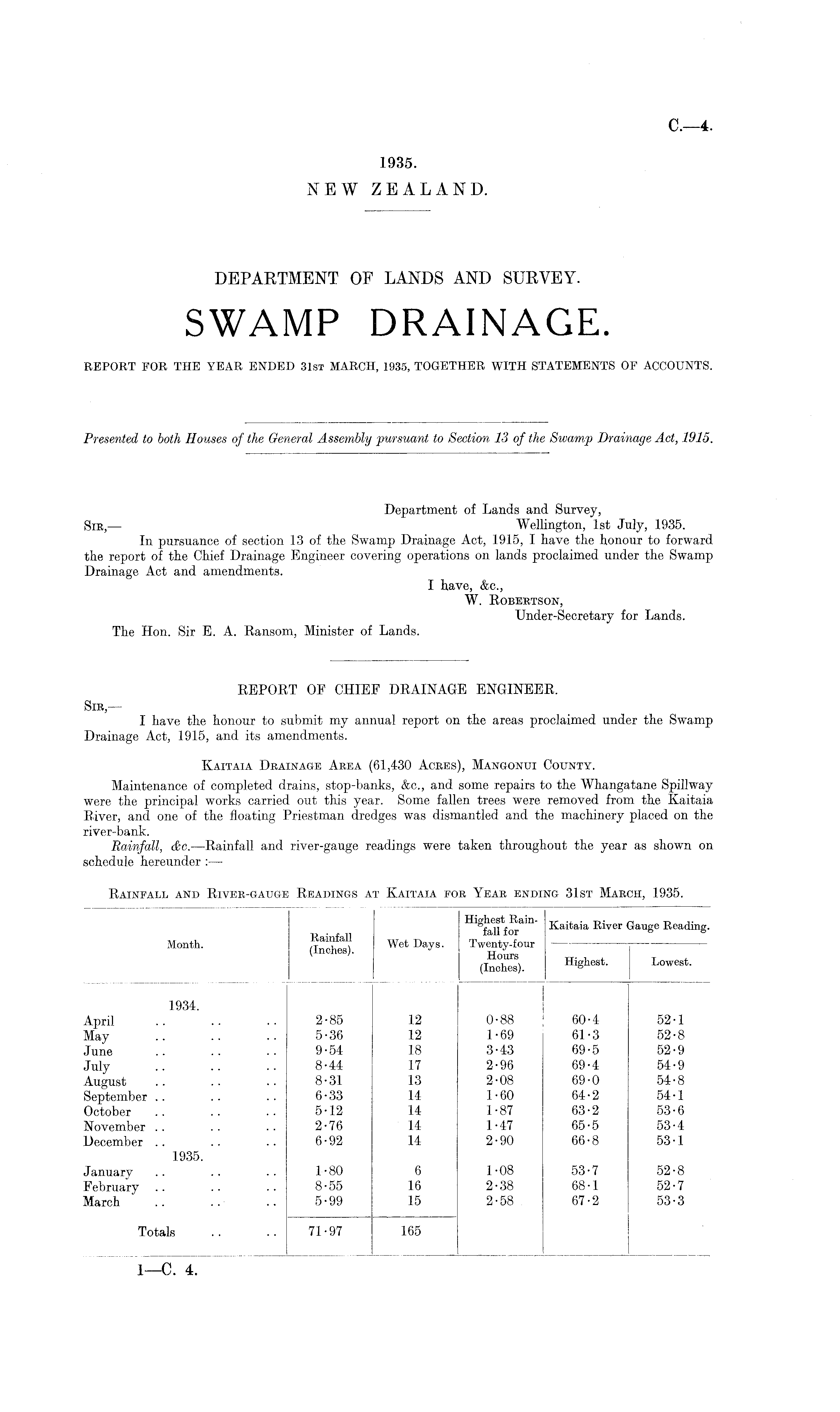 Department of Lands and Survey, Sir, —• Wellington, Ist July, 1935. In pursuance of section 13 of the Swamp Drainage Act, 1915, I have the honour to forward the report of the Chief Drainage Engineer covering operations on lands proclaimed under the Swamp Drainage Act and amendments. I have, &c., W. Robertson, Under-Secretary for Lands. The Hon. Sir E. A. Ransom, Minister of Lands.