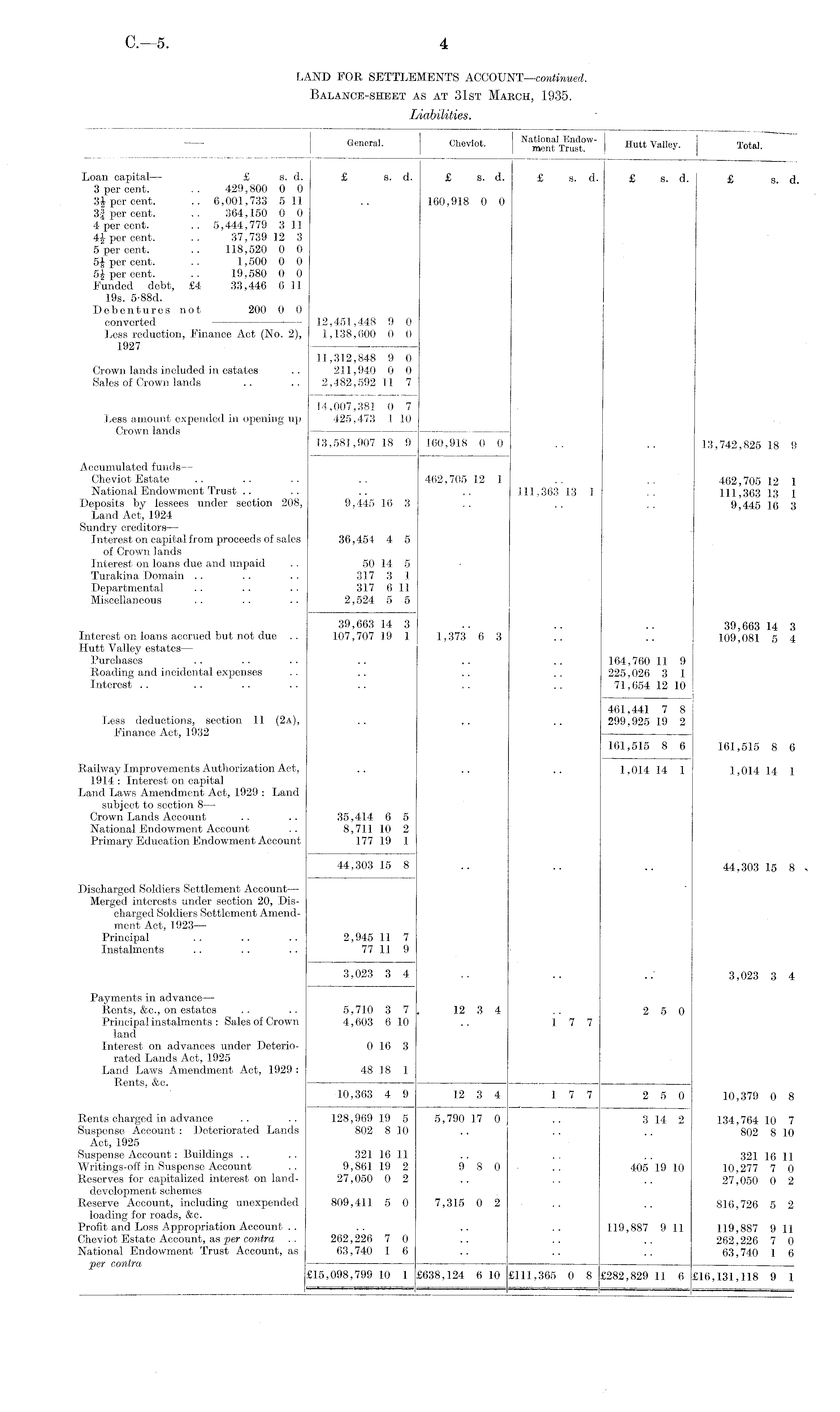 Liabilities. General. Cheviot. Hutt VaIIe y- T ° tal - Loan capital— £ s. d. £ s. d. £ s. d. £ s. d. £ s. d. £ s. d. 3 per cent. .. 429,800 0 0 3J per cent. .. 6,001,733 5 11 .. 160,918 0 0 3J per cent. .. 364,150 0 0 4 per cent. .. 5,444,779 3 11 4J per cent. .. 37,739 12 3 5 per cent. .. 118,520 0 0 5£ per cent. .. 1,500 0 0 5J per cent. .. 19,580 0 0 Funded debt, £4 33,446 6 11 19s. 5'88d. Debentures not 200 0 0 converted 12,451,448 9 0 Less reduction, Finance Act (No. 2), 1,138,600 0 0 1927 11,312,848 9 0 Crown lands included in estates .. 211,940 0 0 Sales of Crown lands .. .. 2,482, 592 11 7 14,007,381 0 7 Jjess amount expended in opening up 425,473 I !0 Crown lands 5 13,581,907 18 9 160,918 0 0 .. .. 13,742,825 18 9 Accumulated funds — Cheviot Estate .. .. .. .. 462,705 12 1 .. .. 462,705 12 1 National Endowment Trust .. .. .. .. 111,363 13 1 .. 111,363 13 1 Deposits by lessees under section 208, 9,445 16 3 .. .. . 9 445 jq 3 Land Act, 1924 Sundry creditors — Interest on capital from proceeds of sales 36,454 4 5 of Crown lands Interest on loans due and unpaid .. 50 14 5 Turakina Domain .. .. .. 317 3 1 Departmental . . .. .. 317 6 11 Miscellaneous .. .. .. 2,524 5 5 39,663 14 3 .. .. .. 39,663 14 3 Interest on loans accrued but not due .. 107,707 19 1 1,373 6 3 .. .. 109,081 5 4 Hutt Valley estates — Purchases .. .. .. .. .. .. 164,760 11 9 Roading and incidental expenses .. .. .. .. 225,026 3 1 Interest .. .. .. .. .. .. .. 71,654 12 10 461,441 7 8 Less deductions, section 11 (2a), .. ... .. 299,925 19 2 Finance Act, 1932 161,515 8 6 161,515 8 6 Railway Improvements Authorization Act, .. .. .. 1.014 14 1 1,014 14 1 1914 : Interest on capital Land Laws Amendment Act, 1929 : Land subject to section 8— Crown Lands Account .. .. 35,414 6 5 National Endowment Account .. 8,711 10 2 Primary Education Endowment Account 177 19 1 44,303 15 § .. .. .. 44,303 15 8 Discharged Soldiers Settlement Account — Merged interests under section 20, Discharged Soldiers Settlement Amendment Act, 1923 — Principal .. .. .. 2,945 11 7 Instalments .. .. .. 77 11 9 3,023 3 4 .. .. .; 3,023 3 4 Payments in advance — Rents, &.C., on estates .. .. 5,710 3 7, 12 3 4 .. 2 5 0 Principal instalments: Sales of Crown 4,603 6 10 .. 1 7 7 land Interest on advances under Deterio- 0 16 3 rated Lands Act, 1925 Land Laws Amendment Act, 1929 : 48 18 1 Rents, &c. 10,363 49 12 34 1 77 250 10,379 0 8 Rents charged in advance .. .. 128,969 19 5 5,790 17 0 .. 3 14 2 134,764 10 7 Suspense Account : Deteriorated Lands 802 8 10 .. .. .. 802 8 10 Act, 1925 Suspense Account: Buildings .. .. 321 16 11 .. .. .. 321 16 11 Writings-off in Suspense Account .. 9,861 19 2 9 8 0 .. 405 19 10 10,277 7 0 Reserves for capitalized interest on land- 27,050 0 2 .. .. .. 27,050 0 2 development schemes Reserve Account, including unexpended 809,411 5 0 7,315 0 2 .. .. 816,726 5 2 loading for roads, &c. Profit and Loss Appropriation Account . . .. .. .. 119,887 9 11 119,887 9 11 Cheviot Estate Account, as per contra . . 262,226 7 0 .. .. .. 262,226 7 0 National Endowment Trust Account, as 63,740 1 6 .. .. .. 63,740 1 6 per contra —— — £15,098,799 10 1 £638,124 6 10 £111,365 0 8 £282,829 II 6 £16,131,118 9 I