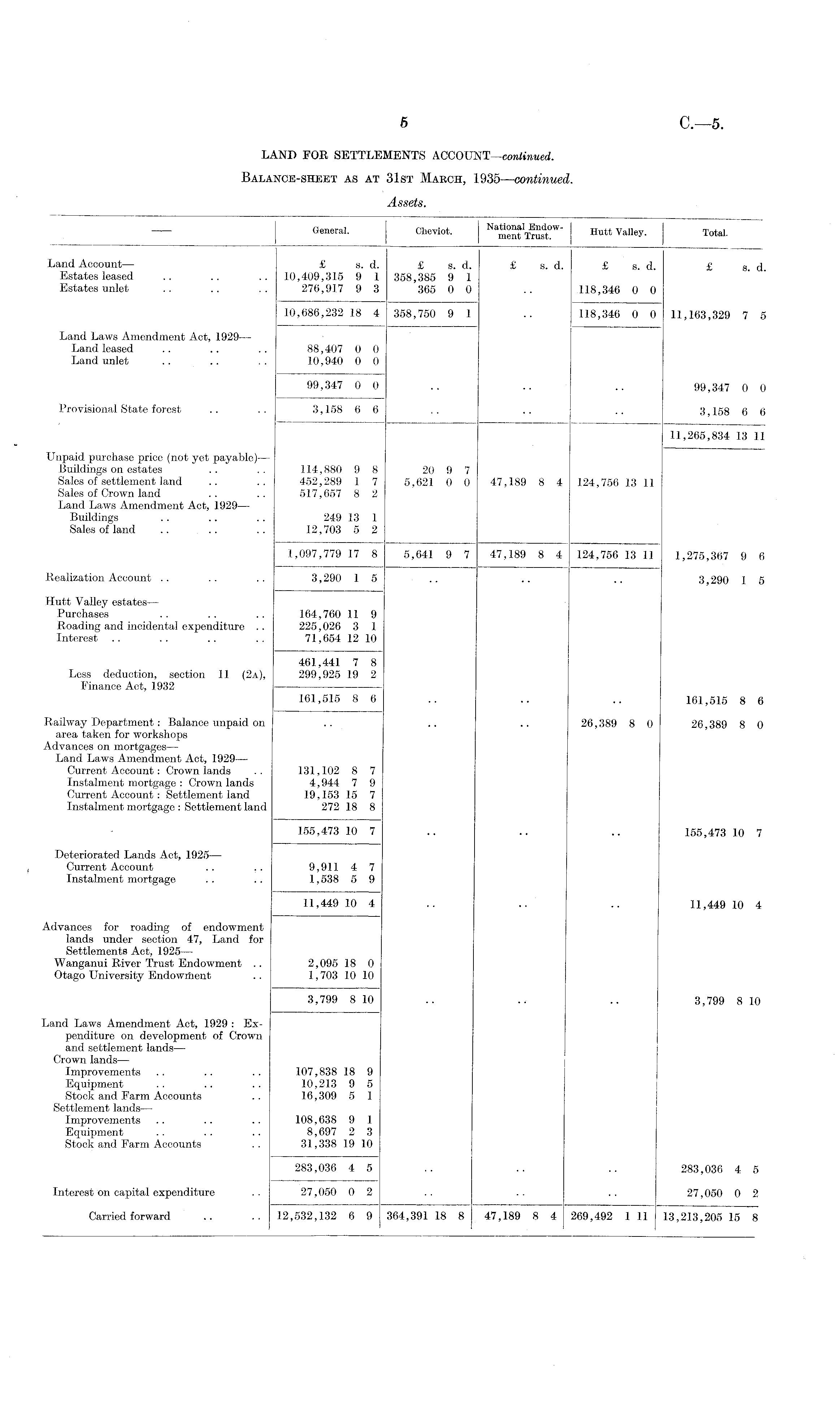 Assets. General. Cheviot. Hutt Valle y- Total - Land Account — £ s. d. £ s. d. £ s. d. £ s. d. £ 8 . d. Estates leased .. .. .. 10,409,315 9 1 358,385 9 1 Estates unlet .. .. .. 276,917 .9 3 365 0 0 .. 118,346 0 0 10,686,232 18 4 358,750 9 1 .. 118,346 0 0 11,163,329 7 5 Land Laws Amendment Act, 1929— Land leased .. .. .. 88,407 0 0 Land unlet .. .. .. 10,940 0 0 99,347 0 0 .. .. .. 99,347 0 0 Provisional State forest .. .. 3,158 6 6 .. .. .. 3 158 6 6 11,265,834 13 11 Unpaid purchase price (not yet payable)— Buildings on estates .. .. 114,880 9 8 20 9 7 Sales of settlement land .. .. 452,289 1 7 5,621 0 0 47,189 8 4 124,756 13 11 Sales of Crown land .. .. 517,657 8 2 Land Laws Amendment Act, 1929 — Buildings .. .. .. 249 13 1 Sales of land .. .. .. 12,703 5 2 1,097,779 17 8 5,641 9 7 47,189 8 4 124,756 13 11 1,275,367 9 6 Realization Account .. .. .. 3,290 1 5 .. .. .. 3,290 1 5 Hutt Valley estates— Purchases .. .. .. 164,760 11 9 Roading and incidental expenditure .. 225,026 3 1 Interest .. .. .. .. 71,654 12 10 461,441 7 8 Less deduction, section 11 (2a), 299,925 19 2 Finance Act, 1932 161,515 8 6 .. .. .. 161,515 8 6 Railway Department: Balance unpaid on .. .. .. 26,389 8 0 26,389 8 0 area taken for workshops Advances on mortgages — Land Laws Amendment Act, 1929— Current Account: Crown lands .. 131,102 8 7 Instalment mortgage : Crown lands 4,944 7 9 Current Account: Settlement land 19,153 15 7 Instalment mortgage : Settlement land 272 18 8 155,473 10 7 .. .. .. 155,473 10 7 Deteriorated Lands Act, 1925 — Current Account .. .. 9,911 4 7 Instalment mortgage .. .. 1,538 5 9 11,449 10 4 .. .. .. 11,449 10 4 Advances for roading of endowment lands under section 47, Land for Settlements Act, 1925— Wanganui River Trust Endowment .. 2,095 18 0 Otago University Endowment .. 1,703 10 10 3,799 8 10 .. .. 3,799 8 10 Land Laws Amendment Act, 1929 : Expenditure on development of Crown and settlement lands— Crown lands — Improvements .. .. .. 107,838 18 9 Equipment .. .. .. 10,213 9 5 Stock and Farm Accounts .. 16,309 5 1 Settlement lands — Improvements .. .. .. 108,638 9 1 Equipment .. .. .. 8,697 2 3 Stock and Farm Accounts .. 31,338 19 10 283,036 4 5 .. .. .. 283,036 4 5 Interest on capital expenditure . . 27,050 0 2 . . .. . . 27,050 0 2 Carried forward .. .. 12,532,132 6 9 364,391 18 8 47,189 8 4 269,492 111 13,213,205 15 8