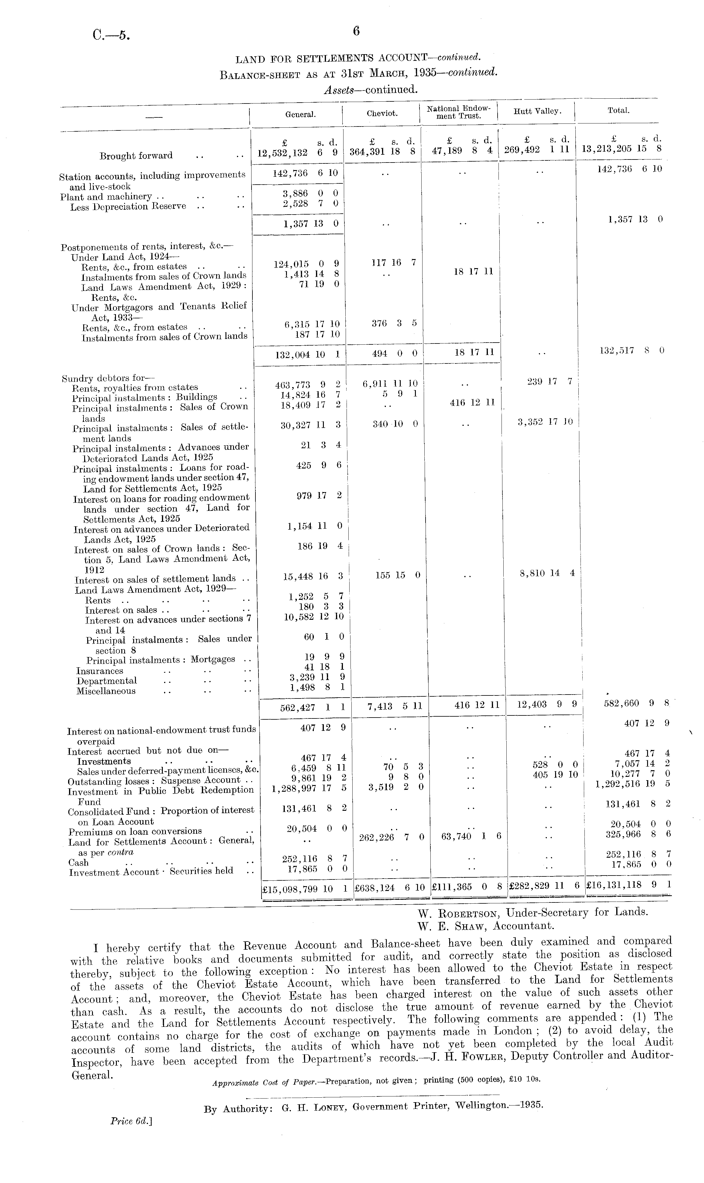 W. Robertson, Under-Secretary for Lands. W. E. Shaw, Accountant. I hereby certify that the Revenue Account and Balance-sheet have been duly examined and compared with the relative books and documents submitted for audit, and correctly state the position as _ disclosed thereby, subject to the following exception: No interest has been allowed to the Cheviot Estate m respect of the assets of the Cheviot Estate Account, which have been transferred to the Land for Settlements Account; and, moreover, the Cheviot Estate has been charged interest on the value of such assets other than cash. As a result, the accounts do not disclose the true amount of revenue earned by the Cheviot Estate and the Land for Settlements Account respectively. The following comments are appended: (1) The account contains no charge for the cost of exchange on payments made m London ; (2) to avoid de ay the accounts of some land districts, the audits of which have not yet been completed by the local Audit Inspector, have been accepted from the Department's records.-J. H. Fowler, Deputy Controller and AuditorGeneral.