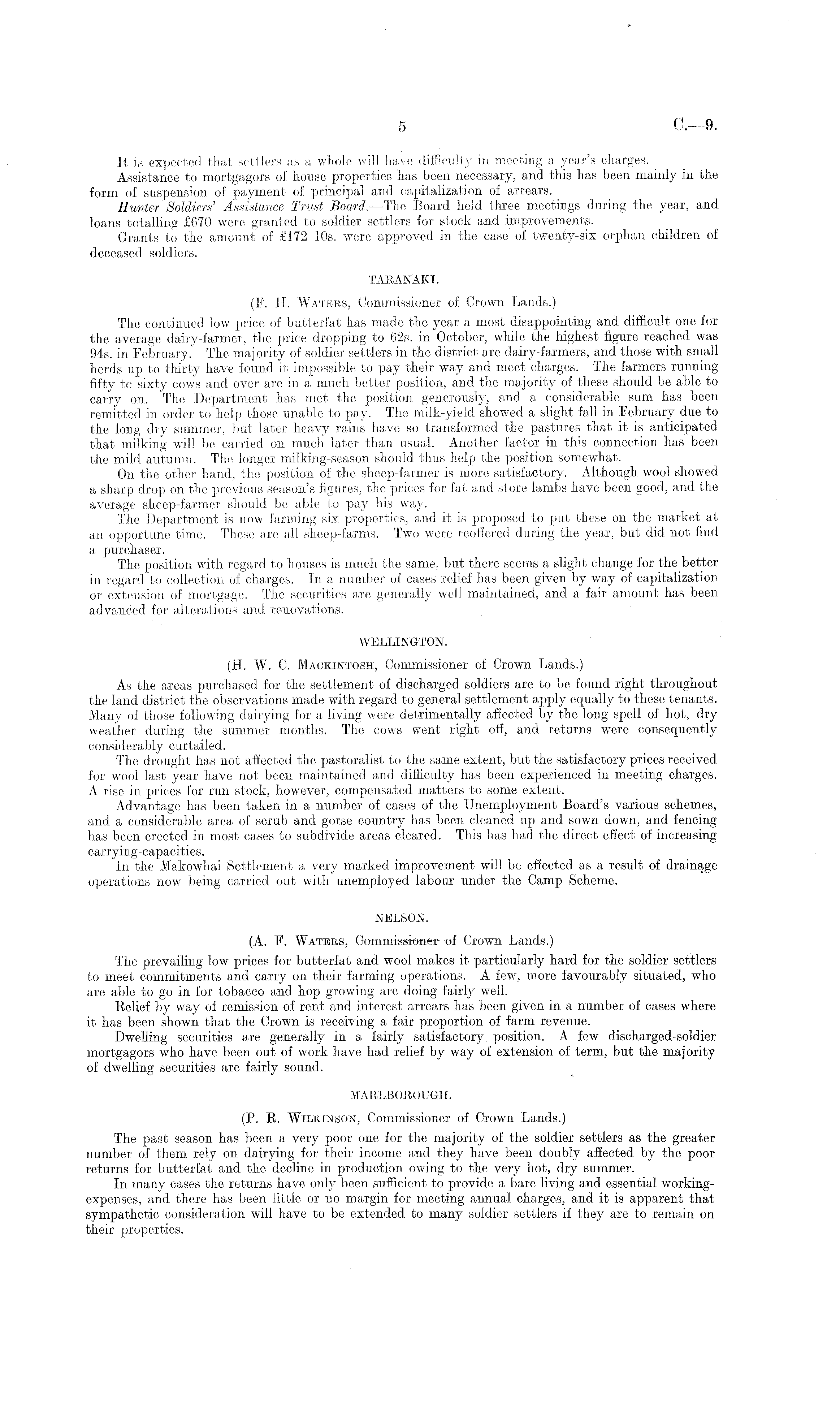It is expected that settlers as a whole will have difficulty in meeting a year's charges. Assistance to mortgagors of house properties has been necessary, and this has been mainly in the form of suspension of payment of principal and capitalization of arrears. Hunter Soldiers' Assistance Trust Board. —The Board held three meetings during the year, and loans totalling £670 were granted to soldier settlers for stock and improvements. Grants to the amount of £172 10s. were approved in the case of twenty-six orphan children of deceased soldiers. TARANAKI. (F. H. Wateks, Commissioner of Crown Lands.) The continued low price of butterfat has made the year a most disappointing and difficult one for the average dairy-farmer, the price dropping to 625. in October, while the highest figure reached was 945. in February.' The majority of soldier settlers in the district are dairy-farmers, and those with small herds up to thirty have found it impossible to pay their way and meet charges. The farmers running fifty to sixty cows and over are in a much better position, and the majority of these should be able to carry on. The Department has met the position generously, and a considerable sum has been remitted in order to help those unable to pay. The milk-yield showed a slight fall in February due to the long dry summer, but later heavy rains have so transformed the pastures that it is anticipated that milking will be carried on much later than usual. Another factor in this connection has been the mild autumn. The longer milking-season should thus help the position somewhat. On the other hand, the position of the sheep-farmer is more satisfactory. Although wool showed a sharp drop on the previous season's figures, the prices for fat and store lambs have been good, and the average sheep-farmer should be able to pay his way. The Department is now farming six properties, and it is proposed to put these on the market at an opportune time. These are all sheep-farms. Two were reoflered during the year, but did not find a purchaser. The position with regard to houses is much the same, but there seems a slight change for the better in regard to collection of charges. In a number of cases relief has been given by way of capitalization or extension of mortgage. The securities are generally well maintained, and a fair amount has been advanced for alterations and renovations. WELLINGTON. (H. W. C. Mackintosh, Commissioner of Crown Lands.) As the areas purchased for the settlement of discharged soldiers are to be found right throughout the land district the observations made with regard to general settlement apply equally to these tenants. Many of those following dairying for a living were detrimentally affected by the long spell of hot, dry weather during the summer months. The cows went right off, and returns were consequently considerably curtailed. The drought has not affected the pastoralist to the same extent, but the satisfactory prices received for wool last year have not been maintained and difficulty has been experienced in meeting charges. A rise in prices for run stock, however, compensated matters to some extent. Advantage has been taken in a number of cases of the Unemployment Board's various schemes, and a considerable area of scrub and gorse country has been cleaned up and sown down, and fencing has been erected in most cases to subdivide areas cleared. This has had the direct effect of increasing carrying-capacities. In the Makowhai Settlement a very marked improvement will be effected as a result of drainage operations now being carried out with unemployed labour under the Camp Scheme. NELSON. (A. F. Watees, Commissioner-of Crown Lands.) The prevailing low prices for butterfat and wool makes it particularly hard for the soldier settlers to meet commitments and carry on their farming operations. A few, more favourably situated, who are able to go in for tobacco and hop growing are doing fairly well. Relief by way of remission of rent and interest arrears has been given in a number of cases where it has been shown that the Crown is receiving a fair proportion of farm revenue. Dwelling securities are generally in a fairly satisfactory, position. A few discharged-soldier mortgagors who have been out of work have had relief by way of extension of term, but the majority of dwelling securities are fairly sound. MARLBOROUGH:. (P. R. Wilkinson, Commissioner of Crown Lands.) The past season has been a very poor one for the majority of the soldier settlers as the greater number of them rely on dairying for their income and they have been doubly affected by the poor returns for butterfat and the decline in production owing to the very hot, dry summer. In many cases the returns have only been sufficient to provide a bare living and essential workingexpenses, and there has been little or no margin for meeting annual charges, and it is apparent that sympathetic consideration will have to be extended to many soldier settlers if they are to remain on their properties.