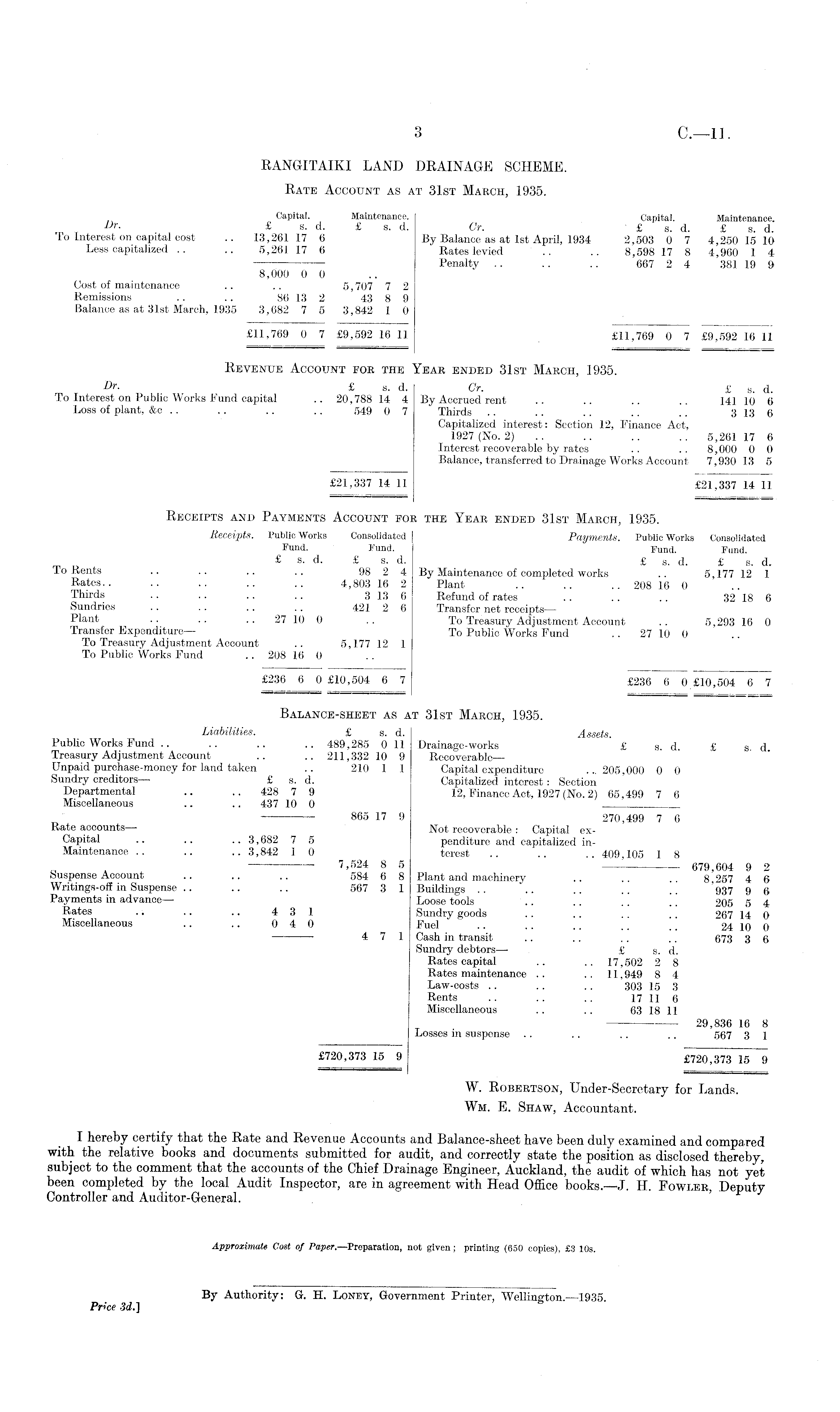 RANGITAIKI LAND DRAINAGE SCHEME. Rate Account as at 31st March, 1935. Capital. Maintenance. Capital. Maintenance. Dr - £ s. d. £ s. d. Cr. £ s. d. £ s. d. To Interest on capital cost .. 13,261 17 6 By Balance as at Ist April, 1934 2,503 0 7 4,250 15 10 Less capitalized .. .. 5,261 17 6 Rates levied .. .. 8,598 17 8 4,960 1 4 Penalty .. .. .. 667 2 4 381 19 9 8,000 0 0 Cost of maintenance .. .. 5,707 7 2 Remissions .. .. 86 13 2 43 8 9 Balance as at 31st March, 1935 3,682 7 5 3,842 1 0 £11,769 0 7 £9,592 16 II £11,769 0 7 £9,592 16 11 Revenue Account for the Year ended 31st March, 1935. Dr. £ s. d. Cr. £ s . d. To Interest on Public Works Fund capital .. 20,788 14 4 By Accrued rent .. .. .. .. 141 10 6 Loss of plant, &c .. .. .. .. 549 0 7 Thirds .. .. .. .. .. 313 6 Capitalized interest: Section 12, Finance Act, 1927 (No. 2) .. .. . . 5,261 17 6 Interest recoverable by rates .. .. 8,000 0 0 Balance, transferred to Drainage Works Account 7,930 13 5 £21,337 14 11 Receipts and Payments Account for the Year ended 31st March, 1935. Receipts. Public Works Consolidated Payments. Public Works Consolidated Fund. Fund. Fund. Fund. £ s. d. £ s. d. £ s. d. £ s. d. To Rents .. .. .. .. 98 2 4 By Maintenance of completed works .. 5,177 12 1 R ates.. .. .. .. .. 4,803 16 2 Plant .. .. .. 208 16 0 Thirds .. .. .. .. 3 13 6 Refund of rates .. .. .. 32 18 6 Sundries .. .. .. .. 421 2 6 Transfer net receipts— Plant •• •• 27 10 0 .. To Treasury Adjustment Account .. 5,293 16 0 Transfer Expenditure— To Public Works Fund .. 27 10 0 To Treasury Adjustment Account .. 5,177 12 1 To Public Works Fund .. 208 16 0 £236 6 0 £10,504 6 7 £236 6 0 £10,504 6 7 Balance-sheet as at 31st March, 1935. Liabilities. £ s. d. Assets. Public Works Fund .. .. .. .. 489,285 0 11 Drainage-works £ s. d. £ s d Treasury Adjustment Account .. .. 211,332 10 9 Recoverable — Unpaid purchase-money for land taken .. 210 1 1 Capital expenditure ...205,000 0 0 Sundry creditors— £ s. d. Capitalized interest : Section Departmental .. .. 428 7 9 12, Finance Act, 1927 (No. 2) 65.499 7 6 Miscellaneous .. .. 437 10 0 865 17 9 270,499 7 6 Rate accounts —■ Not recoverable : Capital exCapital .. .. .. 3,682 7 5 penditure and capitalized inMaintenance .. .. .. 3,842 1 0 terest .. .. .. 409,105 1 8 7,524 8 5 679,604 9 2 Suspense Account .. .. .. 584 6 8 Plant and machinery .. .. . . 8 257 4 6 Writings-off in Suspense .. .. .. 567 3 1 Buildings .. .. .. .. .. 937 9 6 Payments in advance— Loose tools .. .. . . .. 205 5 4 Bates .. .. .. 4 3 1 Sundry goods .. .. .. .. 267 14 0 Miscellaneous .. .. 0 4 0 Fuel " .. .. .. .. .. 24 10 0 4 7 1 Cash in transit .. .. . . .. 673 3 6 Sundry debtors— £ s. d. Rates capital .. .. 17,502 2 8 Rates maintenance .. . . 11.949 8 4 Law-costs .. .. . . 303 15 3 Rents .. . . .. 17 11 6 Miscellaneous .. .. 63 18 11 29,836 16 8 Losses in suspense .. .. .. .. 567 3 1 £720,373 15 9 £720,373 15 9 W. Robertson, Under-Secretary for Lands. Wm. E. Shaw, Accountant. I hereby certify that the Rate and Revenue Accounts and Balance-sheet have been duly examined and compared with the relative books and documents submitted for audit, and correctly state the position as disclosed thereby, subject to the comment that the accounts of the Chief Drainage Engineer, Auckland, the audit of which has not yet been completed by the local Audit Inspector, are in agreement with Head Office books.—J. H. Fowler, Deputy Controller and Auditor-General.