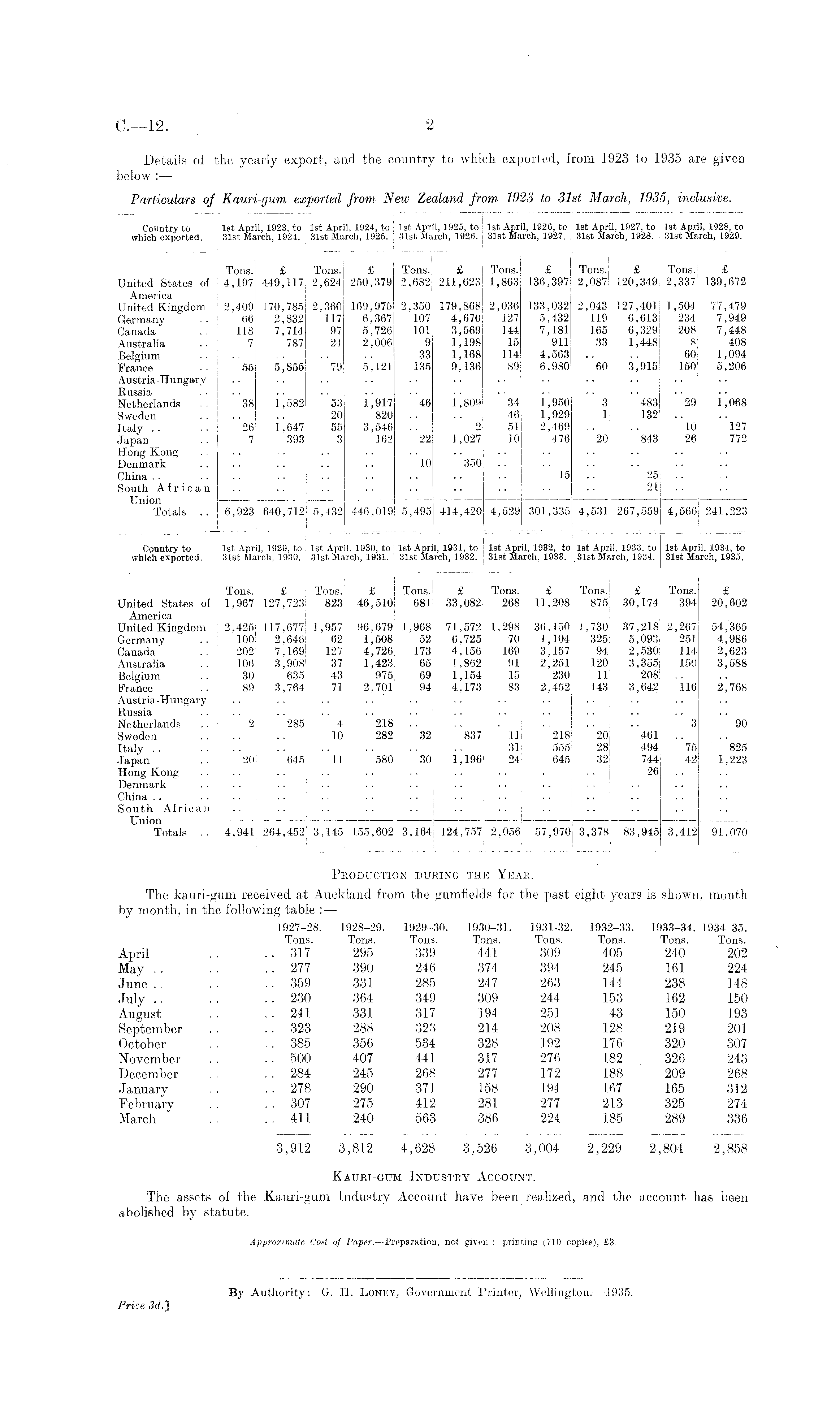 Particulars of Kauri-gum exported from New Zealand from 1923 to 31st March, 1935, inclusive.