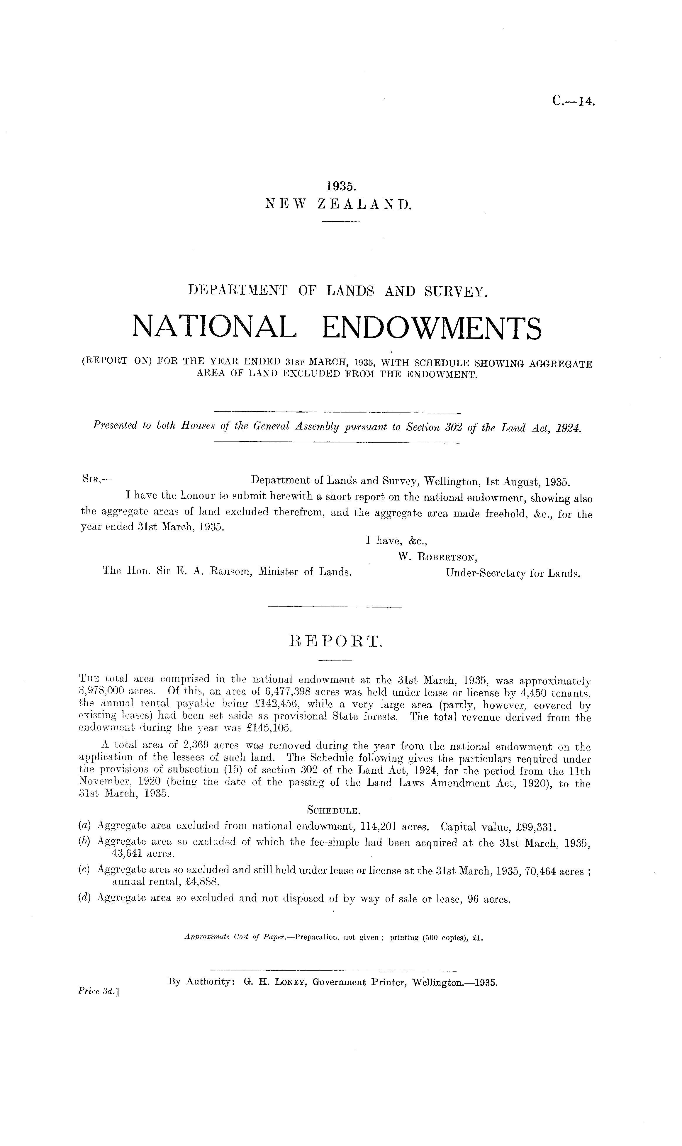 DEPARTMENT OF LANDS AND SURVEY. NATIONAL ENDOWMENTS (REPORT ON) FOR THE YEAR ENDED 31st MARCH, 1935, WITH SCHEDULE SHOWING AGGREGATE AREA OF LAND EXCLUDED FROM THE ENDOWMENT.
