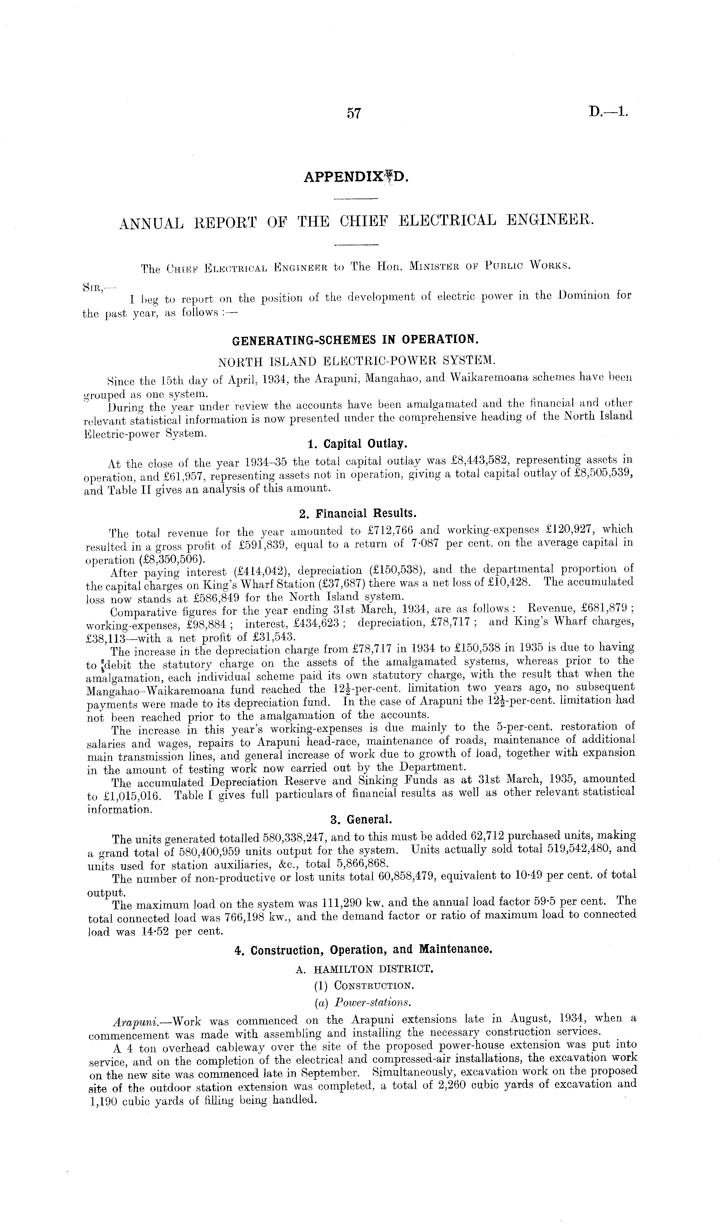 The Chief Electrical Engineer to The Hon. Minister of Public Works. gj-jj I beg to report on the position of the development of electric power in the Dominion for the past year, as follows : —• GENERATING-SCHEMES IN OPERATION. NORTH ISLAND ELECTRIC-POWER SYSTEM. Since the 15th day of April, 1.934, the Arapuni, Mangahao, and Waikaremoana schemes have been grouped as one system. During the year under review the accounts have been amalgamated and the financial and other relevant statistical information is now presented under the comprehensive heading of the North Island Electric-power System. 1. Capital Outlay. At the close of the year 1934-35 the total capital outlay was £8,443,582, representing assets in operation, and £61,957, representing assets not in operation, giving a total capital outlay of £8,505,539, and Table II gives an analysis of this amount. 2. Financial Results. The total revenue for the year amounted to £712,766 and working-expenses £120,927, which resulted in a gross profit of £591,839, equal to a return of 7-087 per cent, on the average capital in operation (£8,350,506). After paying interest (£414,042), depreciation (£150,538), and the departmental proportion of the capital charges on King's Wharf Station (£37,687) there was a net loss of £10,428. The accumulated loss now stands at £586,849 for the North Island system. Comparative figures for the year ending 31st March., 1934, are as follows .* Revenue, £681,879 , working-expenses, £98,884 ; interest, £434,623 ; depreciation, £78,717 , and King s Wharf charges, £38,113 —with a net profit of £31,543. The increase in the depreciation charge from £78,717 in 1934 to £150,538 in 1935 is due to having to fdebit the statutory charge on the assets of the amalgamated systems, whereas prior to the amalgamation, each individual scheme paid its own statutory charge, with the result that when the Mangahao-Waikaremoana fund reached the 12i-per-cent. limitation two years ago, no subsequent payments were made to its depreciation fund. In the case of Arapuni the limitation had not been reached prior to the amalgamation of the accounts. The increase in this year's working-expenses is due mainly to the 5-per-cent. restoration of salaries and wages, repairs to Arapuni head-race, maintenance of roads, maintenance of additional main transmission lines, and general increase of work due to growth of load, together with expansion in the amount of testing work now carried out by the Department. The accumulated Depreciation Reserve and Sinking Funds as at 31st March, 1935, amounted to £1,015,016. Table I gives full particulars of financial results as well as other relevant statistical information. 3. General. The units generated totalled 580,338,247, and to this must be added 62,712 purchased units, making a grand total of 580,400,959 units output for the system. Units actually sold total 519,542,480, and units used for station auxiliaries, &c., total 5,866,868. The number of non-productive or lost units total 60,858,479, equivalent to 10-49 per cent, of total The maximum load on the system was 111,290 kw. and the annual load factor 59*5 per cent. The total connected load was 766,198 kw., and the demand factor or ratio of maximum load to connected load was 14-52 per cent. 4. Construction, Operation, and Maintenance. A. HAMILTON DISTRICT. (1) Construction. (a) Power-stations. Arapuni.—Work was commenced on the Arapuni extensions late in August, 1934, when a commencement was made with assembling and installing the necessary construction services. A 4 ton overhead cableway over the site of the proposed power-house extension was put into service, and on the completion of the electrical and compressed-air installations, the excavation work on the new site was commenced late in September. Simultaneously, excavation work on the proposed site of the outdoor station extension was completed, a total of 2,260 cubic yards of excavation and 1,190 cubic yards of filling being handled.