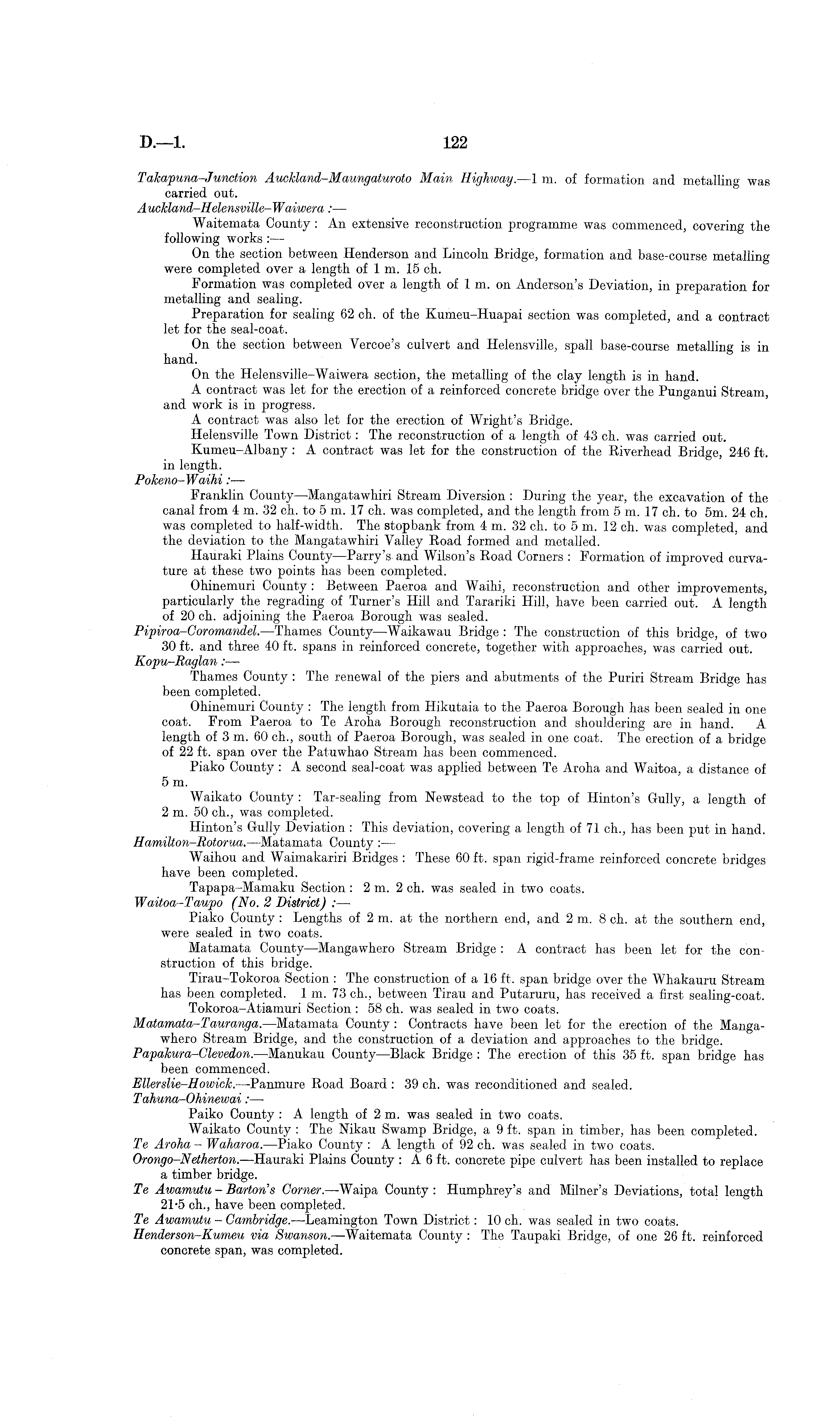 Takapuna-Junction AucMand-Maungaturoto Main Highway.—l m. of formation and metalling was carried out. Auckland-Helensville-Waiwera:—• Waitemata County : An extensive reconstruction programme was commenced, covering the following works :— On the section between Henderson and Lincoln Bridge, formation and base-course metalling were completed over a length of 1 m. 15 ch. Formation was completed over a length of 1 m. on Anderson's Deviation, in preparation for metalling and sealing. Preparation for sealing 62 ch. of the Kumeu-Huapai section was completed, and a contract let for the seal-coat. On the section between Yercoe's culvert and Helensville, spall base-course metalling is in hand. On the Helensville-Waiwera section, the metalling of the clay length is in hand. A contract was let for the erection of a reinforced concrete bridge over the Punganui Stream, and work is in progress. A contract was also let for the erection of Wright's Bridge. Helensville Town District: The reconstruction of a length of 43 ch. was carried out. Kumeu-Albany : A contract was let for the construction of the Riverhead Bridge, 246 ft. in length. Pokeno-Waihi:— Franklin County—Mangatawhiri Stream Diversion : During the year, the excavation of the canal from 4 m. 32 ch. to 5 m. 17 ch. was completed, and the length from 5 m. 17 ch. to sm. 24 ch. was completed to half-width. The stopbank from 4m. 32 ch. to sm. 12 ch. was completed, and the deviation to the Mangatawhiri Valley Road formed and metalled. Hauraki Plains County —Parry's- and Wilson's Road Corners : Formation of improved curvature at these two points has been completed. Ohinemuri County : Between Paeroa and Waihi, reconstruction and other improvements, particularly the regrading of Turner's Hill and Tarariki Hill, have been carried out. A length of 20 ch. adjoining the Paeroa Borough was sealed. Pipiroa-Coromandel.—Thames County—Waikawau Bridge : The construction of this bridge, of two 30 ft. and three 40 ft. spans in reinforced concrete, together with approaches, was carried out. Kopu-Raglan:— Thames County : The renewal of the piers and abutments of the Puriri Stream Bridge has been completed. Ohinemuri County : The length from Hikutaia to the Paeroa Borough has been sealed in one coat. From Paeroa to Te Aroha Borough reconstruction and shouldering are in hand. A length of 3m. 60 ch., south of Paeroa Borough, was sealed in one coat. The erection of a bridge of 22 ft. span over the Patuwhao Stream has been commenced. Piako County : A second seal-coat was applied between Te Aroha and Waitoa, a distance of 5 m. Waikato County : Tar-sealing from Newstead to the top of Hinton's Gully, a length of 2 m. 50 ch., was completed. Hinton's Gully Deviation : This deviation, covering a length of 71 ch., has been put in hand. Hamilton-Rotorua. —Matamata County : — Waihou and Waimakariri Bridges : These 60 ft. span rigid-frame reinforced concrete bridges have been completed. Tapapa-Mamaku Section: 2m. 2 ch. was sealed in two coats. Waitoa-Taupo (No. 2 District) :— Piako County : Lengths of 2m. at the northern end, and 2m. 8 ch. at the southern end, were sealed in two coats. Matamata County—Mangawhero Stream Bridge : A contract has been let for the construction of this bridge. Tirau-Tokoroa Section : The construction of a 16 ft. span bridge over the Whakauru Stream has been completed. Im. 73 ch., between Tirau and Putaruru, has received a first sealing-coat. Tokoroa-Atiamuri Section : 58 ch. was sealed in two coats. Matamata-Tauranga.—Matamata County : Contracts have been let for the erection of the Mangawhero Stream Bridge, and the construction of a deviation and approaches to the bridge. Papakura-Clevedon.—Manukau County —Black Bridge : The erection of this 35 ft. span bridge has been commenced. Ellerslie-Howick. —Panmure Road Board : 39 ch. was reconditioned and sealed. Tahuna-Ohinewai:—-Paiko County : A length of 2m. was sealed in two coats. Waikato County : The Nikau Swamp Bridge, a 9 ft. span in timber, has been completed. Te Aroha - Waharoa.—Piako County : A length of 92 ch. was sealed in two coats. Orongo-Netherton.—Hauraki Plains County : A 6 ft. concrete pipe culvert has been installed to replace a timber bridge. Te Awamutu-Barton's Corner.—Waipa County: Humphrey's and Milner's Deviations, total length 21-5 ch., have been completed. Te Awamutu - Cambridge.—Leamington Town District: 10 ch. was sealed in two coats. Henderson-Kumeu via Swanson. —Waitemata County : The Taupaki Bridge, of one 26 ft. reinforced concrete span, was completed.