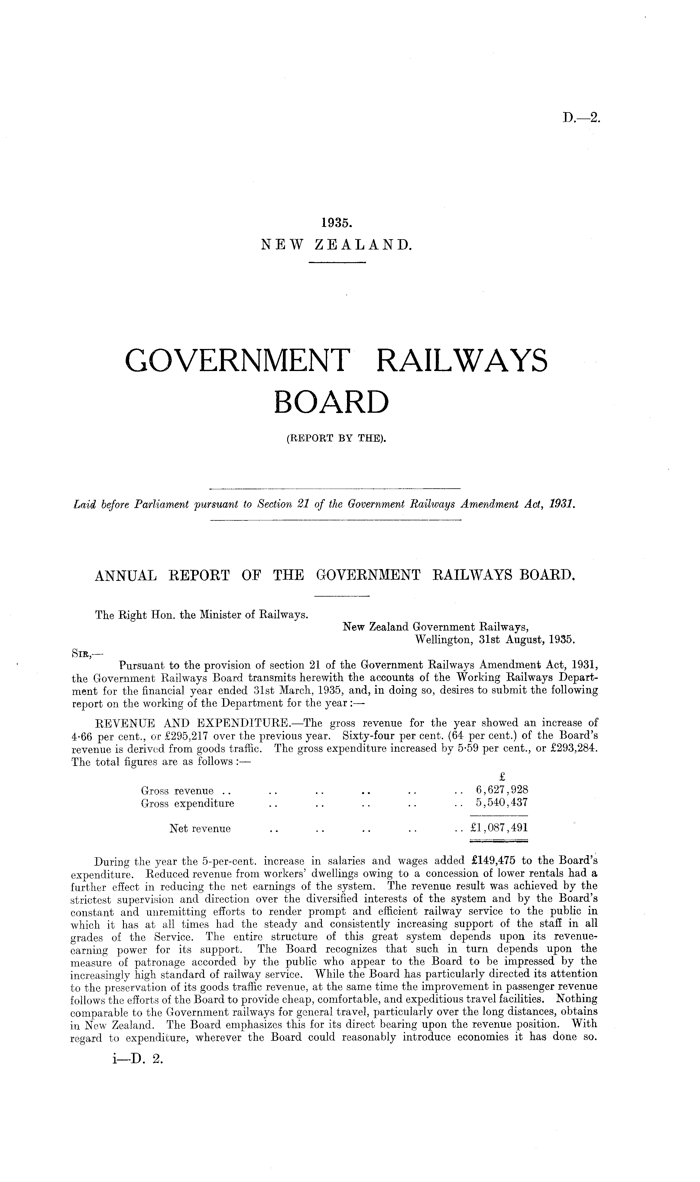 ANNUAL REPORT OF THE GOVERNMENT RAILWAYS BOARD. The Right Hon. the Minister of Railways. New Zealand Government Railways, Wellington, 31st August, 1935. Sir, — Pursuant to the provision of section 21 of the Government Railways Amendment Act, 1931, the Government Railways Board transmits herewith the accounts of the Working Railways Department for the financial year ended 31st March, 1935, and, in doing so, desires to submit the following report on the working of the Department for the year:—REVENUE AND EXPENDITURE. —The gross revenue for the year showed an increase of 4-66 per cent., or £295,217 over the previous year. Sixty-four per cent. (64 per cent.) of the Board's revenue is derived from goods traffic. The gross expenditure increased by 5-59 per cent., or £293,284. The total figures are as follows : — £ Gross revenue .. .. .. .. .. 6,627,928 Gross expenditure .. .. .. .. .. 5, 540, 437 Net revenue .. .. .. .. .. £1,087,491 During the year the 5-per-cent. increase in salaries and wages added £149,475 to the Board's expenditure. Reduced revenue from workers' dwellings owing to a concession of lower rentals had a further effect in reducing the net earnings of the system. The revenue result was achieved by the strictest supervision and direction over the diversified interests of the system and by the Board's constant and unremitting efforts to render prompt and efficient railway service to the public in which it has at all times had the steady and consistently increasing support of the staff in all grades of the Service. The entire structure of this great system depends upon its revenueearning power for its support. The Board recognizes that such in turn depends upon the measure of patronage accorded by the public who appear to the Board to be impressed by the increasingly high standard of railway service. While the Board has particularly directed its attention to the preservation of its goods traffic revenue, at the same time the improvement in passenger revenue follows the efforts of the Board to provide cheap, comfortable, and expeditious travel facilities. Nothing comparable to the Government railways for general travel, particularly over the long distances, obtains in New Zealand. The Board emphasizes this for its direct bearing upon the revenue position. With regard to expenditure, wherever the Board could reasonably introduce economies it has done so.