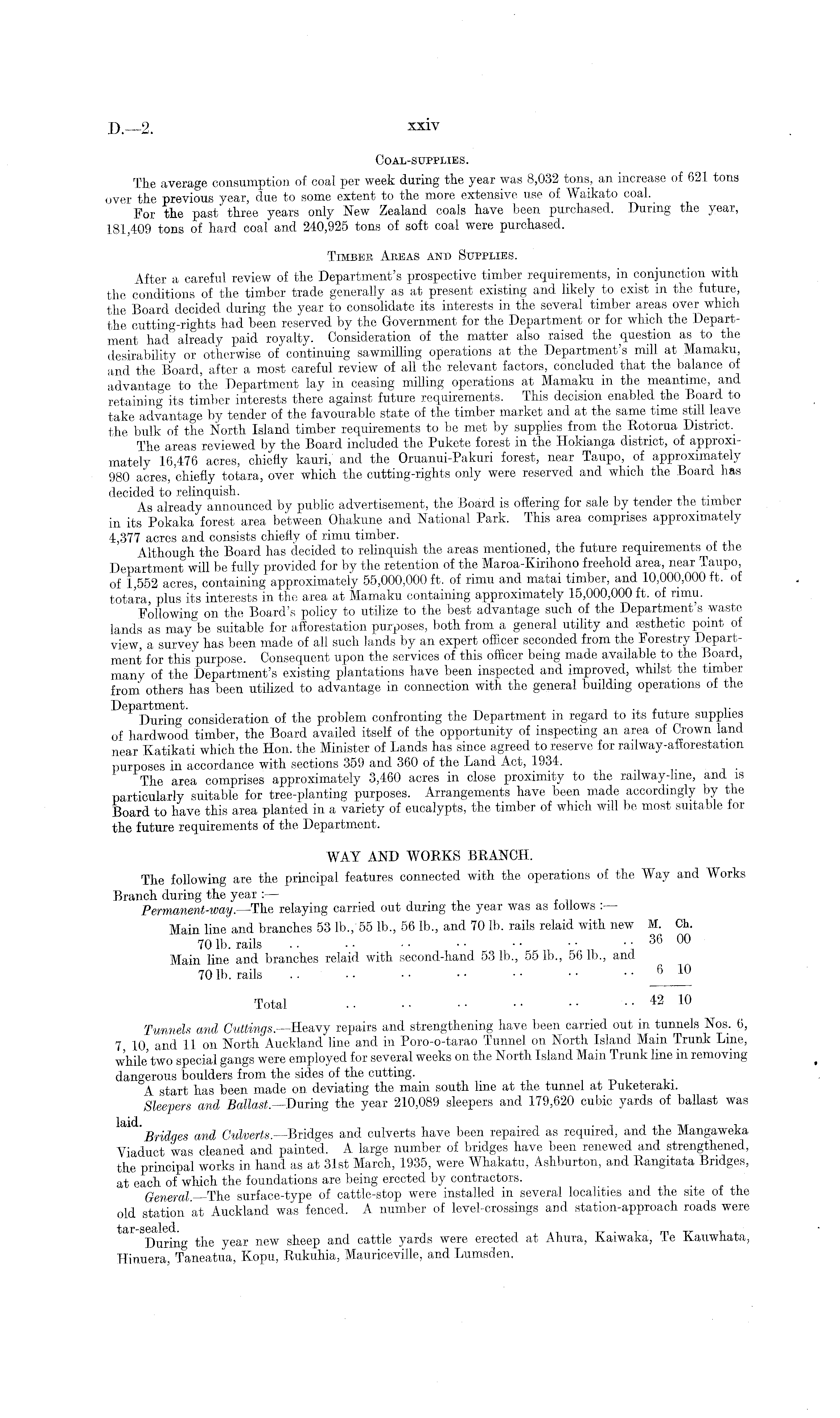 Coal-supplies. The average consumption of coal per week during the year was 8,032 tons, an increase of 621 tons over the previous year, clue to some extent to the more extensive use of Waikato coal. For the past three years only New Zealand coals have been purchased. During the year, 181,409 tons of hard coal and 240,925 tons of soft coal were purchased. Timber Ap.eas and Supplies. After a careful review of the Department's prospective timber requirements, in conjunction with the conditions of the timber trade generally as at present existing and likely to exist in the future, the Board decided during the year to consolidate its interests in the several timber areas over which the cutting-rights had been reserved by the Government for the Department or for which the Department had already paid royalty. Consideration of the matter also raised the question as to the desirability or otherwise of continuing sawmilling operations at the Department's mill at Mamaku, and the Board, after a most careful review of all the relevant factors, concluded that the balance of advantage to the Department lay in ceasing milling operations at Mamaku in the meantime, and retaining its timber interests there against future requirements. This decision enabled the Board to take advantage by tender of the favourable state of the timber market and at the same time still leave the bulk of the North Island timber requirements to be met by supplies from the Rotorua District. The areas reviewed by the Board included the Pukete forest in the Hokianga district, of approximately 16,476 acres, chiefly kauri, and the Oruanui-Pakuri forest, near Taupo, of approximately 980 acres, chiefly totara, over which the cutting-rights only were reserved and which the Board lias decided to relinquish. . As already announced by public advertisement, the Board is offering for sale by tender the timber in its Pokaka forest area between Ohakune and National Park. This area comprises approximately 4,377 acres and consists chiefly of rimu timber. Although the Board has decided to relinquish the areas mentioned, the future requirements of the Department will be fully provided for by the retention of the Maroa-Kirihono freehold area, near Taupo, of 1,552 acres, containing approximately 55,000,000 ft, of rimu and matai timber, and 10,000,000 ft. of totara, plus its interests in the area at Mamaku containing approximately 15,000,000 ft. of rimu. Following on the Board's policy to utilize to the best advantage such of the Department s waste lands as may be suitable for afforestation purposes, both from a general utility and aesthetic point of view, a survey has been made of all such lands by an expert officer seconded from the Forestry Department for this purpose. Consequent upon the services of this officer being made available to the Board, many of the Department's existing plantations have been inspected and improved, whilst the timber from others has been utilized to advantage in connection with the general building operations of the DeP^^ing' consideration 0 f the problem confronting the Department in regard to its future supplies of hardwood timber, the Board availed itself of the opportunity of inspecting an area of Crown land near Katikati which the Hon. the Minister of Lands has since agreed to reserve for railway-afforestation purposes in accordance with sections 359 and 360 of the Land Act, 1934. The area comprises approximately 3,460 acres in close proximity to the railway-line, and is particularly suitable for tree-planting purposes. Arrangements have been made accordingly by the Board to have this area planted in a variety of eucalypts, the timber of which will be most suitable tor the future requirements of the Department. WAY AND WORKS BRANCH. The following are the principal features connected with the operations of the Way and Works Branch during the year Permanent-way.—The relaying carried out during the year was as follows Main line and branches 53 lb., 55 lb., 56 lb., and 70 lb. rails relaid with new M. Ch. 70 lb. rails .. • - ■ • • ■ ■ • • • .. 36 00 Main line and branches relaid with second-hand 53 lb., 55 lb., 56 lb., and 70 lb. rails .. ■ • • • ■ • • • ■ • .. 6 10 Total 42 10 Tunnels and Cuttings— Heavy repairs and strengthening have been carried out in tunnels Nos. 6, 7 10 and 11 on North Auckland line and in Poro-o-tarao Tunnel on North Island Main Trunk Line, while two special gangs were employed for several weeks on the North Island Main Trunk line in removing dangerous boulders from the sides of the cutting. A start has been made on deviating the main south line at the tunnel at Puketeraki. Sleepers and Ballast,.—During the year 210,089 sleepers and 179,620 cubic yards of ballast was lMd 'Bridges and Culverts— Bridges and culverts have been repaired as required, and the Mangaweka Viaduct was cleaned and painted. A large number of bridges have been renewed and strengthened, the principal works in hand as at 31st March, 1935, were Whakatu, Ashburton, and Rangitata Bridges, at each of which the foundations are being erected by contractors. General. The surface-type of cattle-stop were installed in several localities and the site of the old station at Auckland was fenced. A number of level-crossings and station-approach roads were tār"S63il6(l During the year new sheep and cattle yards were , erected at Ahura, Kaiwaka, Te Kauwhata, Hinuera, Taneatua, Kopu, Rukuhia, Mauriceville, and Lumsden.
