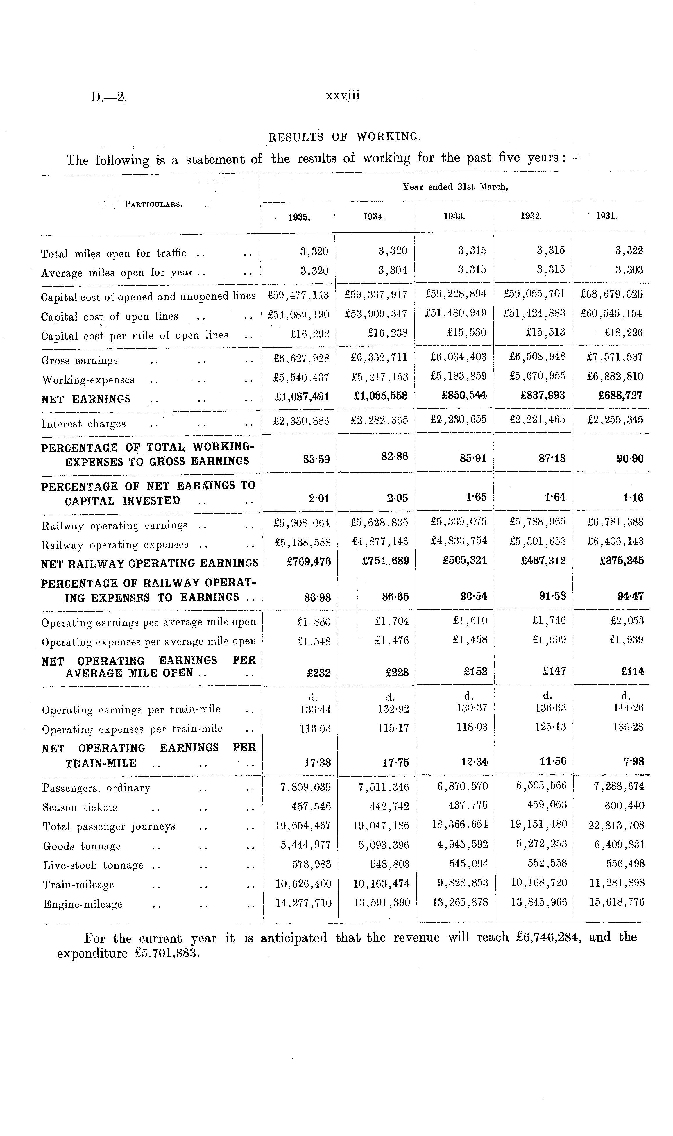 Year ended 31st. March, Particulars. , "j 1935. 1934. 1933. 1932. 1931. i j Total miles open for traffic .. .. 3,320 j 3,320 3,315 3,315 j 3,322 Average miles open for year .. .. 3,320 3,304 3,315 3.315 3,303 Capital cost of opened and unopened lines £59,477,143 £59,337,917 £59,228,894 £59,055,701 £68,679,025 Capital cost of open lines .. .. : £54,089,190 £53,909,347 £51,480,949 £51,424,883 £60,545,154 Capital cost per mile of open lines .. £16,292 £16,238 £15,530 £15,513 £18,226 " .. .. £6,627,928 £6,332,711 £6,034,403 £6,508,948 £7,571,537 Working-expenses .. .. •• £5,540,437 £5,247,153 £5,183,859 £5,670,955 £6,882,810 NET EARNINGS .. .. • • £1,087,491 £1,085,558 £850,544 £837,993 £688,727 ~7 ~ .. £2,330,886 £2,282,365 £2,230,655 £2,221,465 £2,255,345 PERCENTAGE OP TOTAL WORKINGEXPENSES TO GROSS EARNINGS 83 59 82 86 85-91 87*13 90-90 PERCENTAGE OF NET EARNINGS TO CAPITAL INVESTED .. .. 2 01 2-05 1*65 1-64 1-16 Railway operating earnings .. .. £5,908,064 £5,628,835 £5,339,075 £5,788,965 £6,781,388 Railway operating expenses .. .. £5,138,588 £4,877,146 £4,833,754 £5,301,653 £6,406,143 NET RAILWAY OPERATING EARNINGS £769,476 £751,689 £505,321 £487,312 £375,245 PERCENTAGE OF RAILWAY OPERATING EXPENSES TO EARNINGS .. 86 98 86-65 90-54 91-58 94-47 Operating earnings per average mile open £1,880 £1,704 £1,610 £1,746 £2,053 Operating expenses per average mile open £1,548 £1,476 £1,458 £1,599 £1,939 NET OPERATING EARNINGS PER AVERAGE MILE OPEN .. .. £232 £228 £152 £147 £114 d. d. d. d. d. Operating earnings per train-mile .. 133'44 132-92 130-37 136-63 14-4-26 Operating expenses per train-mile .. 116-06 115-17 118-03 125-13 136-28 NET OPERATING EARNINGS PER TRAIN-MILE .. .. .. 17-38 17-75 12-34 11-50 7*98 Passengers, ordinary .. .. 7,809,035 7,511,346 6,870,570 6,503,566 7,288,674 Season tickets .. .. .. 457,546 442,742 437,775 459,063 600,440 Total passenger journeys .. .. 19,654,467 19,047,186 18,366,654 19,151,480 22,813,708 Goods tonnage .. .. .. 5,444,977 5,093,396 4,945,592 5,272,253 6,409,831 Live-stock tonnage .. .. .. 578,983 548,803 545,094 552,558 556,498 Train-mileage .. .. .. 10,626,400 10,163,474 9,828,853 10,168,720 11,281,898 Engine-mileage .. .. .. 14,277,710 13,591,390 13,265,878 13,845,966 15,618,776