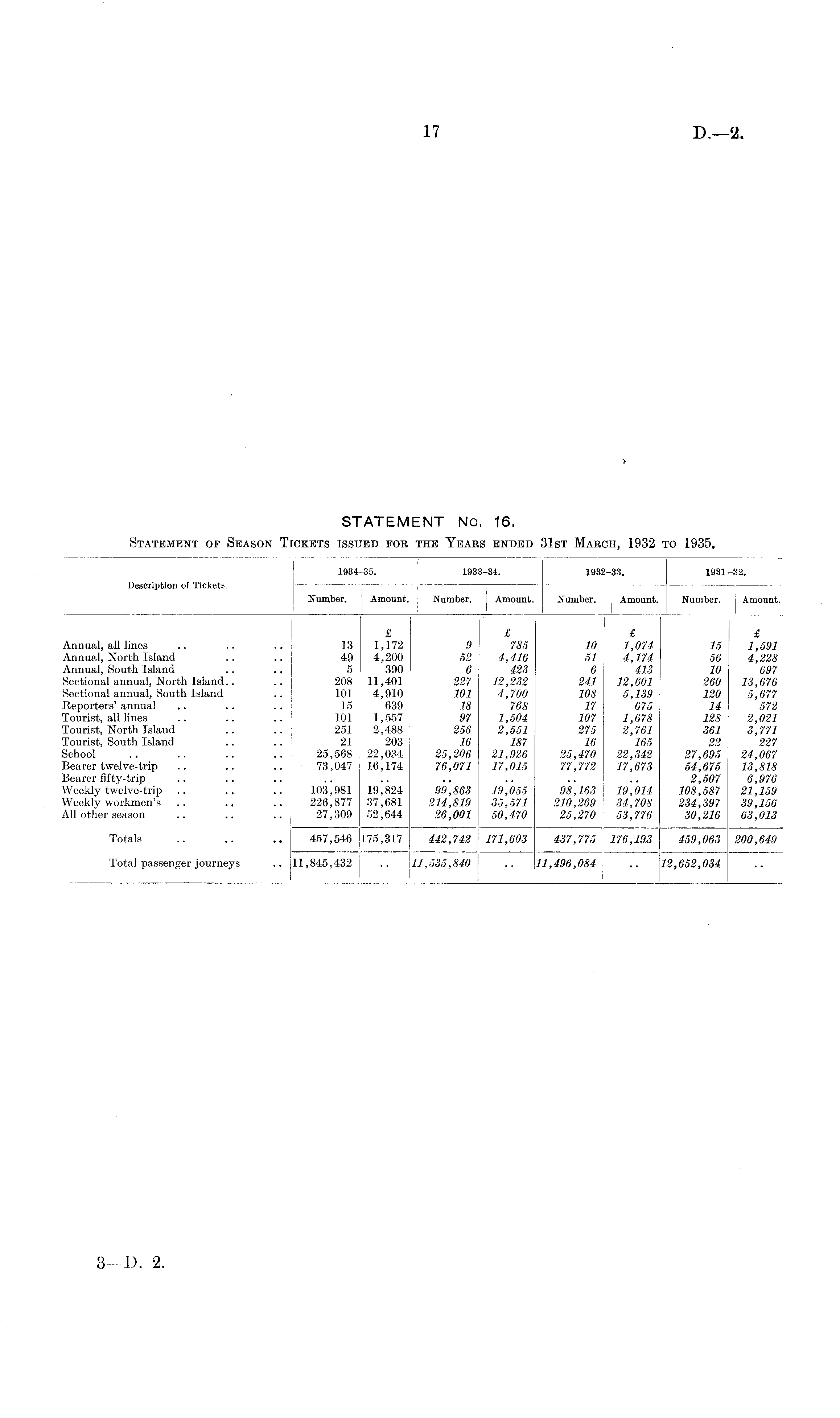 STATEMENT No. 16. Statement of Season Tickets issued for the Years ended 31st March, 1932 to 1935.