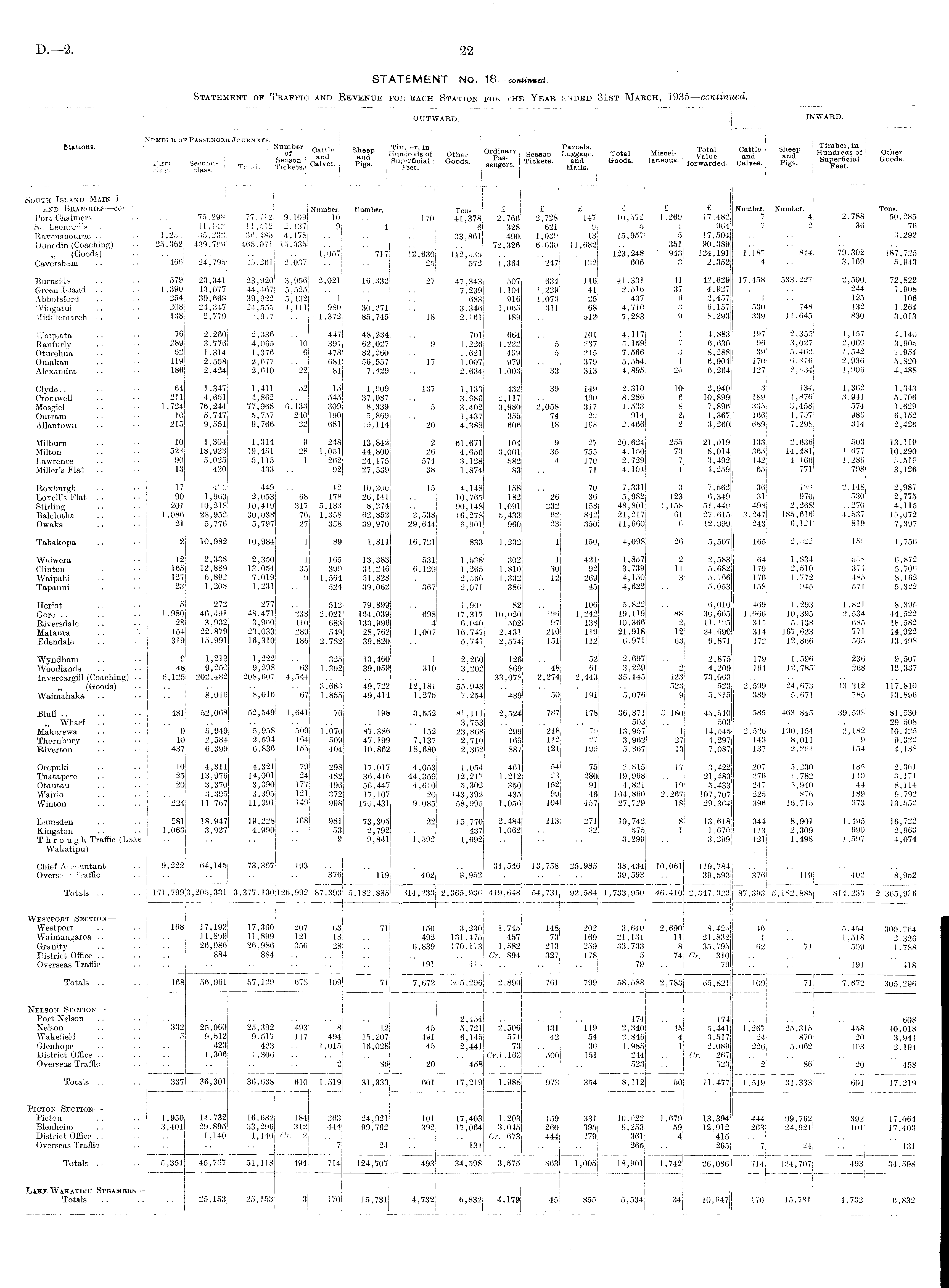 I OUTWABD. INWABD. . Number of Passenger Joubneyb. ! I 0118 ' - cattle Sheep Or« Sea , on | : Total Miecel . Total Cattle Sheep j *, other First. Second- | TotaJ> fg™ CaTvts. pTgl «cial J Goods. Tickets. Goods. ianeou, for^Jed . c^ves . Pig8 . Goods. citb&B. ci&sb. r . I j ; II l i~ South Island Main Lines AND BLANCHES —con d. Number. Number. Tons £ £ £ : £ £ € Number. Number. Tons. Port Chalmers .. 2,4s 75.29* 77.712 9,109 10 .. 170 41,378 2,766 2,728 147 10,572 1,269 17,482 7 4 2,788 50,285 St.. Leonard's .. .. I 27" 11,142 11,412 2,437 9 4 6 328 621 9 5 1 964 7 2 36 76 Ravensbourne .. •• 1,253 35,232 36,485 4,178 .. .. .. 33,861 490 1,039 13 15,957 5 17,504 .. .. .. 3,292 Dunedin (Coaching) •• 25,362 439,709 465,071 15,335 .. .. .. .. 72,326 6.030 11,682 .. 351 90,389 „ (Goods) •• .. .. .. .. 1,057 717 12,630 112,535 .. .. • - 123,248 ' 943 124,191 1,187 814 79,302 187,725 Caversham .. •• 466 24,795 25,261 2,037 .. .. 25 572 1,364 247 132 606 3 2,352 4 .. 3,169 5,943 Burnside .. 579 23,341 23,920 3,956 2,021 16,332 27 47,343 507 634 116 41,331 41 42,629 17,458 533,227 2,500 72,822 Green Island .. •• 1,390 43,077 44,467 5,525 .. .. .. 7,239 1,104 1,229 41 2,516 37 4,927 .. .. 244 7,908 Abbotsford .. .. 254 39,668 39,922 5,132 1 .. 683 916 1,073 25 437 6 2,457 1 125 106 Wingatui .. •• 208 24,347 24,555 1,111 980 30,271 .. 3,346 1,065 311 68 4,710 3 6,157 530 748 132 1,264 Middlemarch .. •• 138 2,779 2,917 .. 1,372 85,745 18 2,161 489 .. 512 7,283 9 8,293 339 11,645 830 3,013 Waipiata .. •• 76 2,260 2,336 .. 447 48,234 .. 701 664 .. 101 4,117 1 4,883 197 2,355 1,157 4,140 Ranfurly •• I 289 3,776 4,065 10 397 62,027 9 1,226 1,222 5 237 5,159 7| 6,630 96 3,027 2,060! 3,905 Oturehua .. 62 1,314 1,376 6 478 82,260 .. 1,621 499 5 215 7,566 3 8,288 39 5,462 1,542 2,954 Omakau •• 119 2,558 2,677 .. 681 56,557 17 1,007 979 .. 370 5,554 1 6,904 170 6,816 2,936 5,820 Alexandra .. •• 186 2,424 2,610 22 81 7,429 .. 2,634 1,003 33 313 4,895 20 6,264 127 2,834 1,906 4,488 j Clyde.. •• 64 1,347 1,411 52 15 1,909 137 1,133 432 39 149 2,310 10- 2,940 3 134 1,362 1,343 Cromwell •• •• 211 4,651 4,862 .. 545 37,087 .. 3,986 2,117 .. 490 8,286 6 10,899 189 1,876 3.941 5,706 Mosciel • • •• I 1,724 76,244 77,968 6,133 309 8,339 5 3,402 3,980 2,058 317 1,533 8 7,896 335 3,458 574 1,629 Outram •• 10 5,747 5,757 240 190 5,869 .. 1,437 355 74 22 914 2 1,367 166 1,707 986 6,152 Allantown . ■ 215 9,551 9,766 22 681 19,114 20 4,388 606 18 168 2,466 2 3,260 689 7,298 314 2,426 Milburn •• 10 1,304 1,314 9 248 13,842 2 61,671 104 9 27 20,624 255 21,019 133 2,636 503 13,119 Milton .. 528 18,923 19,451 28 1,051 44,800 26 4,656 3,001 35 755 4,150 73 8,014 365 14,481 1,677 10,290 Lawrence .. •• 90 5,025 5,115 1 262 24,175 574 3,128 582 4 170 2,729 7 3,492 142 4.166 1,286 5,519 Miller's Flat .. 13 420 433 .. 92 27,539 38 1,874 83 71 4,104 1 4,259 65 771 798 3,126 Roxburgh .. 17 432 449 .. 12 10,200 15 4,148 158 .. 70 7,331 3 7,562 36 189 2,148 2,987 Lovell's Flat .. 90 1,963 2,053 68 178 26,141 .. 10,765 182 26 36 5,982 123 6,349 31 970 530 2,775 Stirling .. •• 201 10,218 10,419 317 5,183 8.274 .. 90,148 1,091 232 158 48,801 1,158 51,440 498 2,268 1,270 4,115 Balclutha .. 1,086 28,952 30,0381 76 1,358 62,852 2,538 16,278 5,433 62 842 21,217 61 27,615 3,247 185,616 4,537 15,072 Owaka .. •• 21 5,776 5,797 27 358 39,970 29,644 6,901 960 23 350 11,660 6 12,999 243 6,121 819 7,397 Tahakopa .. 2 10,982 10,984 1 89 1,811 16,721 833 1,232 1 150 4,098 26 5,507 165 2,022 150 1,756 Waiwera •• 12 2,338 2,350 1 165 13,383 531 1,538 302 1 421 1,857 2 2,583 64 1,834 558! 6,872 Clinton .. •• 165 12,889 13,054 35 390 31,246 6,120 1,265 1,810 30 92 3,739 11 5.682 170 2,510 374 5,706 Waipahi .. 127 6,892 7,019 9 1,564 51,828 . 2,566 1,332 12 269 4,150 3 5,766 176 1,772 485 8,162 Tapanui .. 23 1,208 1,231 .. 524 39,062 367 2,071 386 .. 45 4,622 .. 5,053 158 945 571 5,322 Heriot .. •• 5 272 277 512 79,899 •• 1,901 82 .. 106 5,822 .. 6,010 469 1,293 1,821 8,395 Gore .. .. •• 1,980 46,491 48,471 238 2,021 164,039 698 17,317 10,020 196 1,242 19,119 88 30,665 1.066 10,395 2,534 44,522 Riversdale .. -• 28 3,932 3,960 110 683 133,990 4 6,040 502 97 138 10,366 2 11,105 315 5,138 685 18,582 Mataura .. 154 22,879 23,033 289 549 28,762 1,007 16,747 2,431 210 119 21,918 12 24,690 314 167,623 771 14,922 Edendale .. • 319 15,991 16,310 186 2,782 39,820 .. 5,741 2,574 151 112 6,971 63 9,871 472 12,866 505 13,498 Wyndham .. 9 1,213 1,222 .. 325 13,460 1 2,260 126 .. 52 2,697 .. 2,875 179 1,596 236 9,507 Woodlands .. 48 9,250 9,298 63 1,392 39,059 310 3,202 869 48 61 3,229 2 4,209 164 12,785 268 12,337 Invercargill (Coaching) .. 6,125 202,482 208,607 4,544 .. .. .. .. 33,078 2,274 2,443 35,145 123 73,063 (Goods) .. .. .. .. .. 3,683 49,722 12,181 55,943 .. .. . .. 523 523 2,599 24,673 13,312 117,810 Waimahaka .. •• •• 8,016 8,016 67 1,855 49,414 1,275 7.254 489 50 191 5,076 9 5,815 389 5,671 785 13,896 Bluff.. •• •• 481 52,068 52,549 1,641 76 198 3,552 81,111 2,524 787 178 36,871 5,180 45,540 585 463,845 39,598 81,530 „ Wharf •• •• .. •• •• .. •• 3,753 .. •• •• 503 503 . . . . 29,508 Makarewa .. •• 9 5,949 5,958 509 1,070 87,386 152 23,868 299 218 70 13,957 1 14,545 2,526 190,154 2,182 10,425 Thornbury .. 10 2,584 2,594 164 509 47,199 7,137 2,710 169 112 27 3,962 27 4,297 143 8,011 9 9,322 Riverton .. •• 437 6,399 6,836 155 404 10,862 18,680 2,362 887 121 199 5,867 13 7,087 137 2,264 154 4,188 Orepuki .. •• 10 4,311 4,321 79 298 17,017 4,053 1,054 461 54 75 2,815 17 3,422 207 5,230 185 2,361 Tuatapere .. 25 13.976 14,001 24 482 36,416 44,359 12,217 1,212 23 280 19,968 .. 21,483 276 1,782 110 3,171 Otautau .. ■■ 20 3,370 3,390 177 496 56,447 4,610 5,302 350 152 91 4,821 19 5,433 247 5,940 44 8,114 Wairio .. .. .. 3,395 3,395 121 372 17,107 20 143,392 435 99 46 104,860 2,267 10