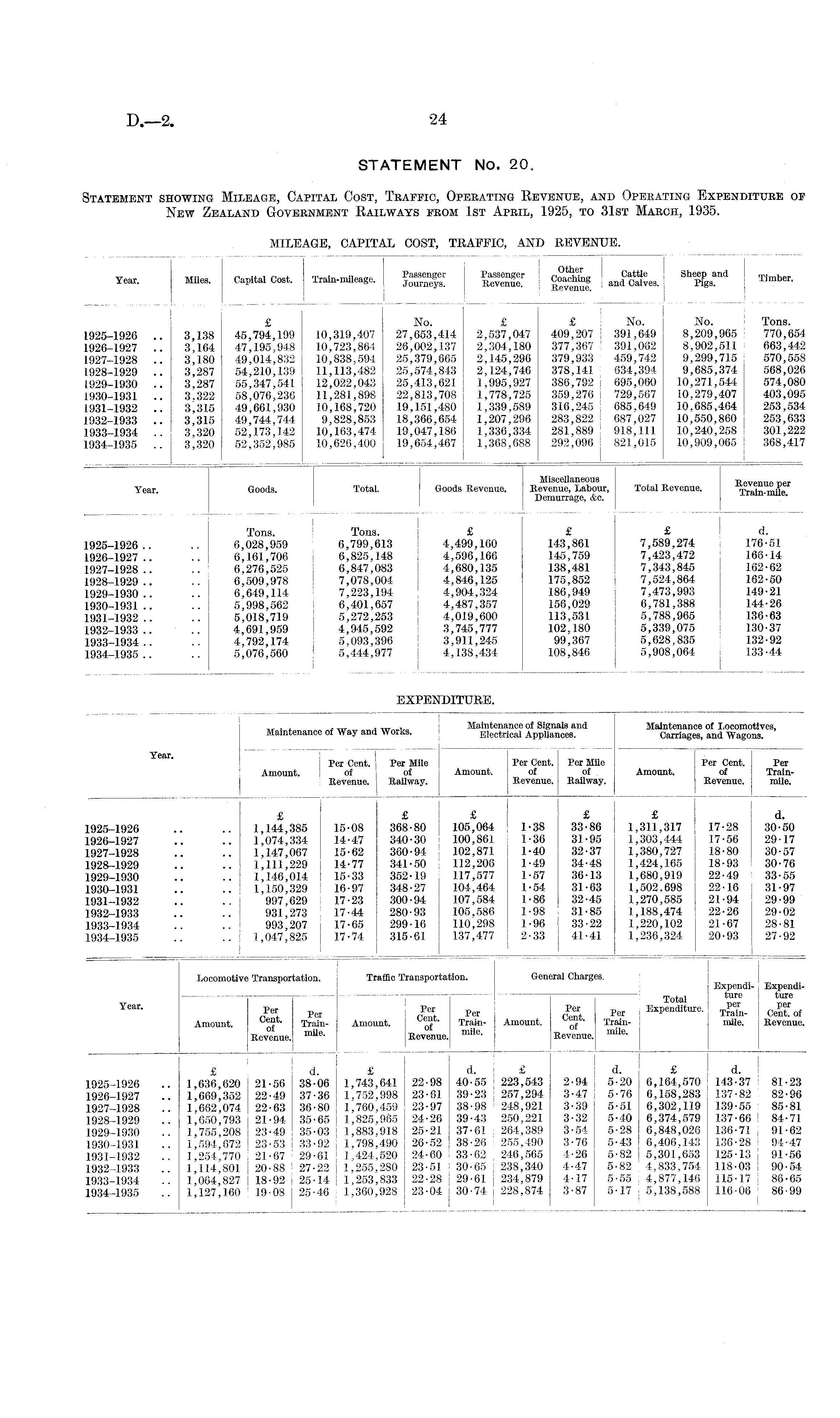 STATEMENT No. 20. Statement showing Mileage, Capital Cost, Traffic, Operating Revenue, and Operating Expenditure of New Zealand Government Railways from 1st April, 1925, to 31st March, 1935. MILEAGE, CAPITAL COST, TRAFFIC, AND REVENUE.