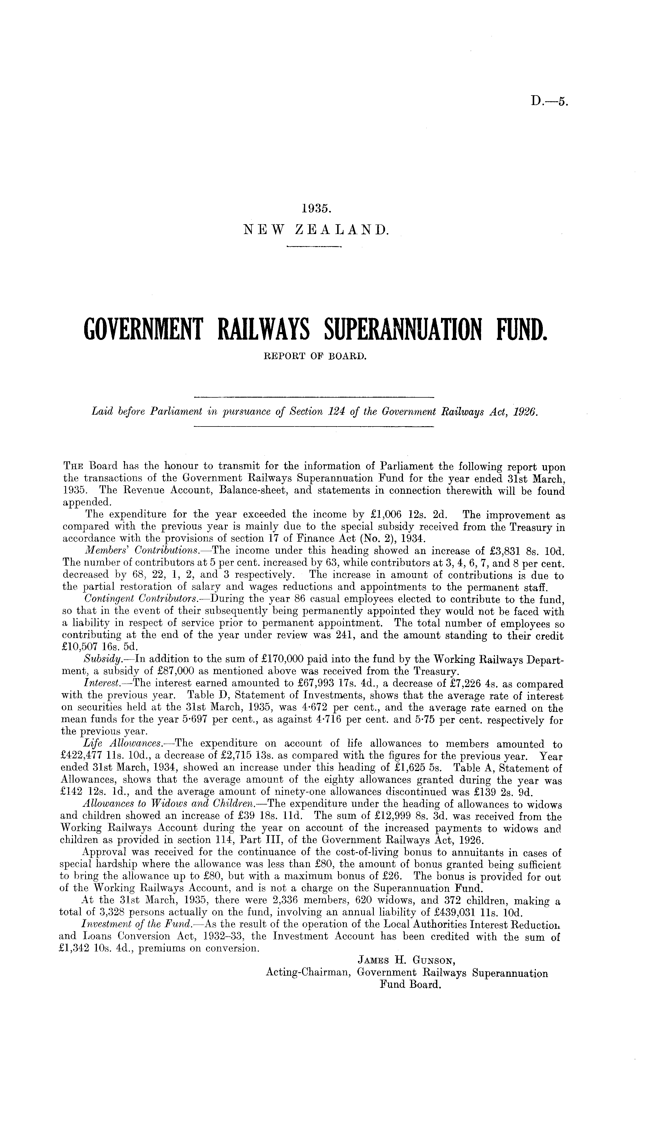The Board has the honour to transmit for the information of Parliament the following report upon the transactions of the Government Railways Superannuation Fund for the year ended 31st March, 1935. The Revenue Account, Balance-sheet, and statements in connection therewith will be found appended. The expenditure for the year exceeded the income by £1,006 12s. 2d. The improvement as compared with the previous year is mainly due to the special subsidy received from the Treasury in accordance with the provisions of section 17 of Finance Act (No. 2), 1934. Members' Contributions. —The income under this heading showed an increase of £3,831 Bs. 10d. The number of contributors at 5 per cent, increased by 63, while contributors at 3, 4, 6, 7, and 8 per cent, decreased by 68, 22, 1, 2, and 3 respectively. The increase in amount of contributions is due to the partial restoration of salary and wages reductions and appointments to the permanent staff. Contingent Contributors. —During the year 86 casual employees elected to contribute to the fund, so that in the event of their subsequently being permanently appointed they would not be faced with a liability in respect of service prior to permanent appointment. The total number of employees so contributing at the end of the year under review was 241, and the amount standing to their credit £10,507 16s. sd. Subsidy. —ln addition to the sum of £170,000 paid into the fund by the Working Railways Department, a subsidy of £87,000 as mentioned above was received from the Treasury. Interest. —The interest earned amounted to £67,993 17s. 4d., a decrease of £7,226 4s. as compared with the previous year. Table D, Statement of Investments, shows that the average rate of interest on securities held at the 31st March, 1935, was 4-672 per cent., and the average rate earned on the mean funds for the year 5-697 per cent., as against 4-716 per cent, and 5-75 per cent, respectively for the previous year. Life Allowances. —The expenditure on account of life allowances to members amounted to £422,477 11s. 10d., a decrease of £2,715 13s. as compared with the figures for the previous year. Year ended 31st March, 1934, showed an increase under this heading of £1,625 ss. Table A, Statement of Allowances, shows that the average amount of the eighty allowances granted during the year was £142 12s. Id., and the average amount of ninety-one allowances discontinued was £139 2s. 9d. Allowances to Widows and Children. —The expenditure under the heading of allowances to widows and children showed an increase of £39 18s. lid. The sum of £12,999 Bs. 3d. was received from the Working Railways Account during the year on account of the increased payments to widows and children as provided in section 114, Part 111, of the Government Railways Act, 1926. Approval was received for the continuance of the cost-of-living bonus to annuitants in cases of special hardship where the allowance was less than £80, the amount of bonus granted being sufficient to bring the allowance up to £80, but with a maximum bonus of £26. The bonus is provided for out of the Working Railways Account, and is not a charge on the Superannuation Fund. At the 31st March, 1935, there were 2,336 members, 620 widows, and 372 children, making a total of 3,328 persons actually on the fund, involving an annual liability of £439,031 11s. 10d. Investment of the Fund. —As the result of the operation of the Local Authorities Interest Reduction and Loans Conversion Act, 1932-33, the Investment Account has been credited with the sum of £1,342 10s. 4d., premiums on conversion. Jambs H. Gunson, Acting-Chairman, Government Railways Superannuation Fund Board.
