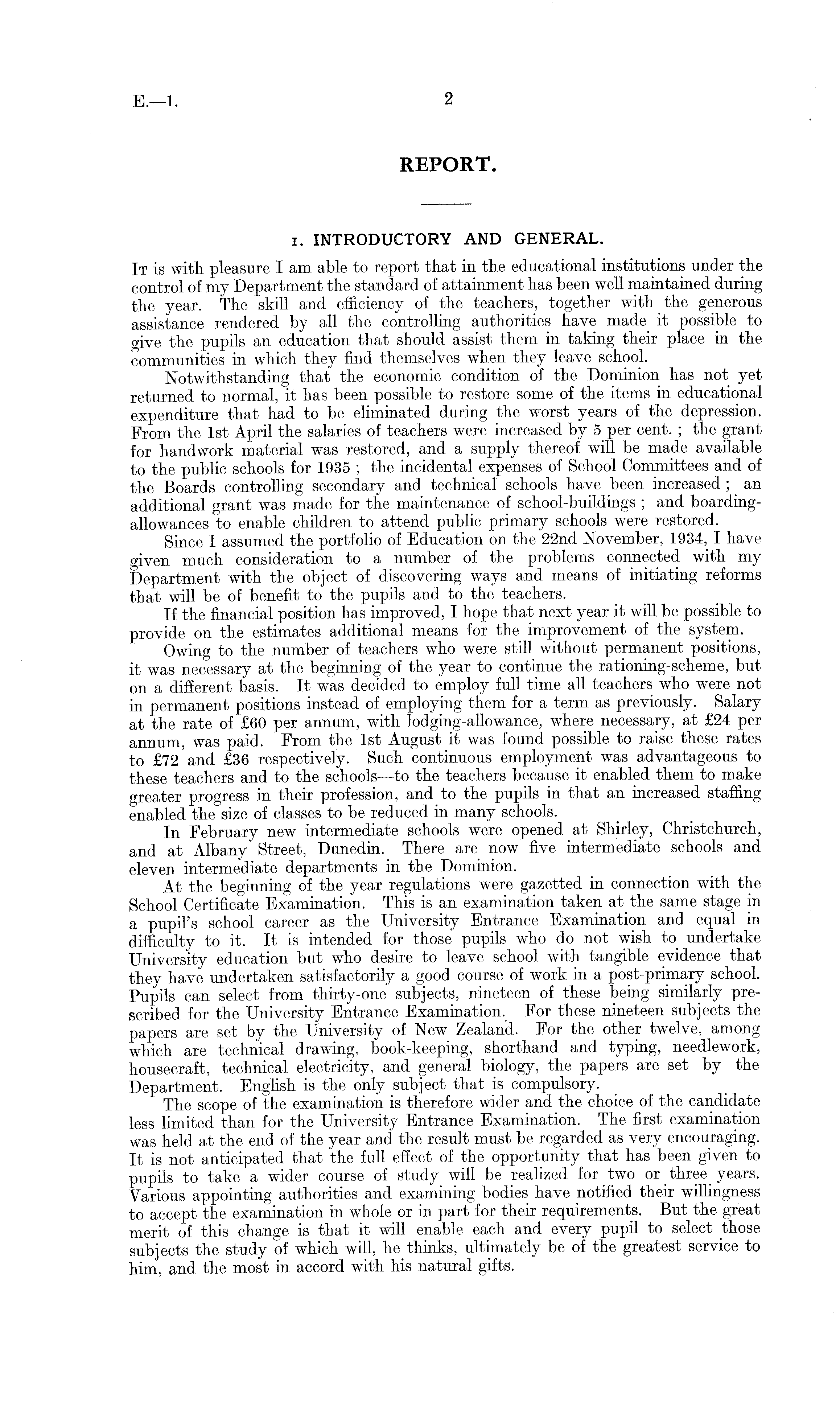 i. INTRODUCTORY AND GENERAL. It is with pleasure I am able to report that in the educational institutions under the control of my Department the standard of attainment has been well maintained during the year. The skill and efficiency of the teachers, together with the generous assistance rendered by all the controlling authorities have made it possible to give the pupils an education that should assist them in taking their place in the communities in which they find themselves when they leave school. Notwithstanding that the economic condition of the Dominion has not yet returned to normal, it has been possible to restore some of the items in educational expenditure that had to be eliminated during the worst years of the depression. From the Ist April the salaries of teachers were increased by 5 per cent. ; the grant for handwork material was restored, and a supply thereof will be made available to the public schools for 1935 ; the incidental expenses of School Committees and of the Boards controlling secondary and technical schools have been increased ; an additional grant was made for the maintenance of school-buildings ; and boardingallowances to enable children to attend public primary schools were restored. Since I assumed the portfolio of Education on the 22nd November, 1934, I have given much consideration to a number of the problems connected with my Department with the object of discovering ways and means of initiating reforms that will be of benefit to the pupils and to the teachers. If the financial position has improved, I hope that next year it will be possible to provide on the estimates additional means for the improvement of the system. Owing to the number of teachers who were still without permanent positions, it was necessary at the beginning of the year to continue the rationing-scheme, but on a different basis. It was decided to employ full time all teachers who were not in permanent positions instead of employing them for a term as previously. Salary at the rate of £60 per annum, with lodging-allowance, where necessary, at £24 per annum, was paid. From the Ist August it was found possible to raise these rates to £72 and £36 respectively. Such continuous employment was advantageous to these teachers and to the schools —to the teachers because it enabled them to make greater progress in their profession, and to the pupils in that an increased staffing enabled the size of classes to be reduced in many schools. In February new intermediate schools were opened at Shirley, Christchurch, and at Albany Street, Dunedin. There are now five intermediate schools and eleven intermediate departments in the Dominion. At the beginning of the year regulations were gazetted in connection with the School Certificate Examination. This is an examination taken at the same stage in a pupil's school career as the University Entrance Examination and equal in difficulty to it. It is intended for those pupils who do not wish to undertake University education but who desire to leave school with tangible evidence that they have undertaken satisfactorily a good course of work in a post-primary school. Pupils can select from thirty-one subjects, nineteen of these being similarly prescribed for the University Entrance Examination. For these nineteen subjects the papers are set by the University of New Zealand. For the other twelve, among which are technical drawing, book-keeping, shorthand and typing, needlework, housecraft, technical electricity, and general biology, the papers are set by the Department. English is the only subject that is compulsory. The scope of the examination is therefore wider and the choice of the candidate less limited than for the University Entrance Examination. The first examination was held at the end of the year and the result must be regarded as very encouraging. It is not anticipated that the full effect of the opportunity that has been given to pupils to take a wider course of study will be realized for two or three _ years. Various appointing authorities and examining bodies have notified their willingness to accept the examination in whole or in part for their requirements. But the great merit of this change is that it will enable each and every pupil to select those subjects the study of which will, he thinks, ultimately be of the greatest service to him, and the most in accord with his natural gifts.