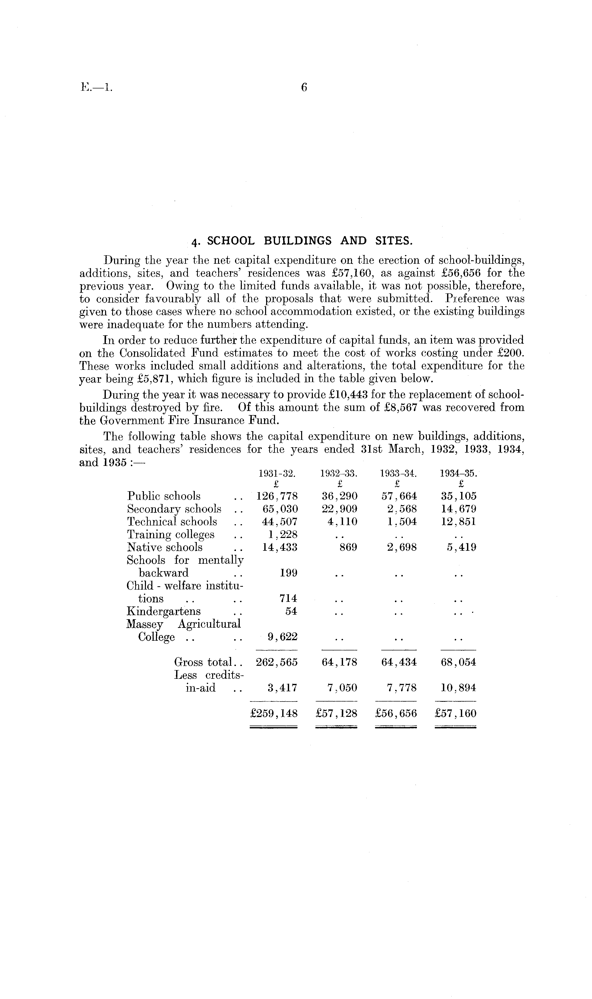 4. SCHOOL BUILDINGS AND SITES. During the year the net capital expenditure on the erection of school-buildings, additions, sites, and teachers' residences was £57,160, as against £56,656 for the previous year. Owing to the limited funds available, it was not possible, therefore, to consider favourably all of the proposals that were submitted. Pieference was given to those cases where no school accommodation existed, or the existing buildings were inadequate for the numbers attending. In order to reduce further the expenditure of capital funds, an item was provided on the Consolidated Fund estimates to meet the cost of works costing under £200. These works included small additions and alterations, the total expenditure for the year being £5,871, which figure is included in the table given below. During the year it was necessary to provide £10,443 for the replacement of schoolbuildings destroyed by fire. Of this amount the sum of £8,567 was recovered from the Government Fire Insurance Fund. The following table shows the capital expenditure on new buildings, additions, sites, and teachers' residences for the years ended 31st March, 1932, 1933, 1934, and 1935 1931-32. 1932-33. 1933-34. 1934-35. £ £ £ £ Public schools .. 126,778 36,290 57,664 35,105 Secondary schools .. 65,030 22,909 2,568 14,679 Technical schools .. 44,507 4,110 1,504 12,851 Training colleges . . 1,228 Native schools .. 14,433 869 2,698 5,419 Schools for mentally backward . . 199 Child - welfare institutions . . .. 714 Kindergartens . . 54 . . . . .. ■ Massey Agricultural College .. .. 9,622 Gross total.. 262,565 64,178 64,434 68,054 Less credits-in-aid .. 3,417 7,050 7,778 10,894 £259,148 £57,128 £56,656 £57,160