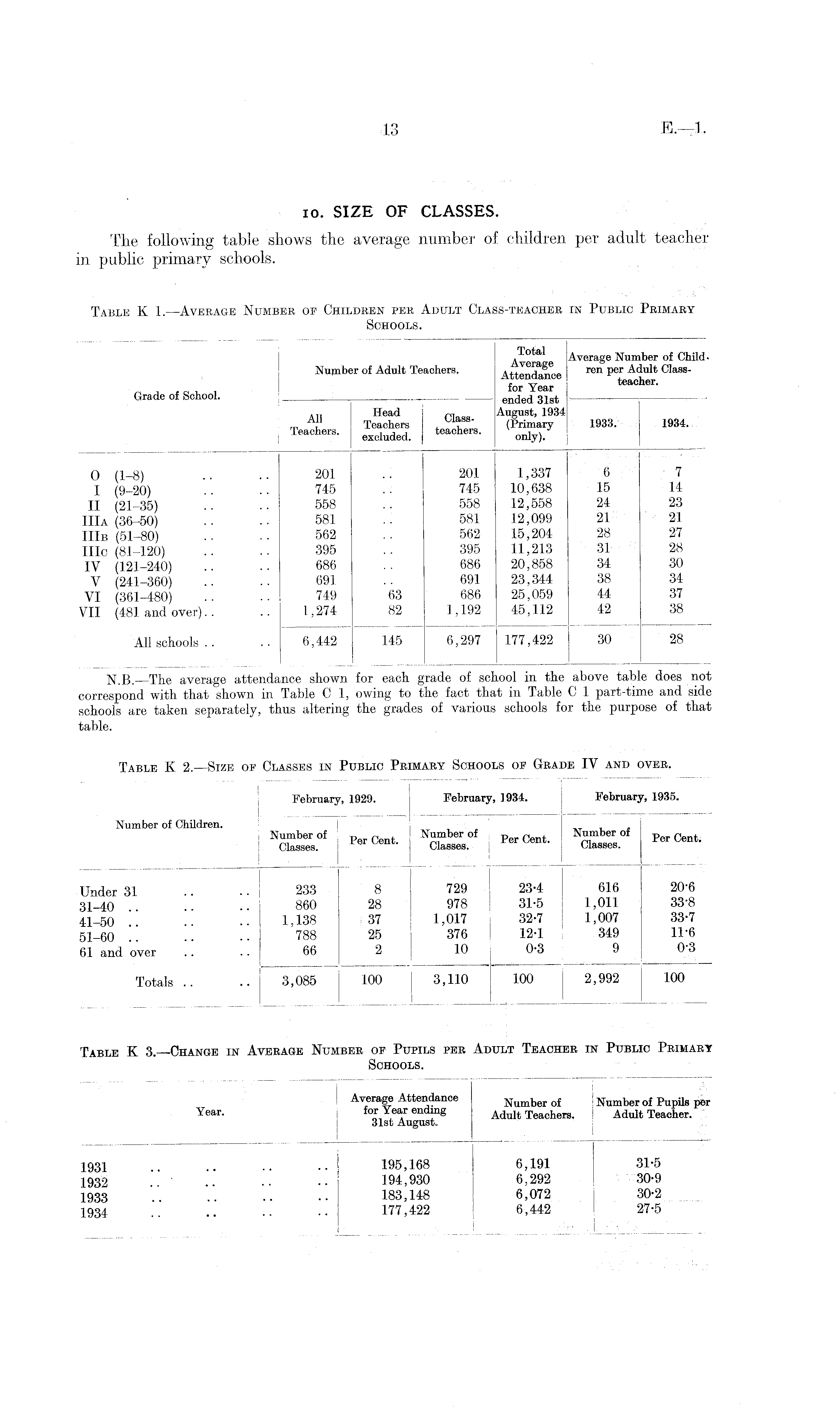 Table K2.—Size of Classes in Public Primary Schools of Grade IV and over.